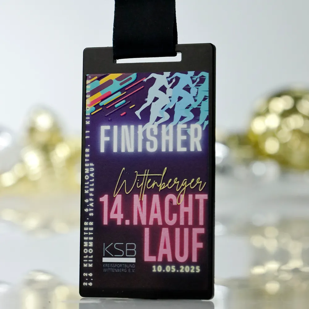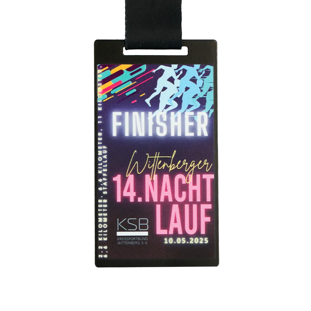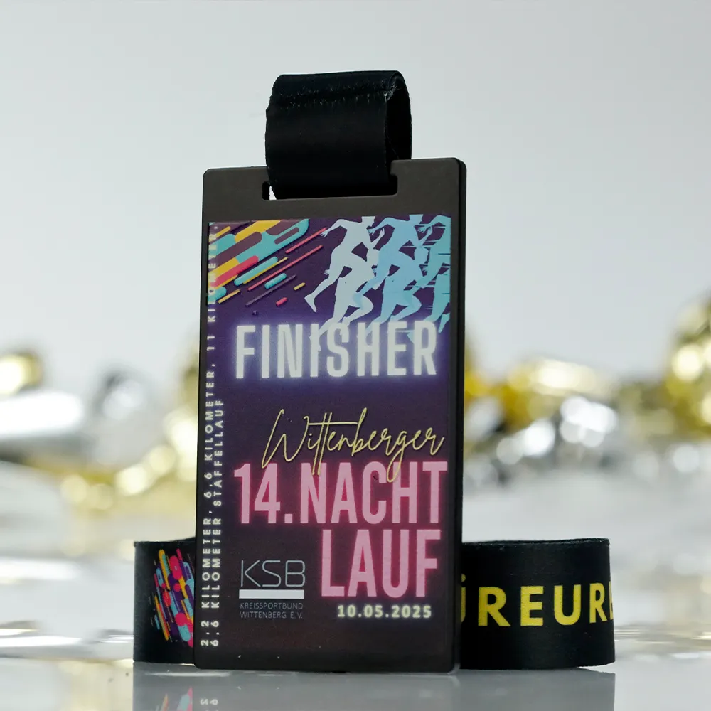 Medaglia in acciaio realizzata per la 14ª Wittenberger Nachtlauf. La forma è stata tagliata al laser e l'intera grafica è stata applicata utilizzando la stampa UV. La parte anteriore include l'iscrizione "Finisher", una composizione colorata con sagome di corridori e dettagli della gara. Il design presenta anche il logo dell'organizzatore e le distanze di gara. Questa medaglia personalizzata è stata creata appositamente per la corsa notturna a Wittenberg.