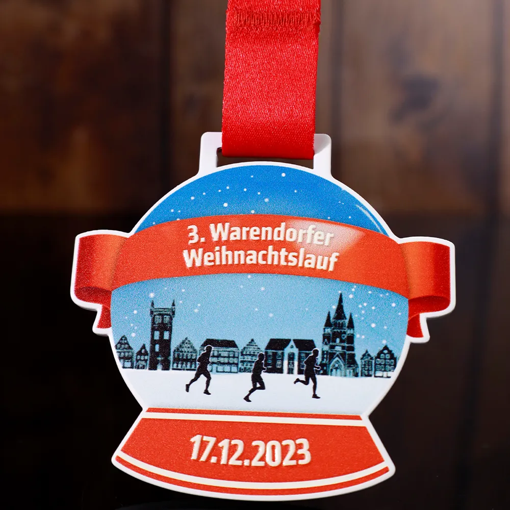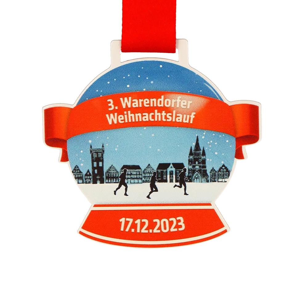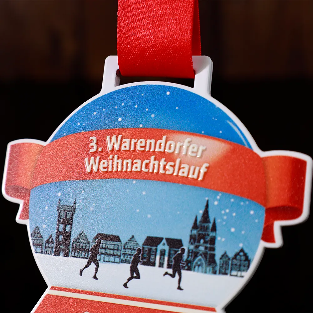 Medaglia da corsa personalizzata creata per il 3° Warendorfer Weihnachtslauf. Questa medaglia presenta una stampa a colori UV che raffigura una scena di corsa invernale. Il nome dell'evento è evidenziato in stampa in rilievo.