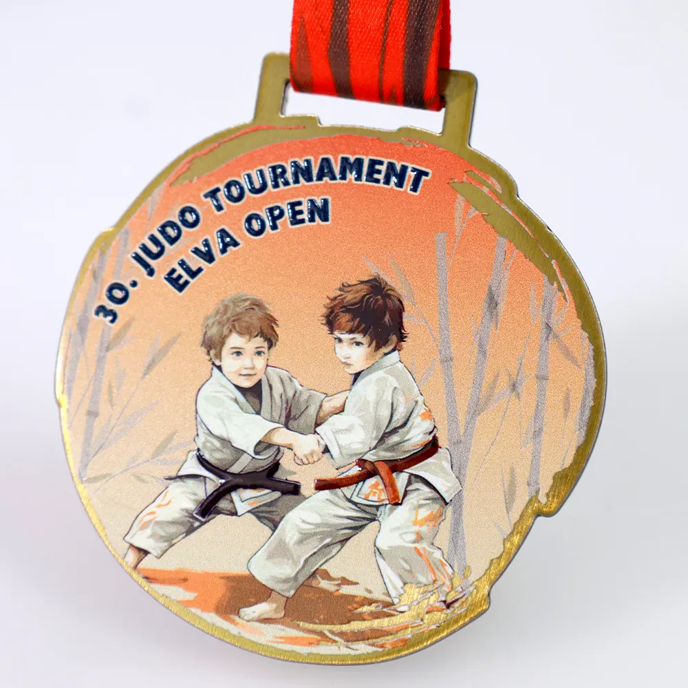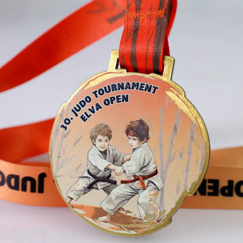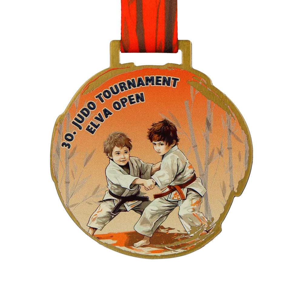 Presentiamo una medaglia personalizzata creata specificamente per il 30° Torneo di Judo Elva Open. La parte anteriore della medaglia presenta un'immagine colorata di due giovani judoka che combattono, catturando perfettamente lo spirito e l'energia del torneo.