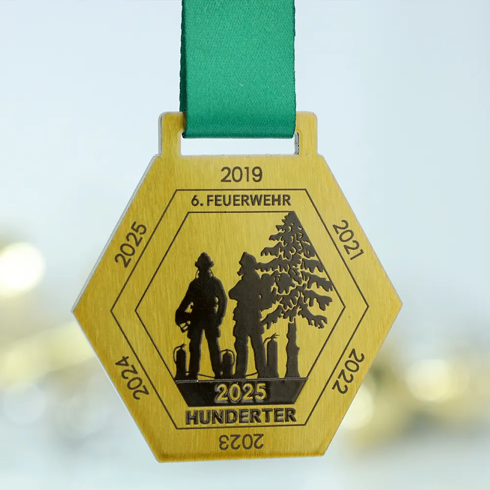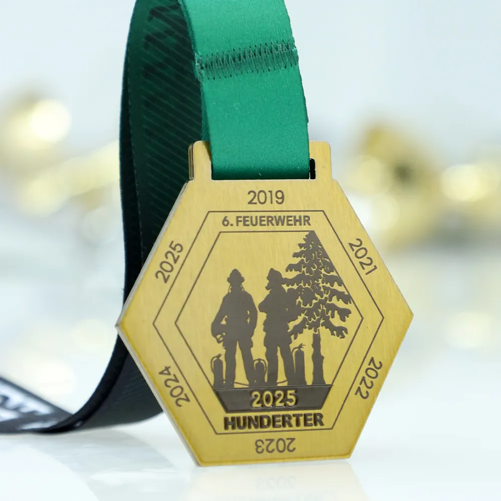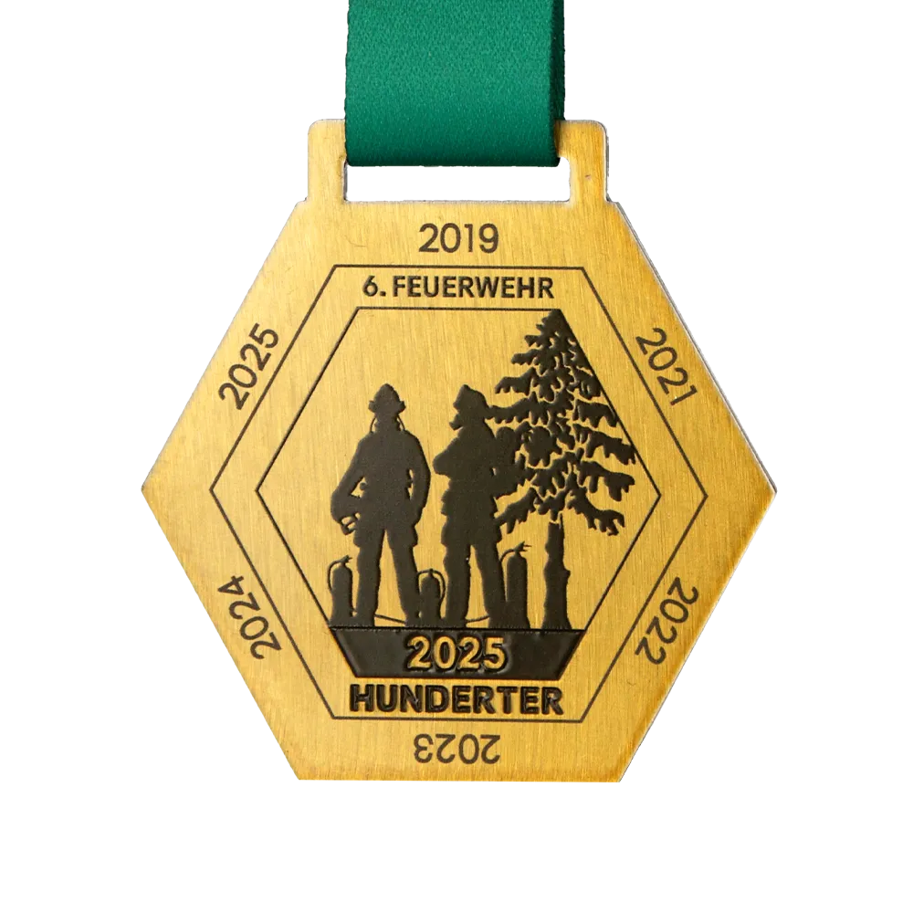 Questa elegante medaglia personalizzata per la 6. Feuerwehr-Hunderter combina perfettamente il raffinato colore dorato dell'acciaio con una forma geometrica moderna. La grafica nitida realizzata con stampa UV durevole raffigura i vigili del fuoco circondati dalla natura, conferendo all'insieme un carattere professionale e tematico.