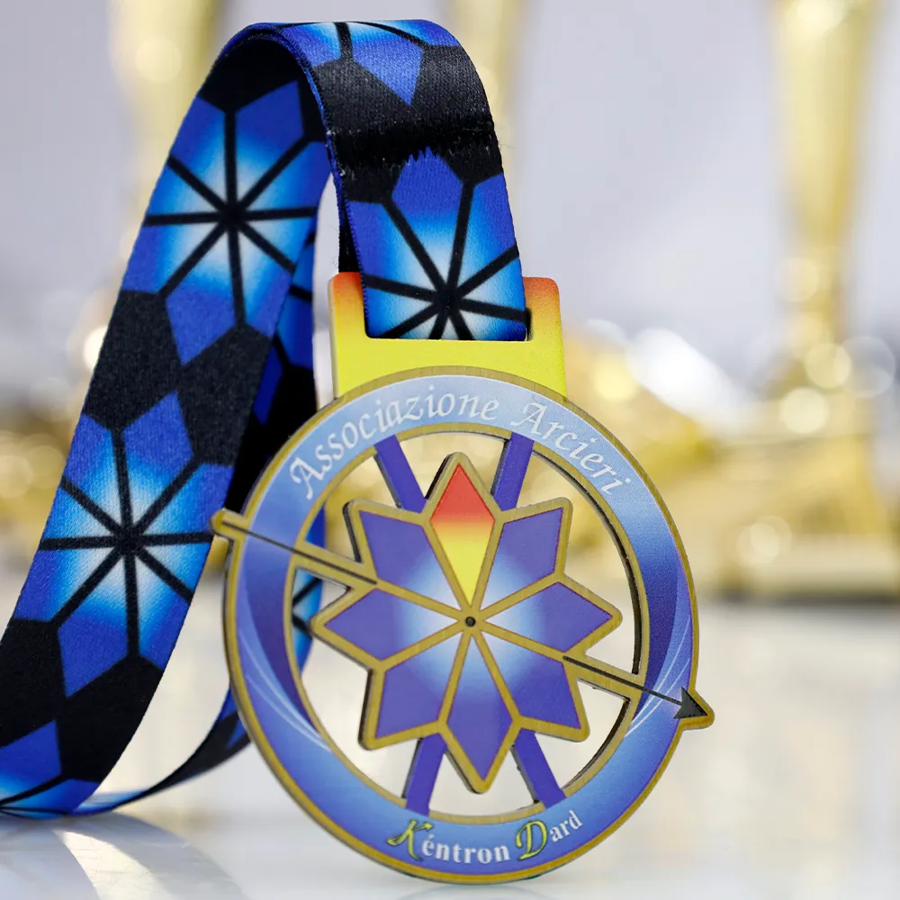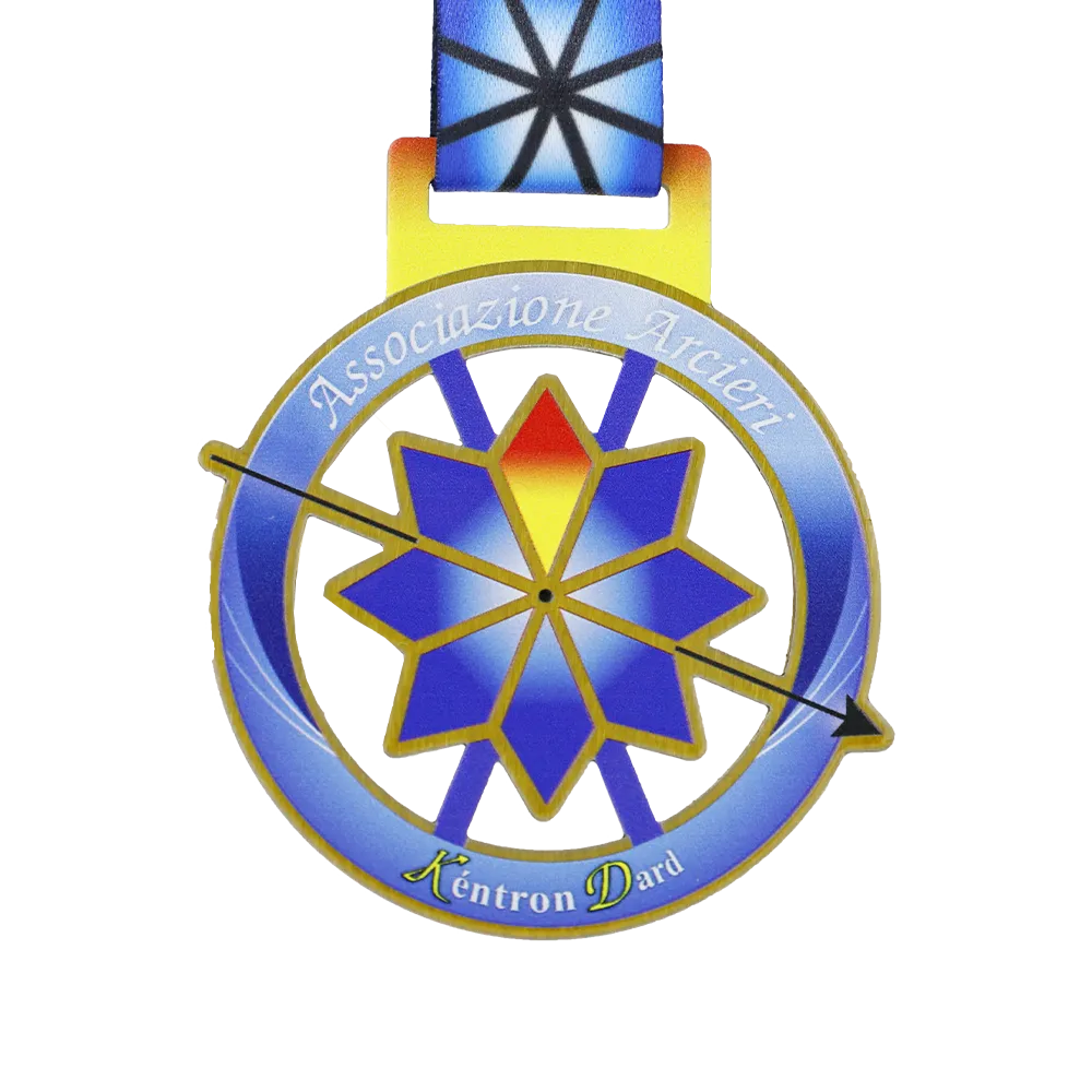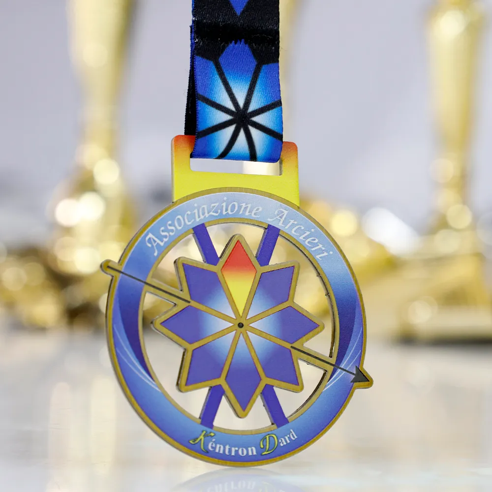 Medaglia in metallo dedicata alle competizioni di tiro con l'arco organizzate dall'Associazione Arcieri. La grafica presenta un simbolo di bersaglio e freccia nelle tonalità di blu, oro e rosso, realizzato con stampa UV. Personalizzata con il nome del club e l'evento. È incluso un nastro colorato stilisticamente abbinato alla medaglia.