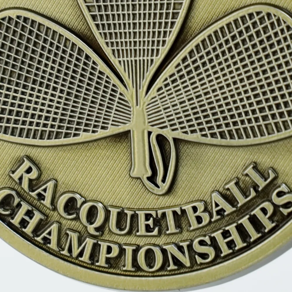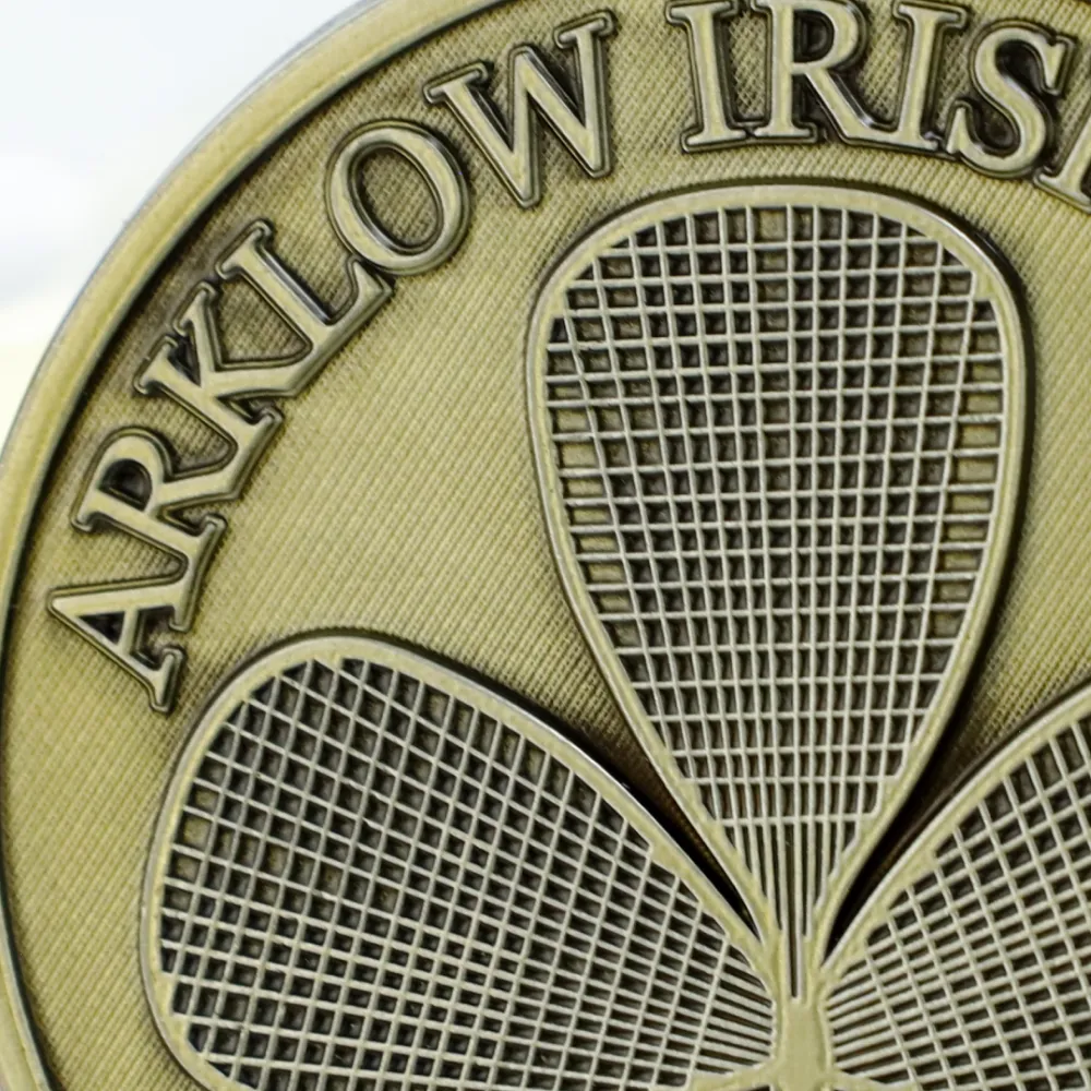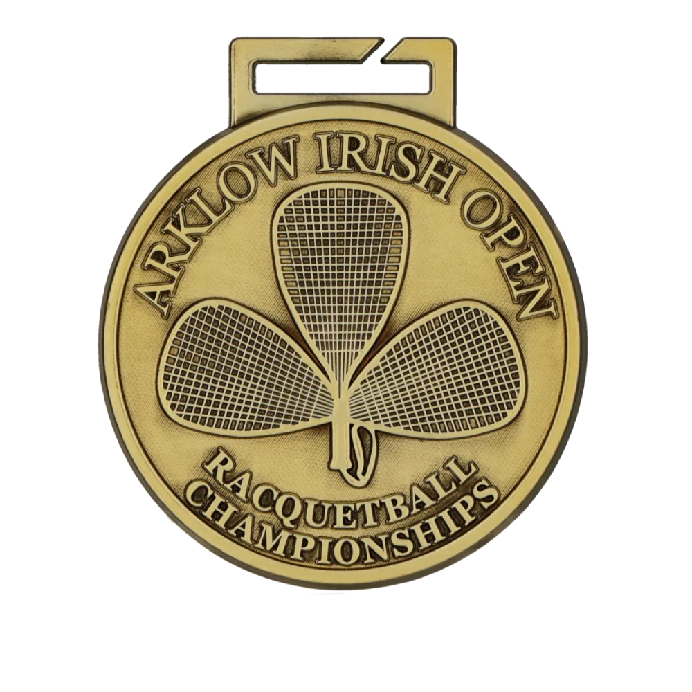 Medaglie sportive su misura create per gli Arklow Irish Open Racquetball Championships. Realizzate in metallo color oro, caratterizzate da un motivo a trifoglio formato da racchette da racquetball come elemento centrale. Le iscrizioni sono fusa con precisione sulla superficie, conferendo alle medaglie su misura un aspetto elegante e distintivo.