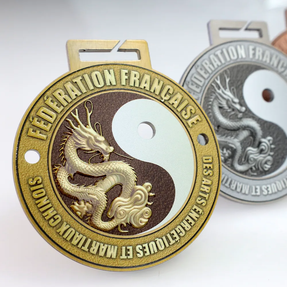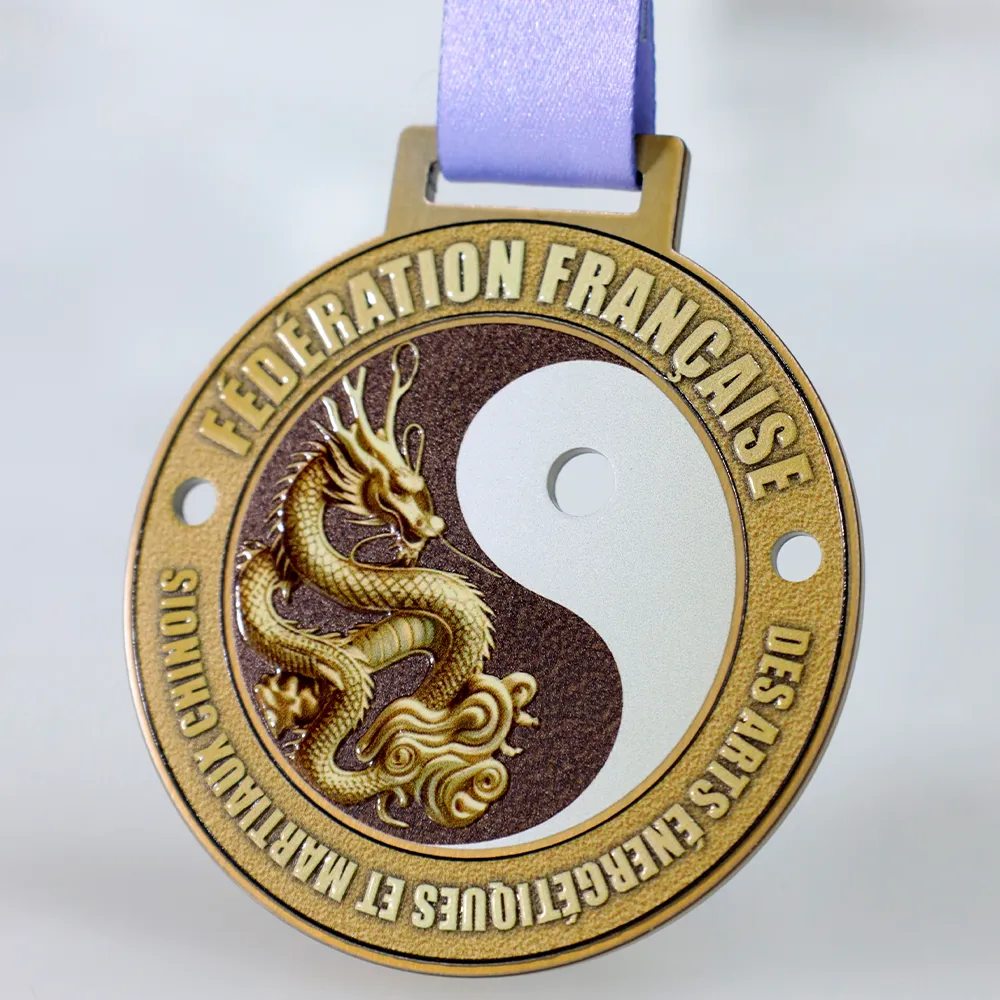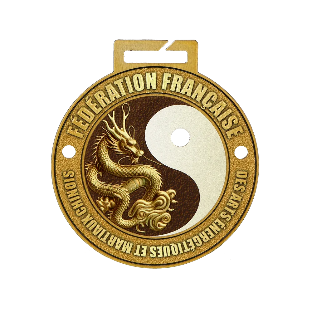 Una medaglia karate per i partecipanti al torneo organizzato dalla Fédération Française des Arts Energétiques et Martiaux Chinois. Questa è una medaglia in acciaio che presenta un'immagine di un drago e il simbolo yin-yang. I dettagli sono realizzati con precisione, conferendo alla medaglia un aspetto eccezionale.