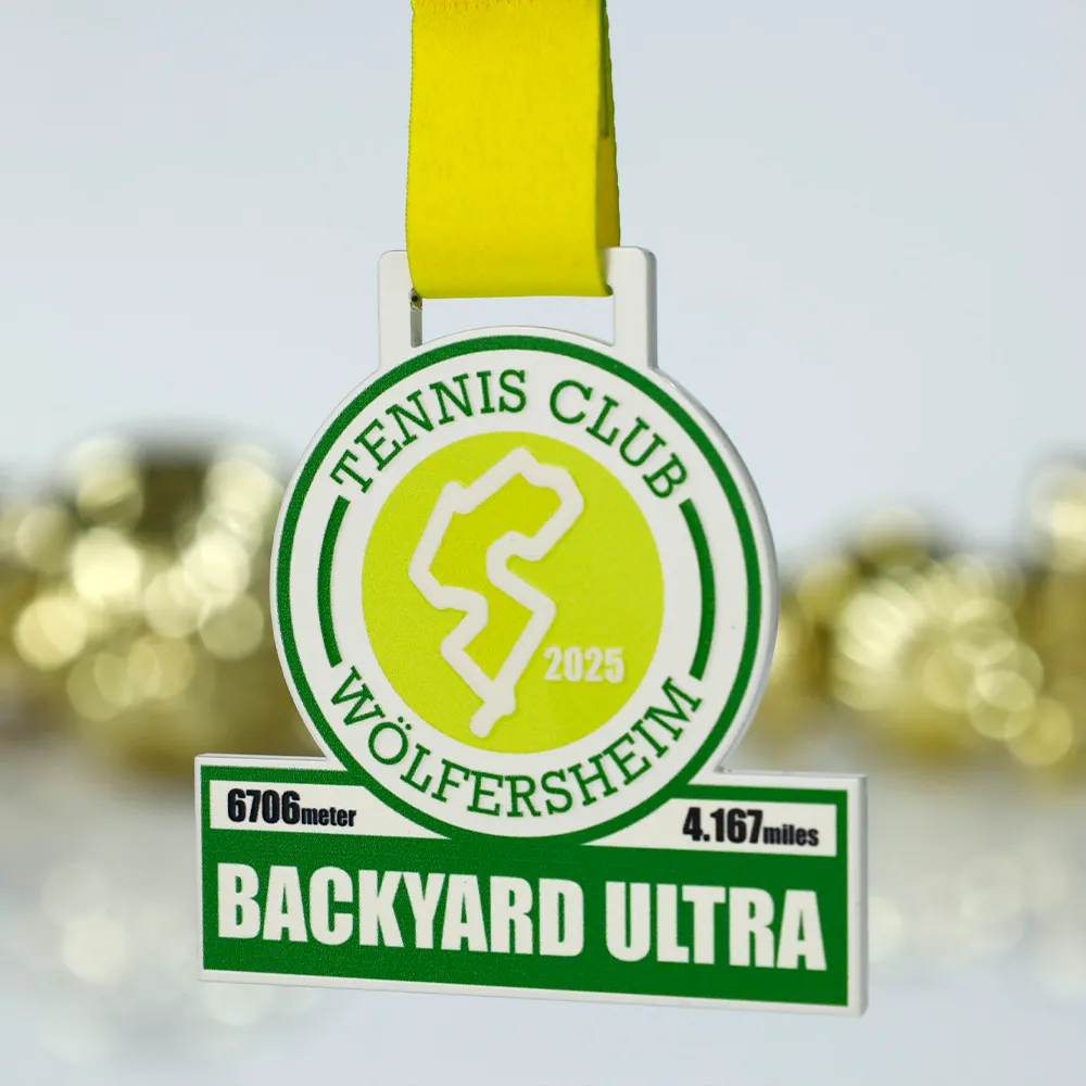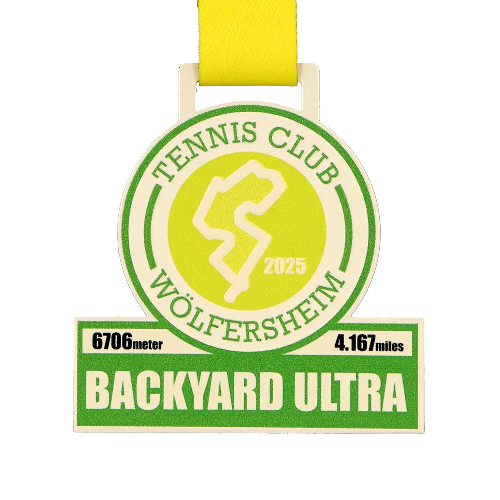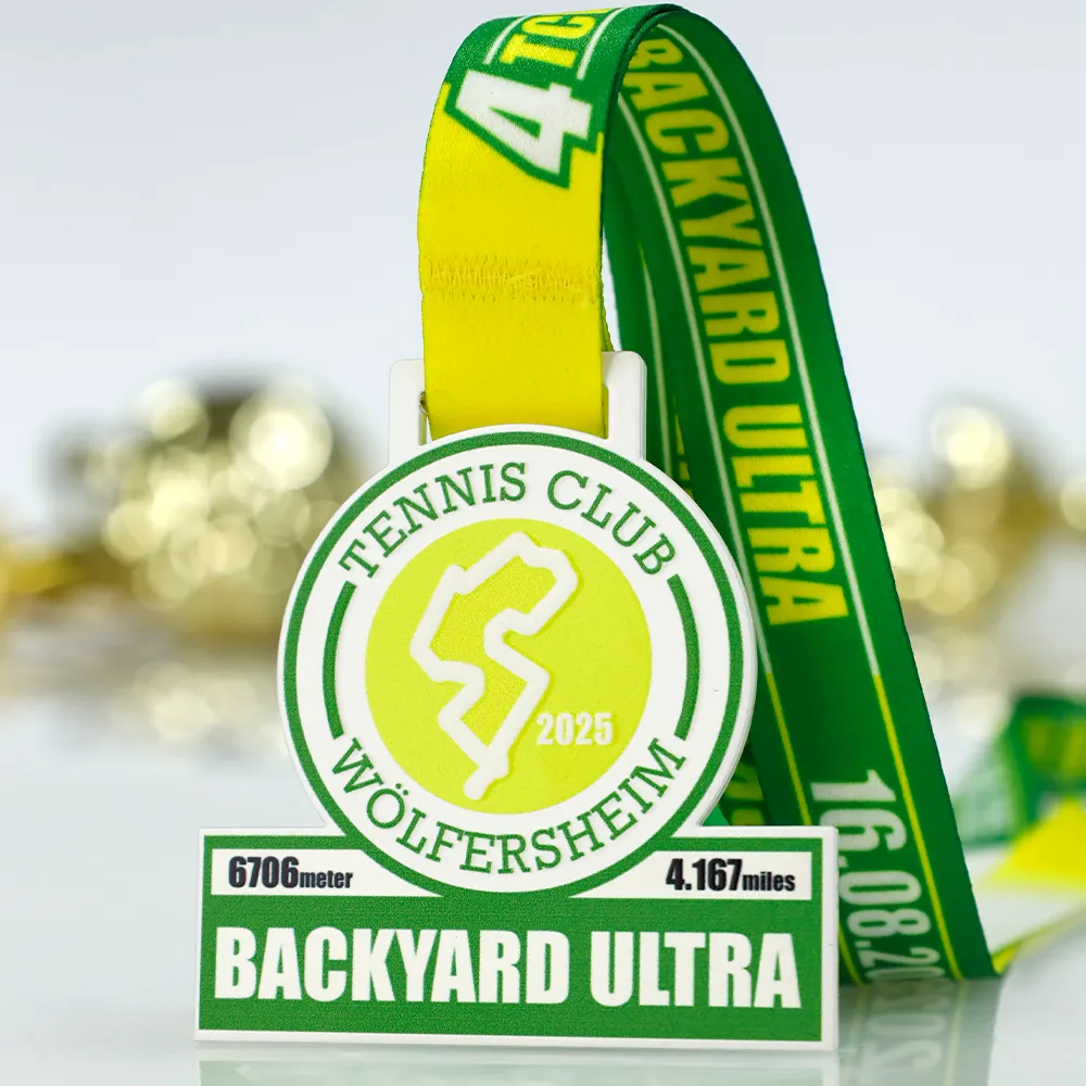 Medaglia su misura creata per i partecipanti alla corsa Backyard Ultra organizzata dal Tennis Club Wölfersheim nel 2025. La medaglia si distingue per uno schema di colori verde e giallo, una mappa del percorso stampata e scritte audaci. Una pratica medaglia per gli appassionati di ultramaratona.