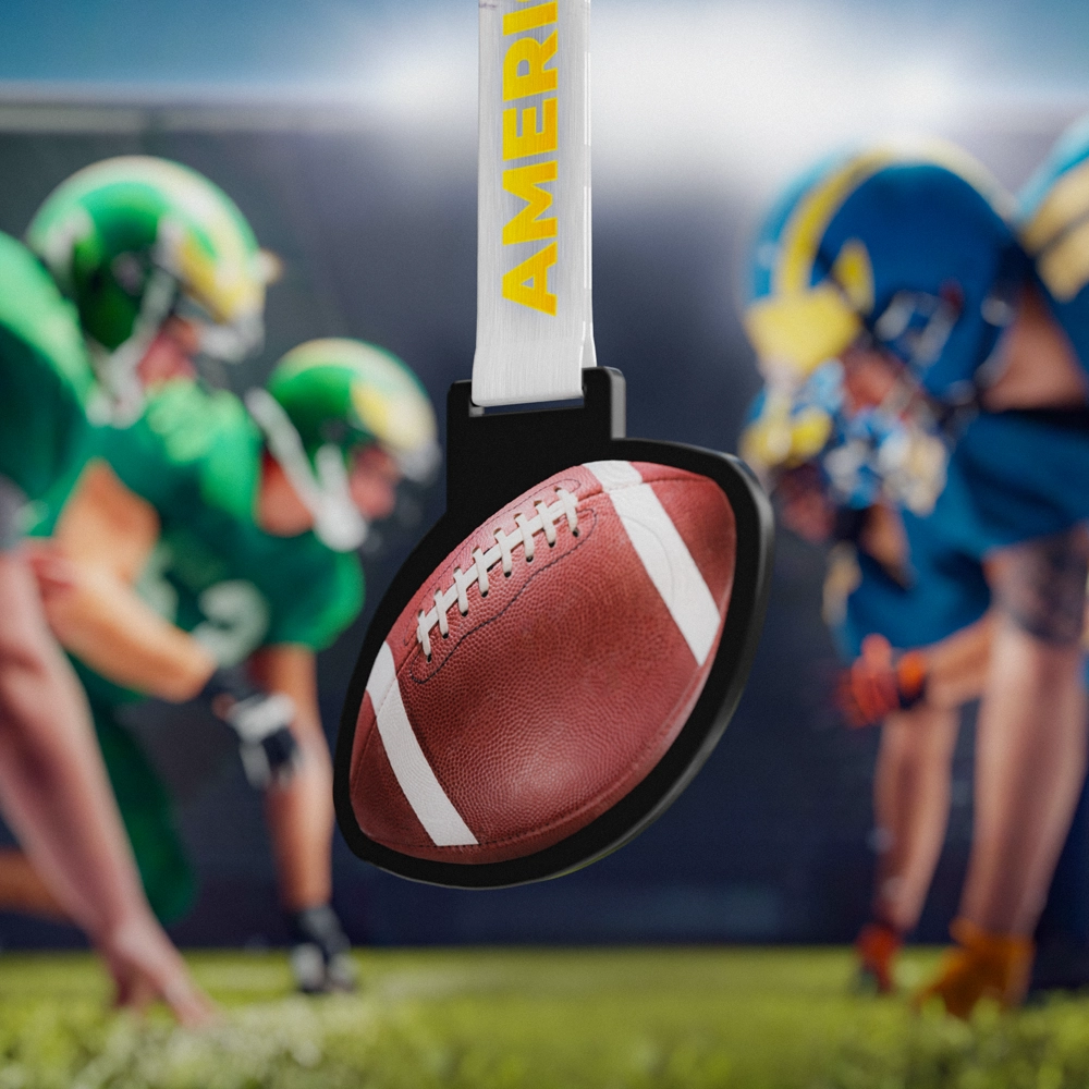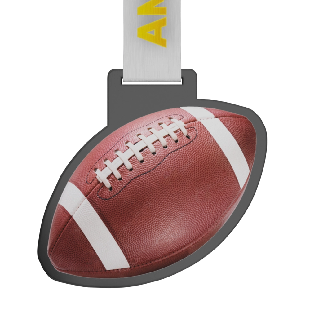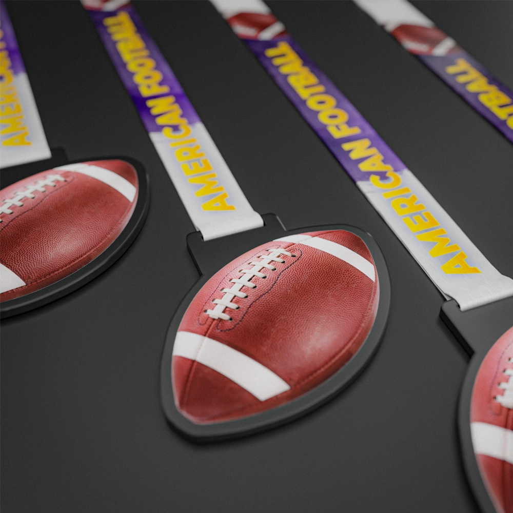 Medaglie originali a forma di palla da football americano, caratterizzate da una stampa vivida e colorata su tutto.