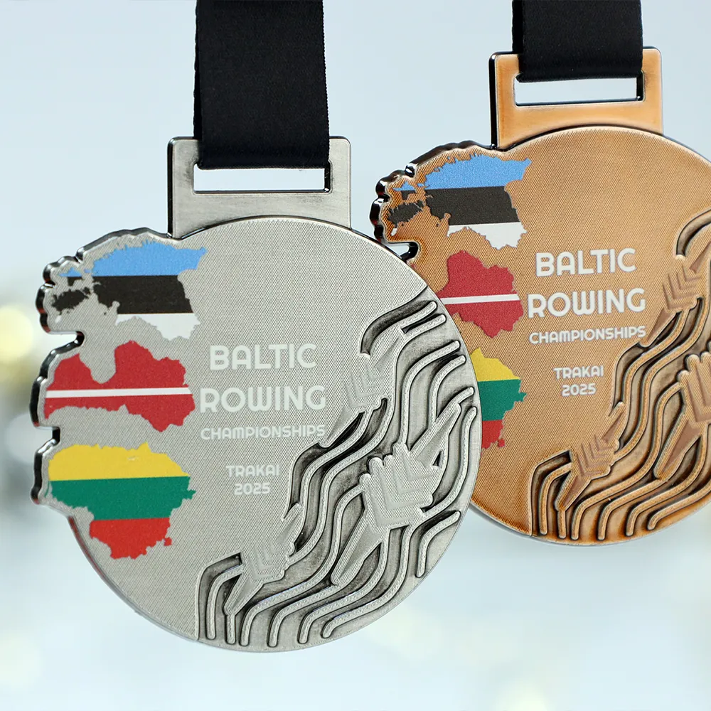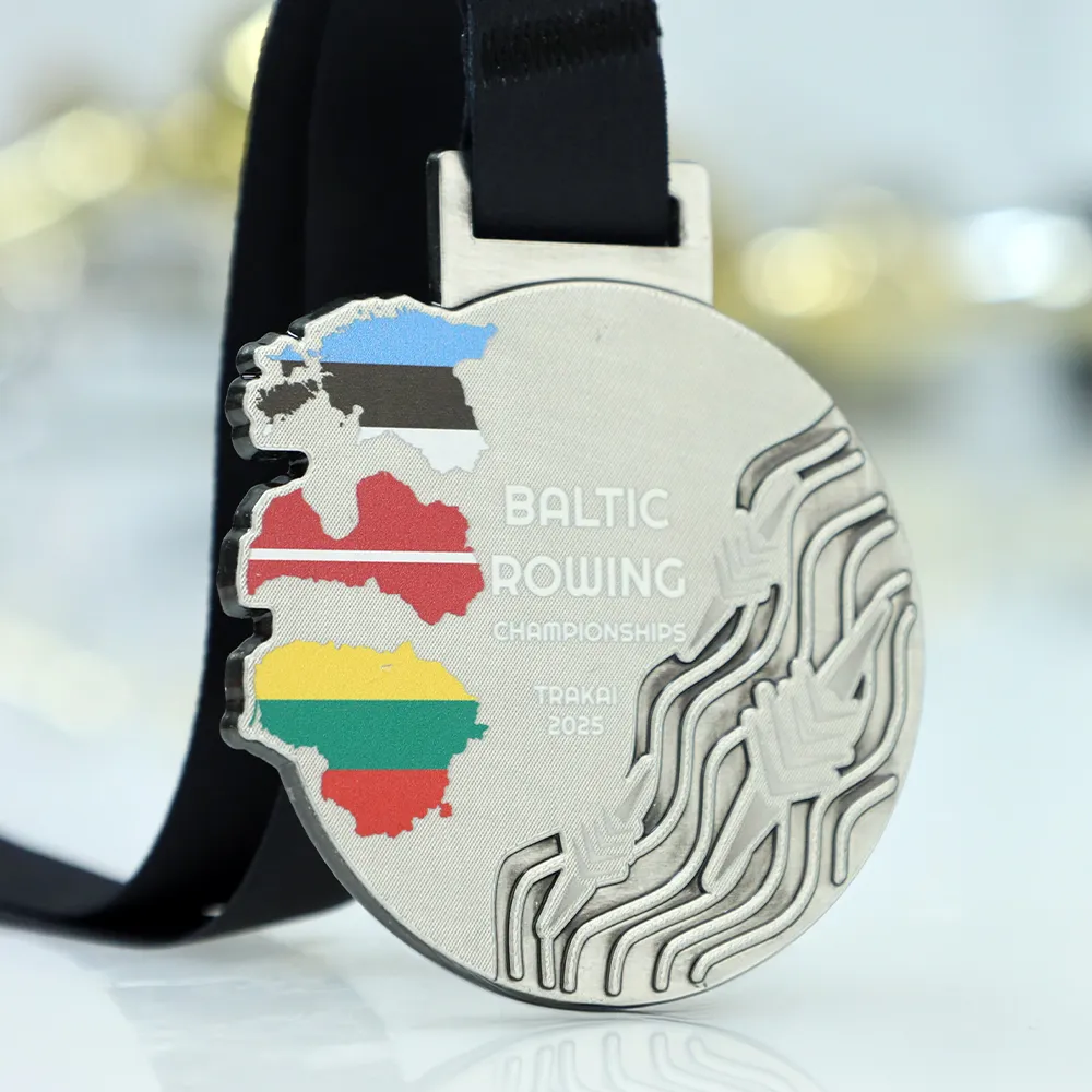 Questa medaglia personalizzata eseguita con precisione è una magistrale combinazione di durevole lega di zinco e moderni metodi di decorazione. La trama tridimensionale e tattile dell'acqua increspata e dei remi è stata ottenuta attraverso il processo di pressofusione, contrastando perfettamente con la superficie liscia delle mappe rifinite con la tecnica di stampa UV. Questa tecnologia ha permesso una riproduzione fedele delle bandiere estone, lettone e lituana con bordi nitidi, rendendo questo trofeo per i Baltic Rowing Championships un ottimo esempio di artigianato di alta qualità.