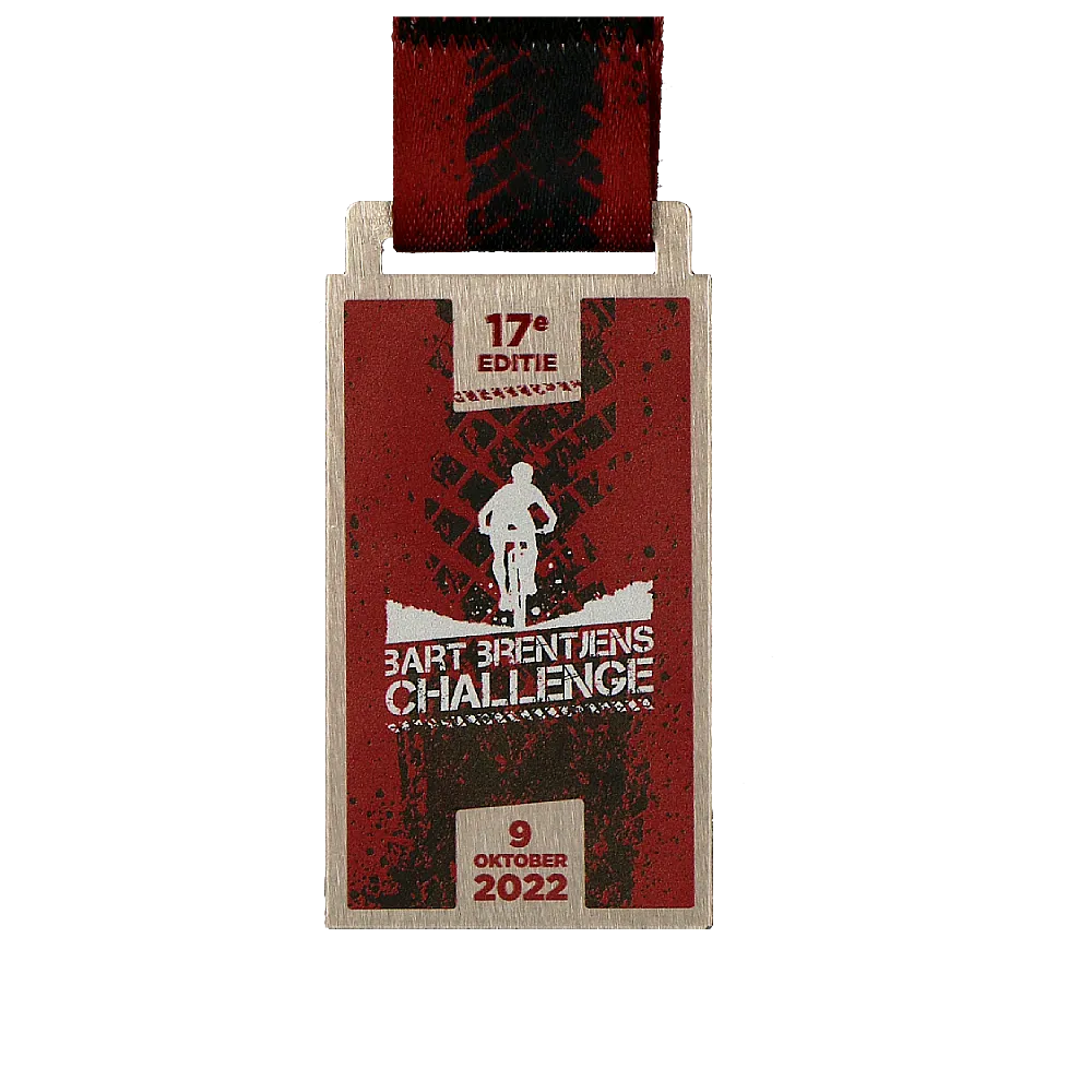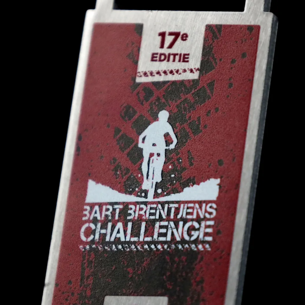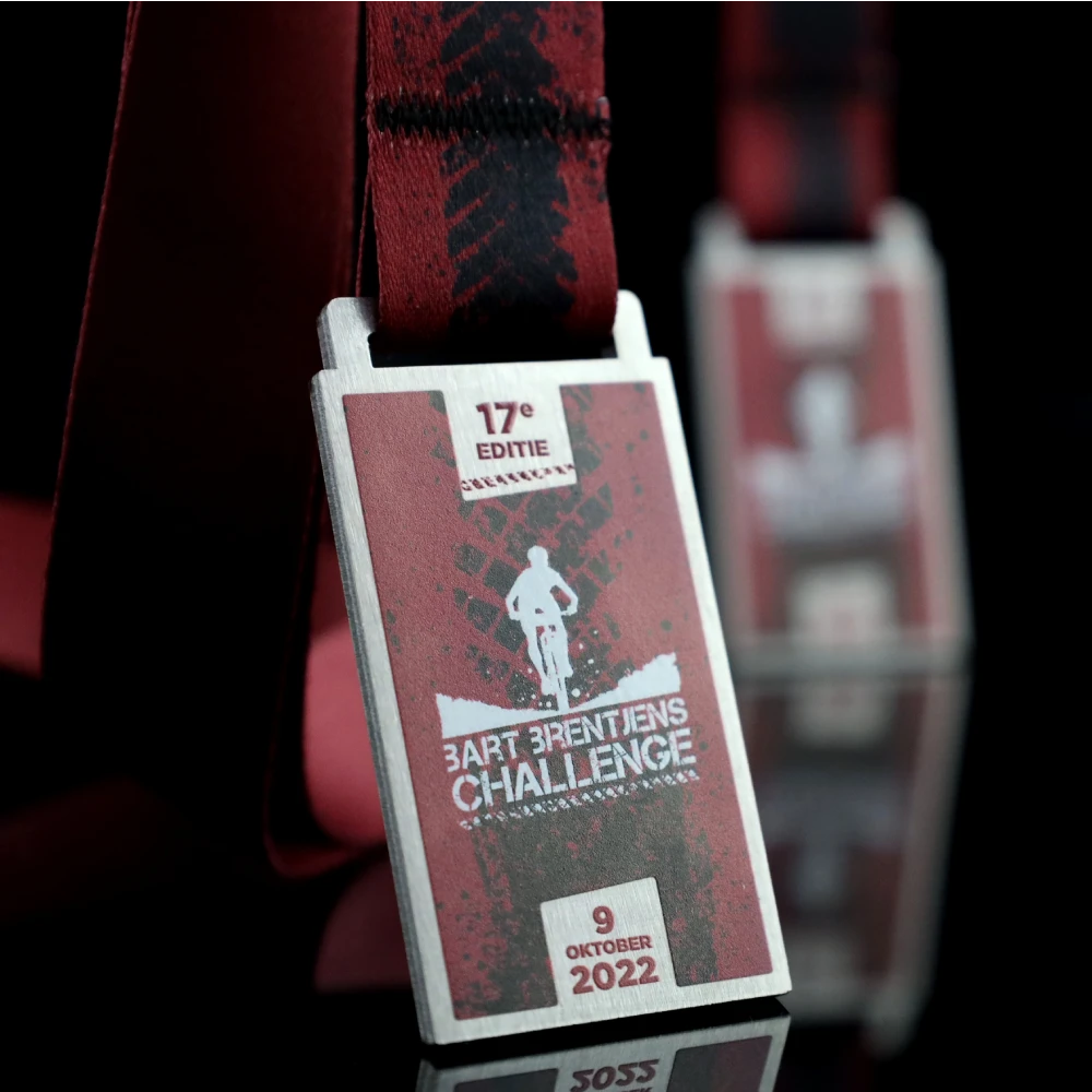 Ogni competizione ciclistica termina al traguardo dove i giocatori ricevono medaglie commemorative. Questo è il culmine dei loro sforzi. Per la Bart Brentjens Challenge abbiamo preparato originali medaglie in acciaio stampato in una forma classica. Grazie a questo siamo stati in grado di mostrare esteticamente decorazioni tridimensionali applicate con una stampa colorata. Le medaglie da ciclismo d’argento si distinguono anche per grafiche perfettamente abbinate che si riferiscono alle gare ciclistiche. Sulla superficie della medaglia abbiamo stampato decorazioni raffiguranti un ciclista e un segno di pneumatico. Il tutto è completato da un nastro personalizzato in un colore coordinato.