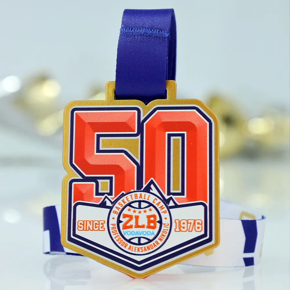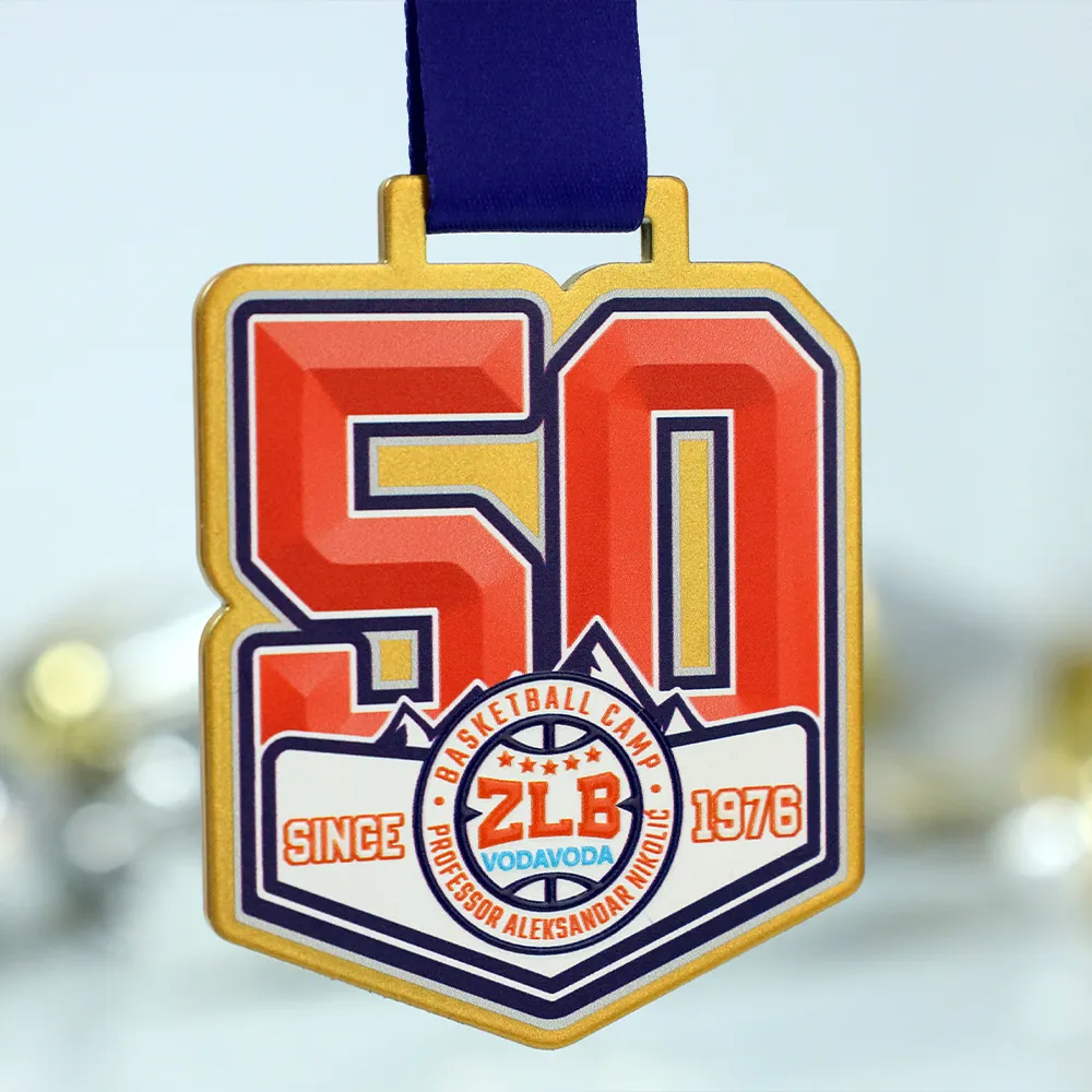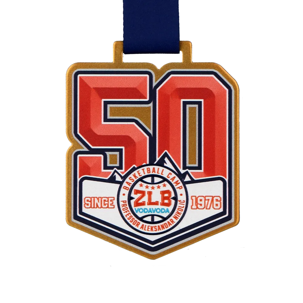 Medaglia da basket che abbiamo realizzato per il 50° anniversario del Basketball Camp ZLB Vodavoda. La personalizzazione è stata fatta utilizzando la stampa UV nei colori rosso, bianco e blu scuro, e la caratteristica forma a scudo è stata tagliata al laser. La medaglia mostra un grande numero "50" e il logo centrale del campo con il testo "SINCE 1976". Prepareremo una medaglia simile per il tuo evento.