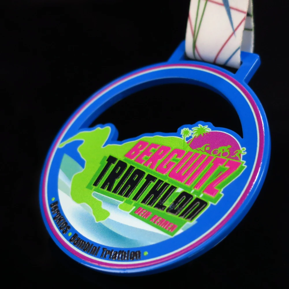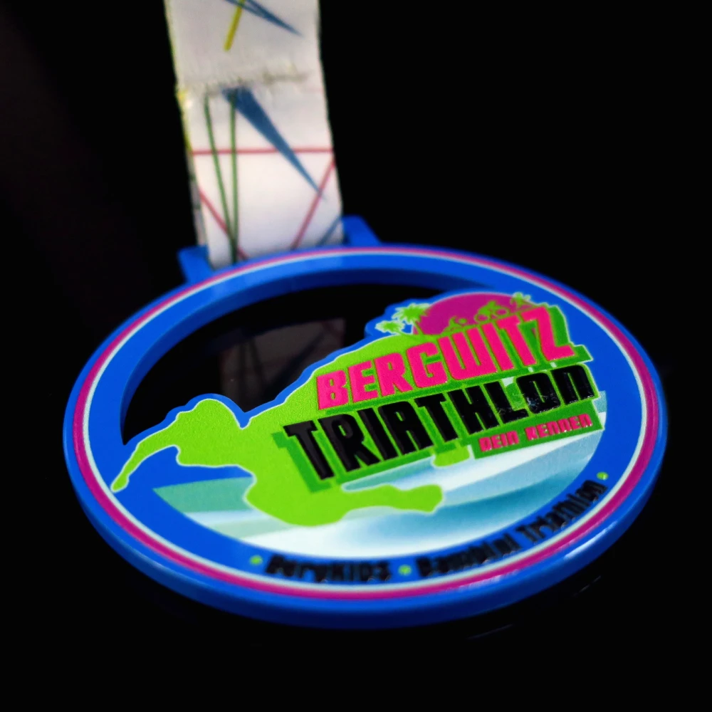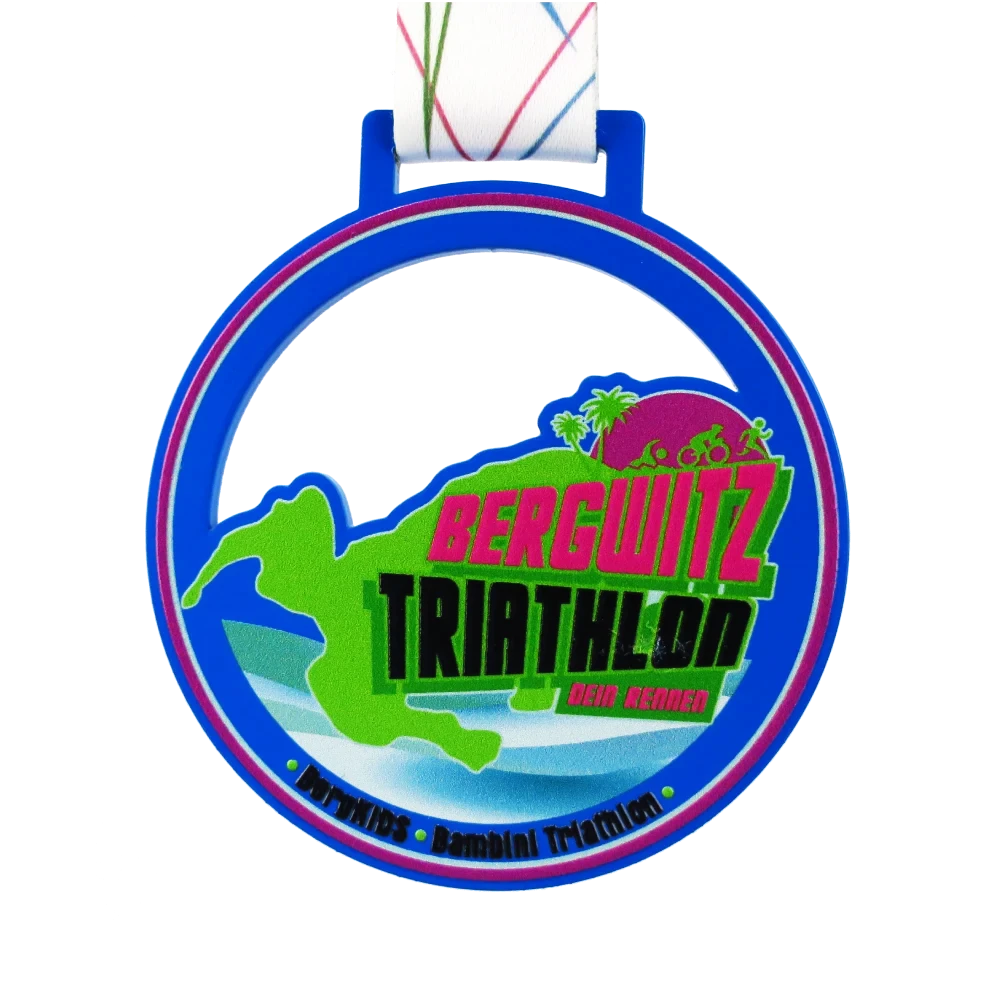 Il fattore che cattura decisamente l’occhio è il colore di questa medaglia. La sua corretta saturazione e chiarezza rimangono impresse nella memoria e assicurano un bell’aspetto. Il design che sfrutta appieno una perfetta combinazione di colori è la nostra medaglia in acciaio realizzata per la competizione Bergwitz Triathlon. Questa medaglia rotonda per la competizione di triathlon è abbellita con eleganti elementi traforati. Le aggiunte multicolori si abbinano perfettamente alla tonalità blu della medaglia. Il tutto è enfatizzato da un bellissimo nastro sublimato che si abbina al design complessivo.