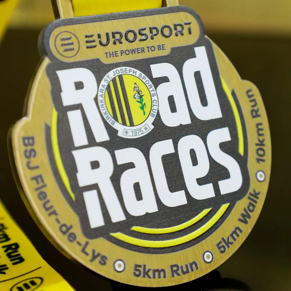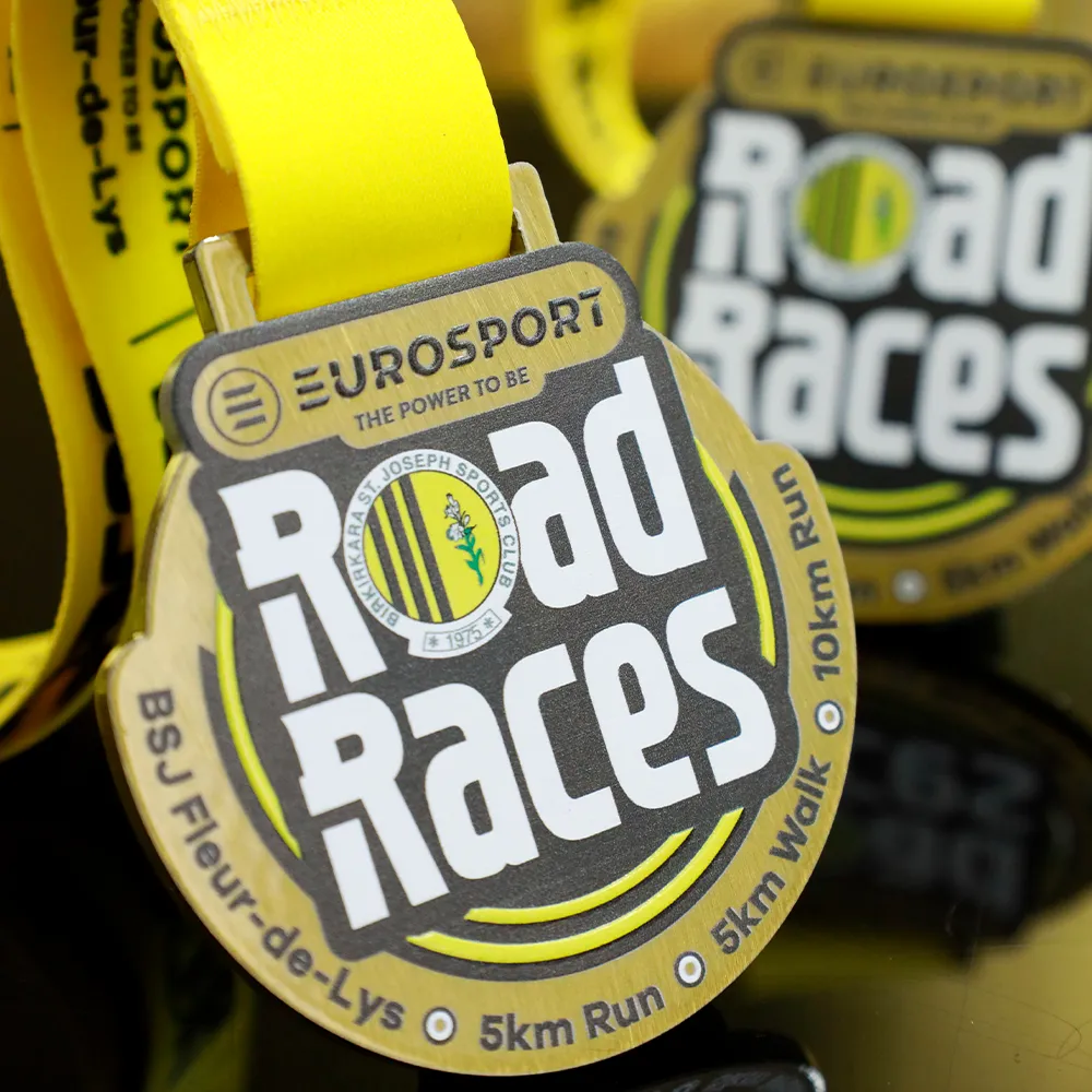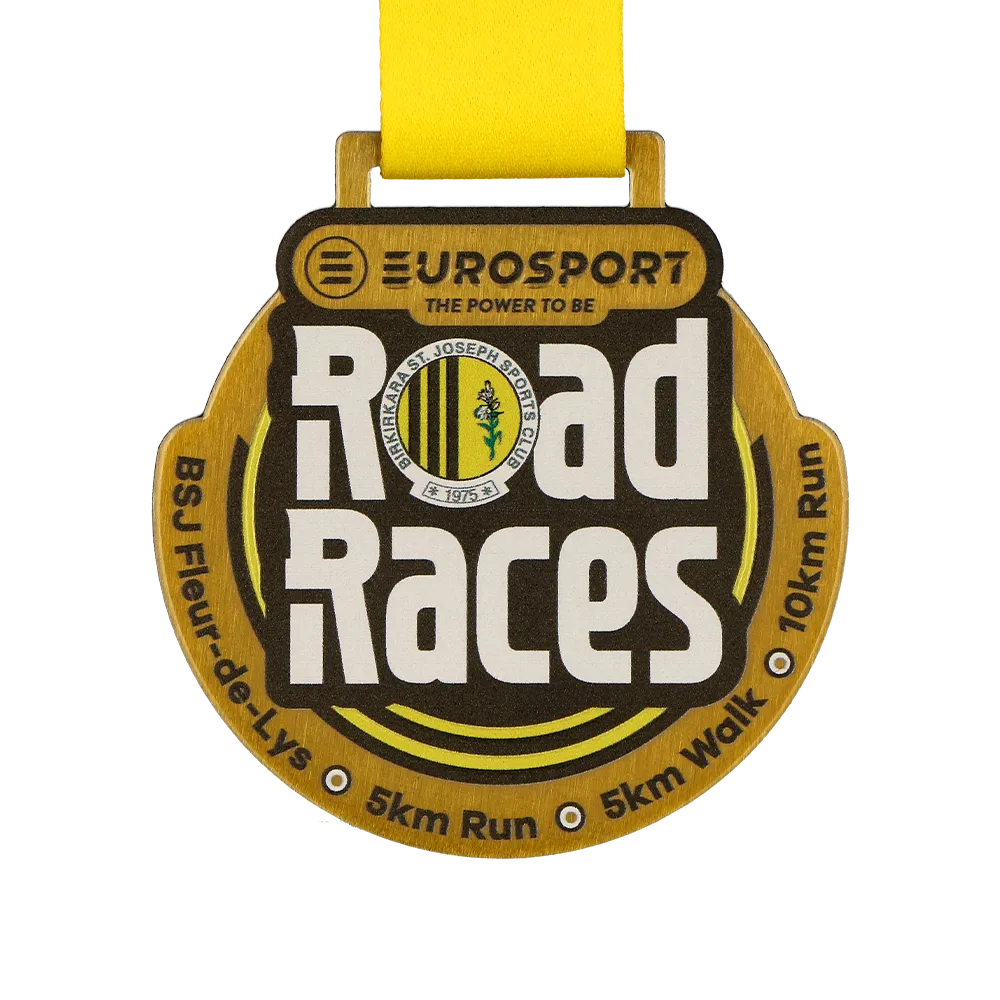 Medaglia da corsa progettata per il Birkirkara St. Joseph Sports Club. Una medaglia d'oro con il nome dell'evento e le distanze stampate in UV colorato.