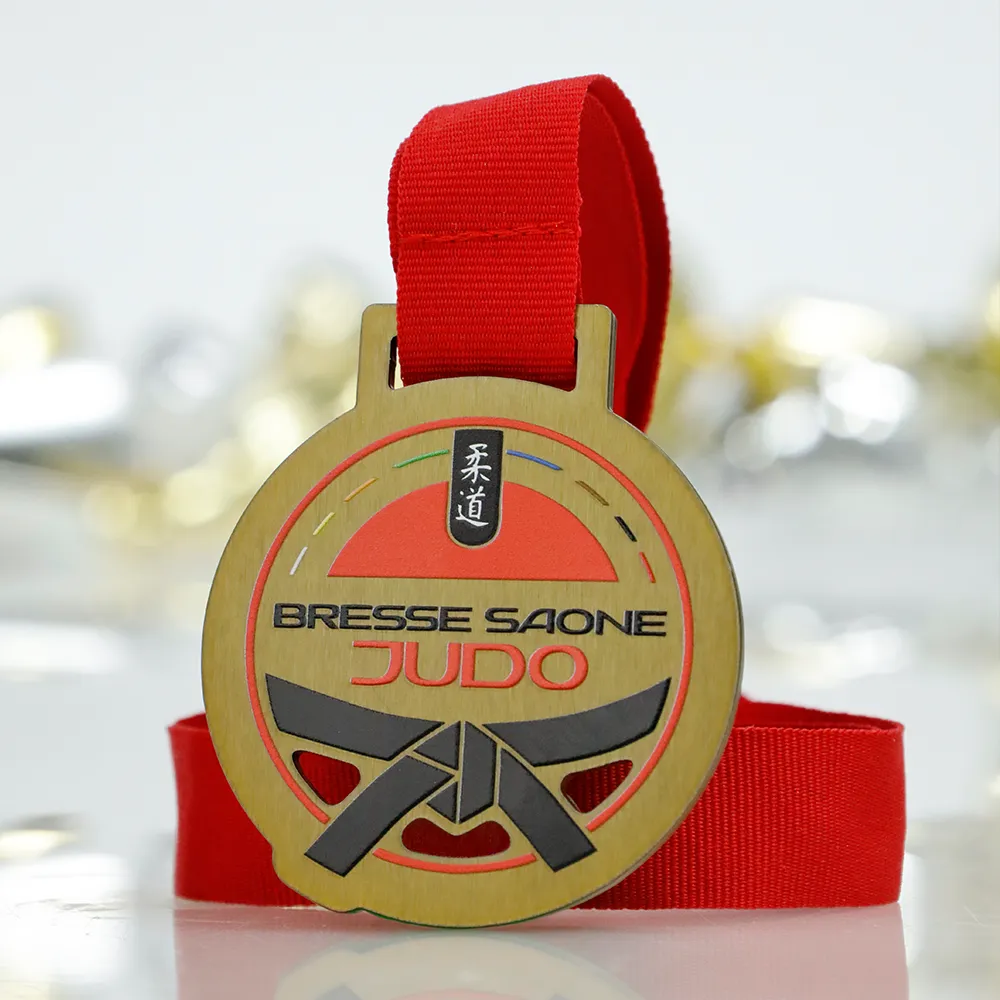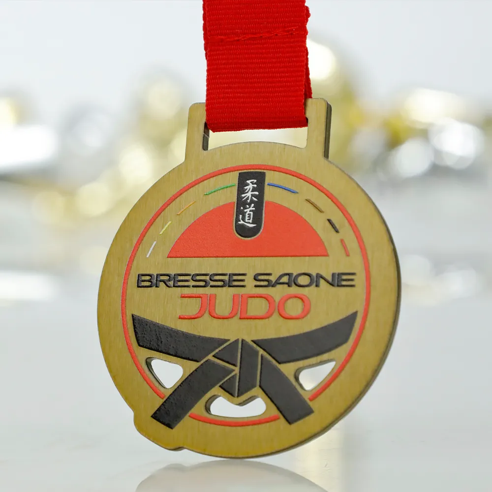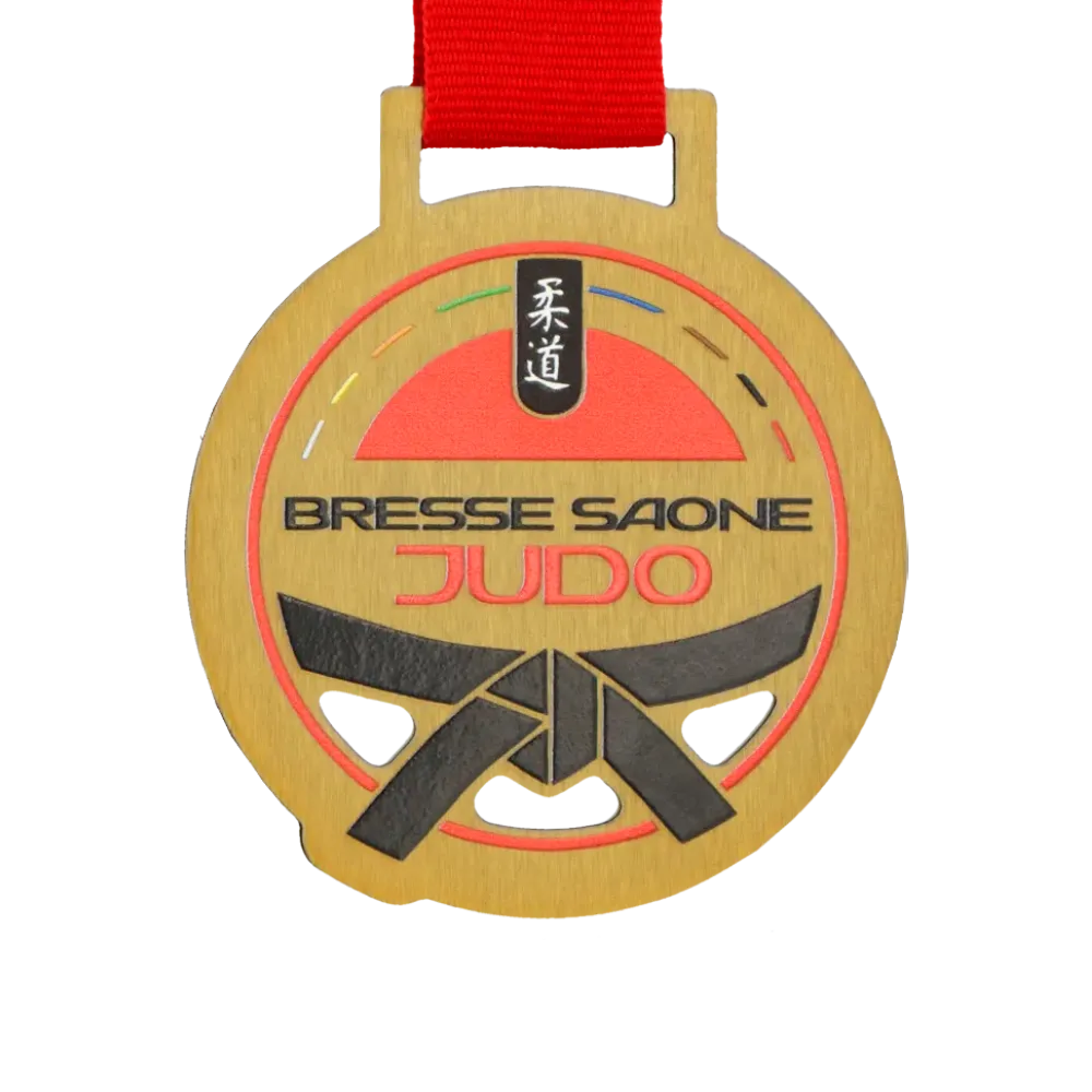 Una medaglia judo realizzata in acciaio, tagliata al laser e decorata con stampa UV colorata. Il design combina simboli della disciplina – una cintura nera, l'emblema del judo e linee dinamiche ispirate al movimento. Il tutto è mantenuto nelle tonalità di oro, rosso e nero. La medaglia è sospesa su un nastro rosso abbinato alla tavolozza dei colori del design.