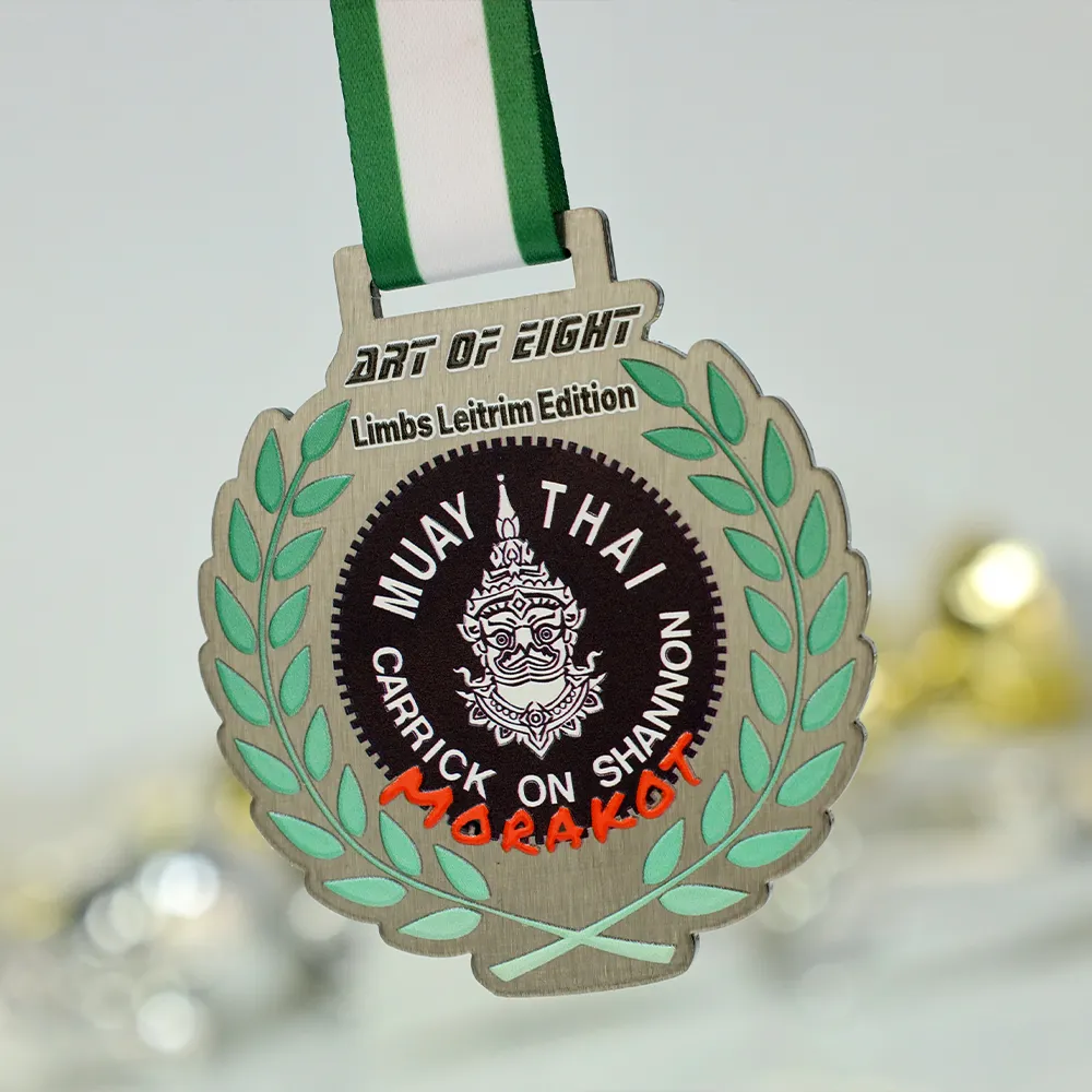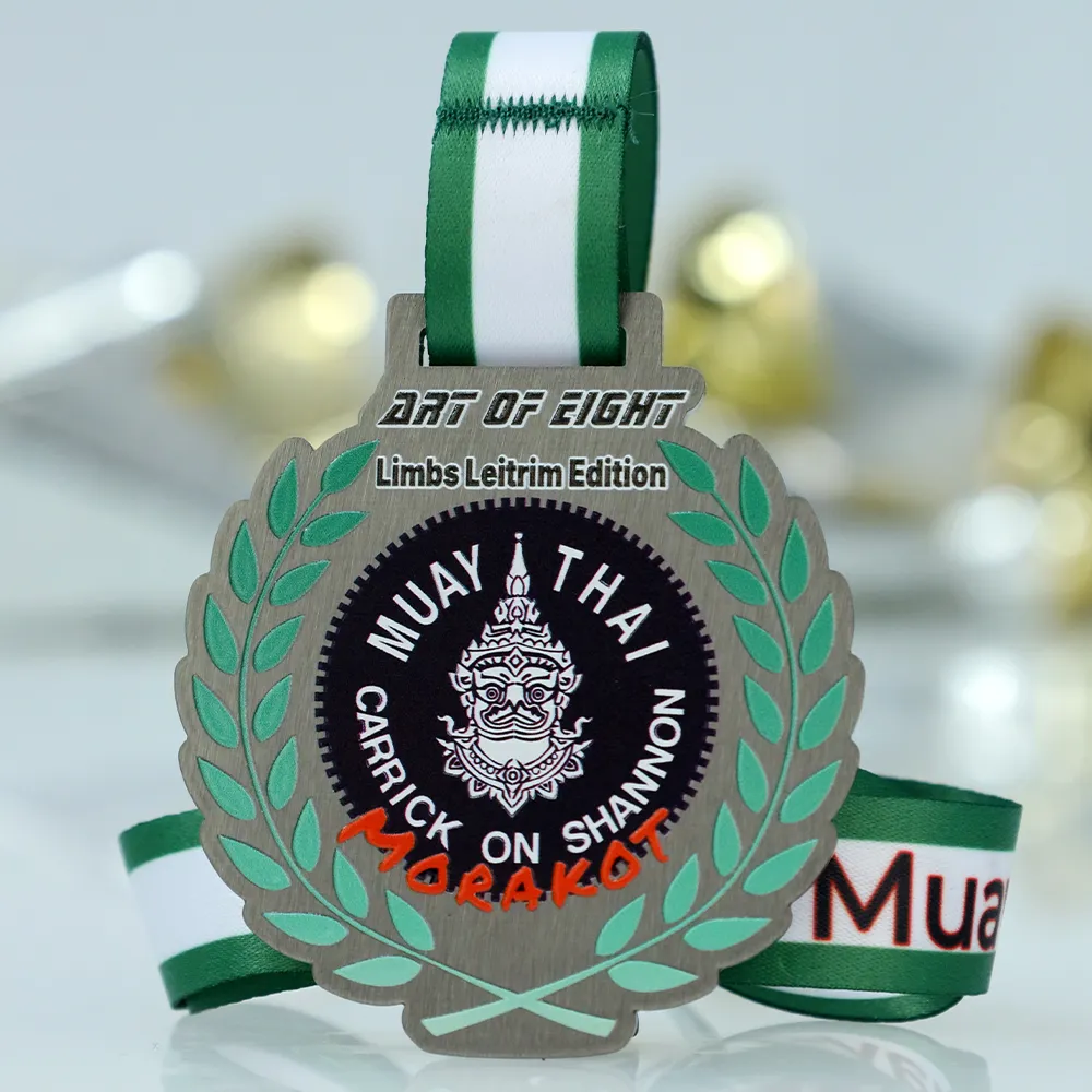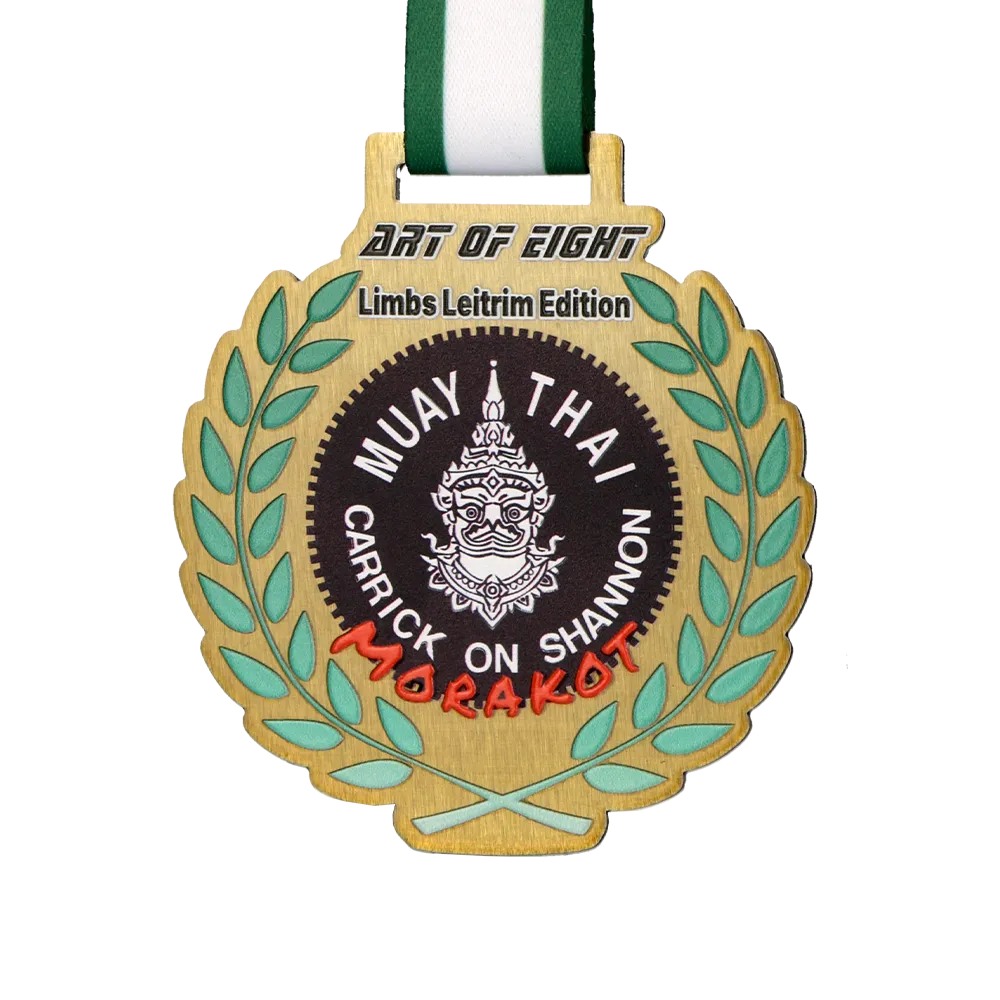 Ecco una medaglia in acciaio stampato professionale, creata per il gala Carrick On Shannon Muay-Thai, che combina l'eleganza sportiva con la crudezza delle arti marziali. Il metallo resistente funge da base per il design, dove una forma tagliata al laser crea un'impressionante forma a corona traforata che circonda il logo centrale. La stampa UV colorata cattura con precisione i dettagli grafici e il nome dell'evento, creando una composizione coesa e accattivante nelle tonalità di oro, verde e nero.