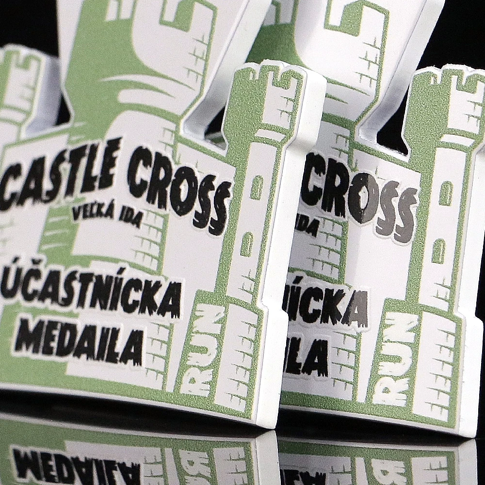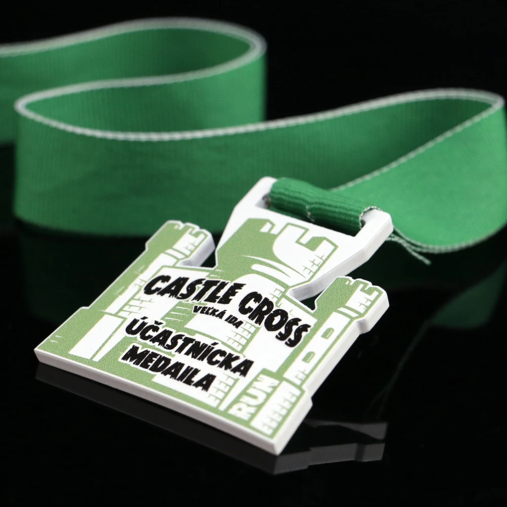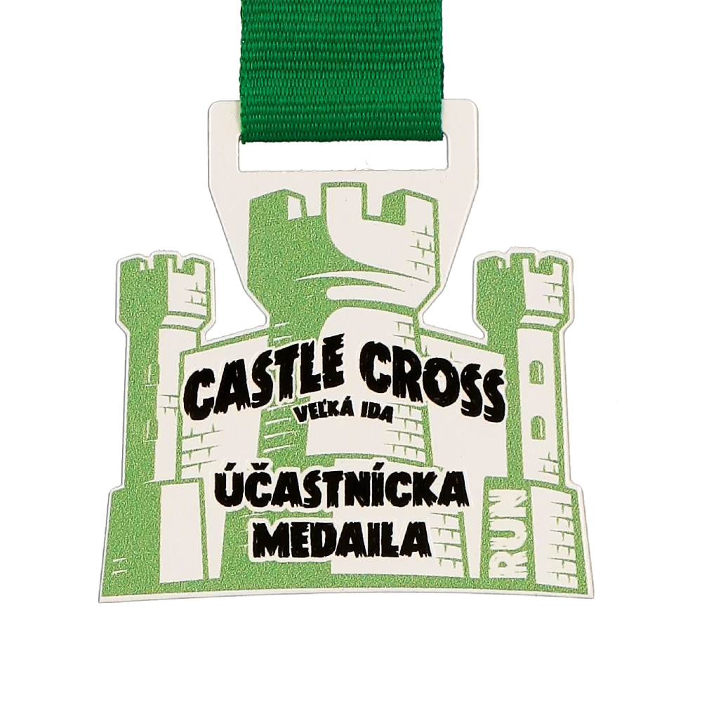 Le medaglie in metallo possono assumere molte forme, personalizzabili in forma, dimensione e design. Per la Castle Cross – Veľká Ida, abbiamo progettato una speciale medaglia da corsa a forma di castello. La decorazione centrale presenta una stampa UV colorata che crea un effetto 3D in rilievo, rendendo le medaglie visivamente accattivanti e piacevoli al tatto.