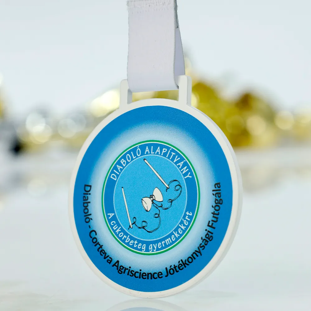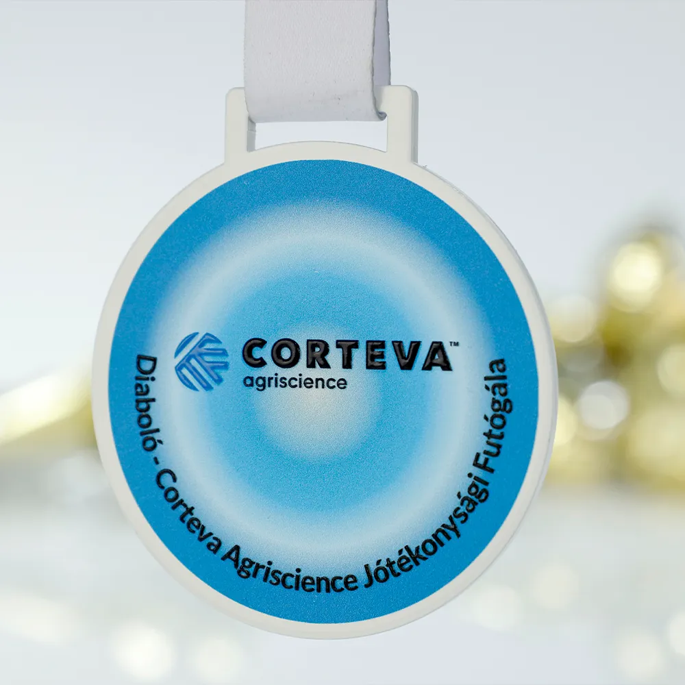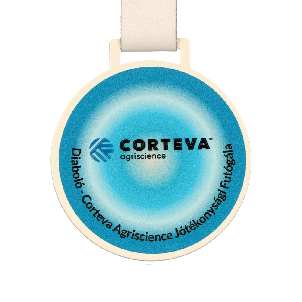 Questa medaglia personalizzata è stata creata per la corsa di beneficenza Diabóló – Corteva Agriscience Jótékonysági Futógála. È una medaglia in acciaio con stampa UV in un semplice formato rotondo.