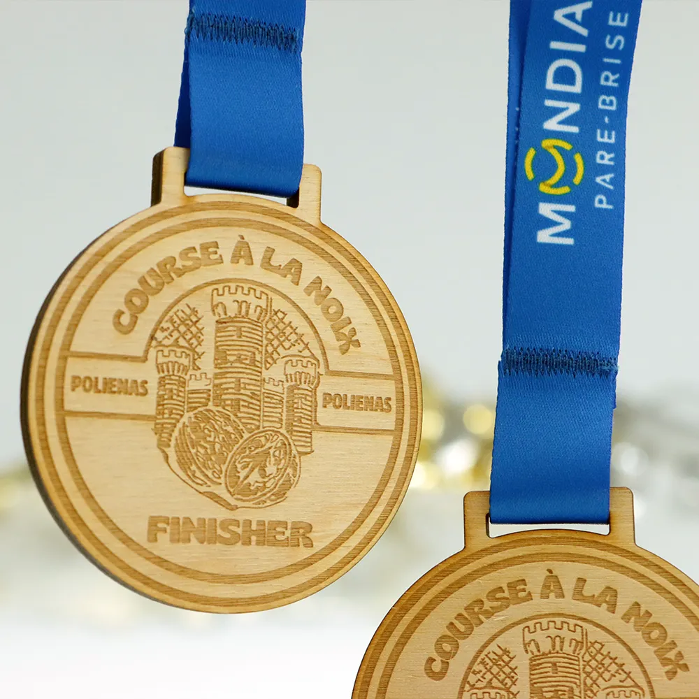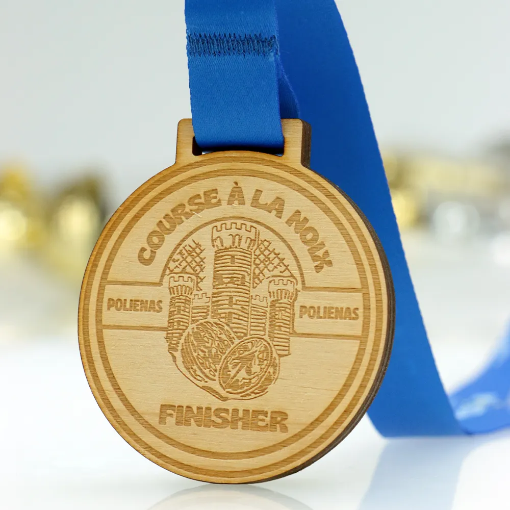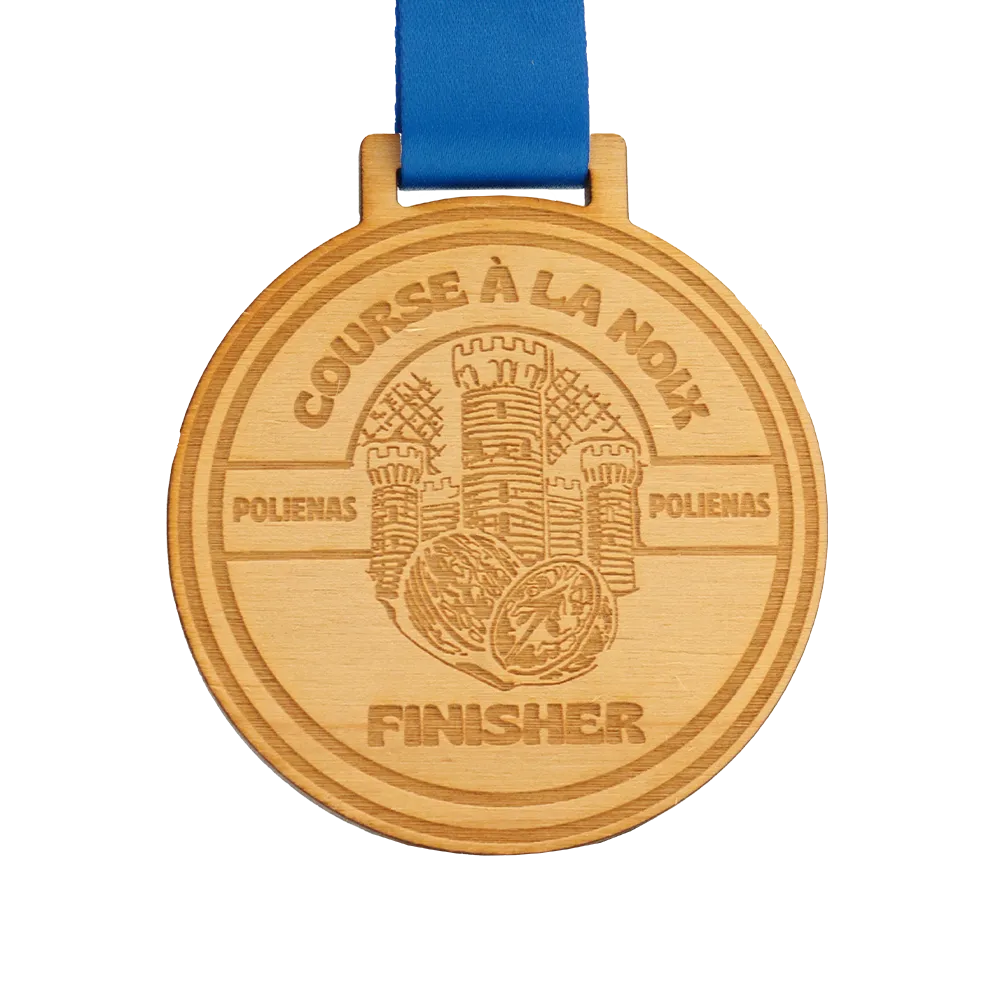 Medaglia in legno realizzata su misura per l'evento "Course à la Noix" a Polienas. La parte anteriore presenta un'immagine incisa di torri del castello e noci, insieme al nome dell'evento.