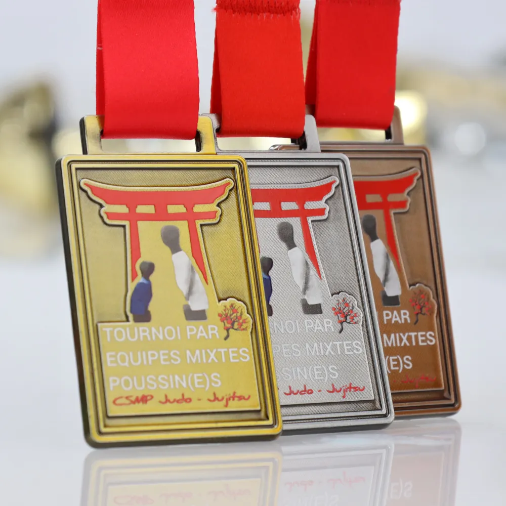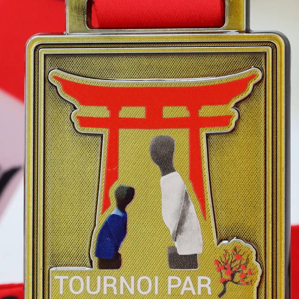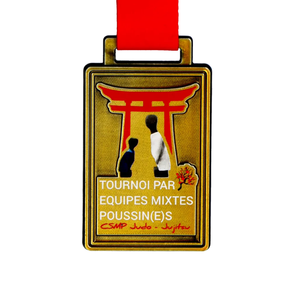 Una medaglia personalizzata progettata per il torneo di judo per bambini – "Tournoi par équipes mixtes Poussin(e)s". Questa è una fusione color oro antico con grafiche applicate utilizzando la stampa UV colorata. Il design presenta un portale torii giapponese e due concorrenti che si inchinano l'uno all'altro. La medaglia è appesa a un nastro rosso abbinato allo schema di colori del design.