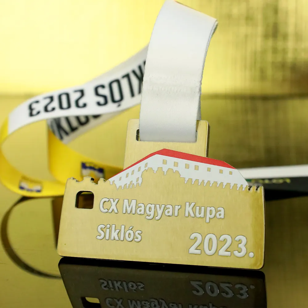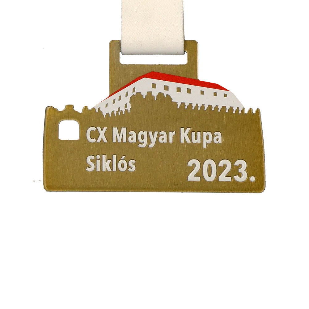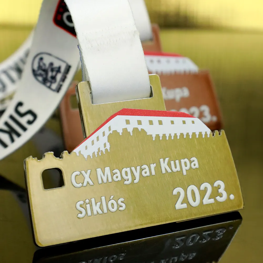 Una medaglia per competizioni ciclistiche per la CX Magyar Kupa Siklós 2023. La medaglia ha la forma dei contorni del castello di Siklós, con il nome dell'evento stampato al centro utilizzando la stampa UV.