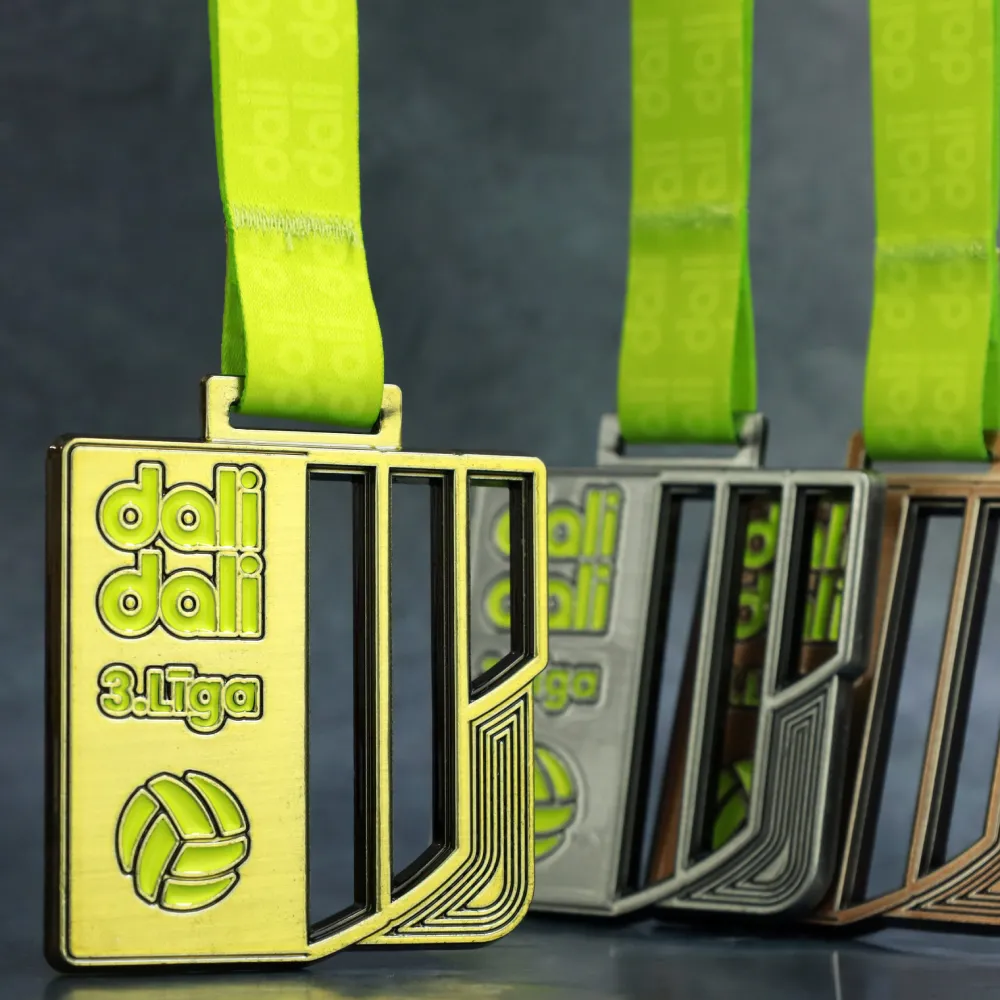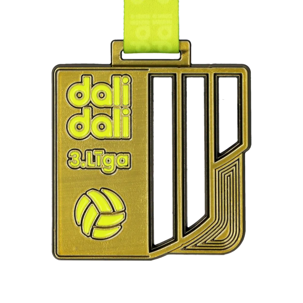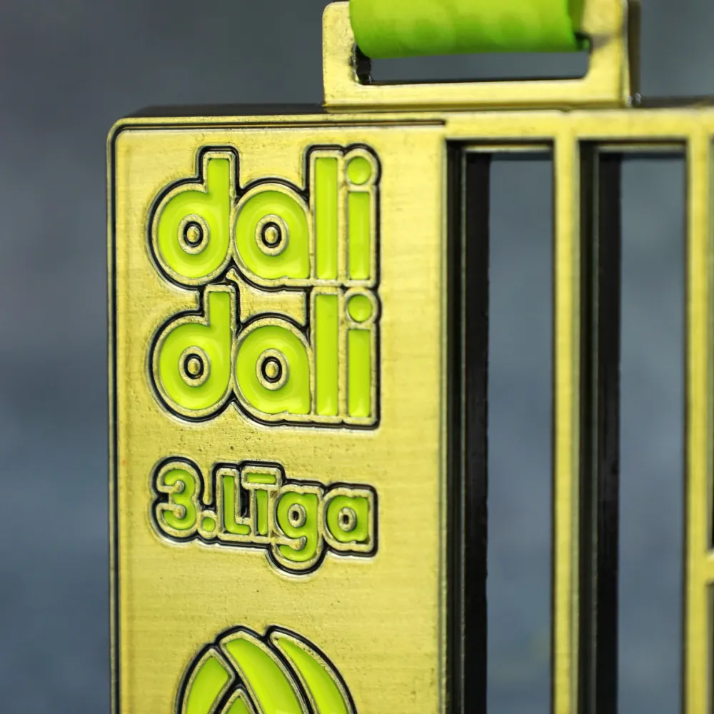 Medaglia su misura preparata per le partite della Dali Dali 3rd League. La forma è stata fusa da uno stampo sotto forma di rettangolo con elementi aperti. Decorazioni in giallo sono state applicate con tecnica a smalto. La medaglia è destinata ai partecipanti alla lega di calcio.