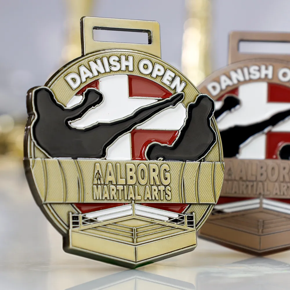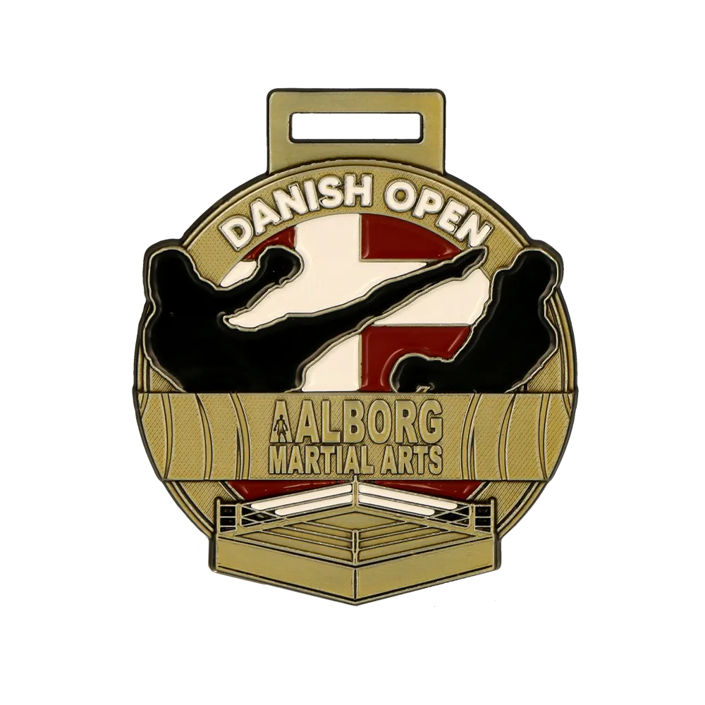 Una medaglia per arti marziali progettata per il torneo Danish Open organizzato da Aalborg Martial Arts. La forma rotonda presenta un motivo dinamico di due concorrenti che combattono sullo sfondo della bandiera danese, enfatizzando il carattere sportivo dell'evento. In basso, c'è un'immagine di un ring e il nome dell'organizzatore.