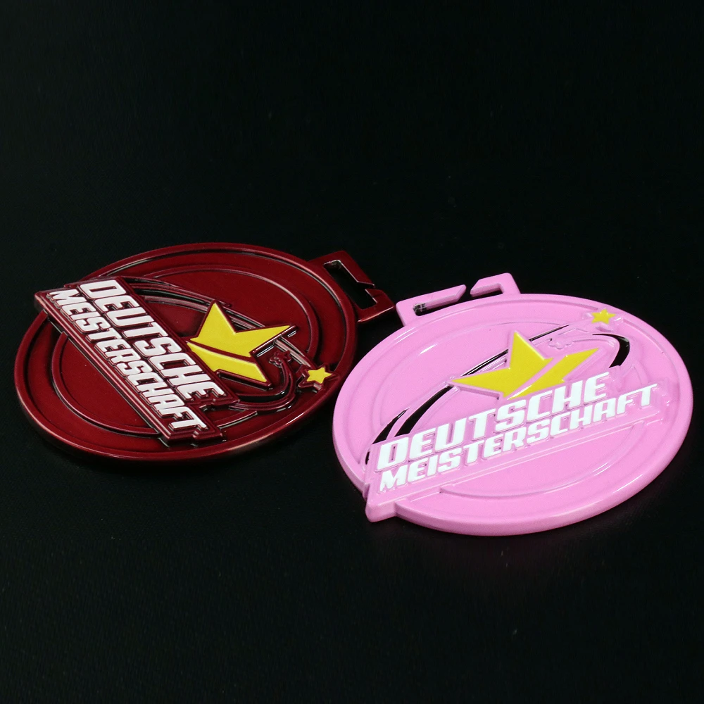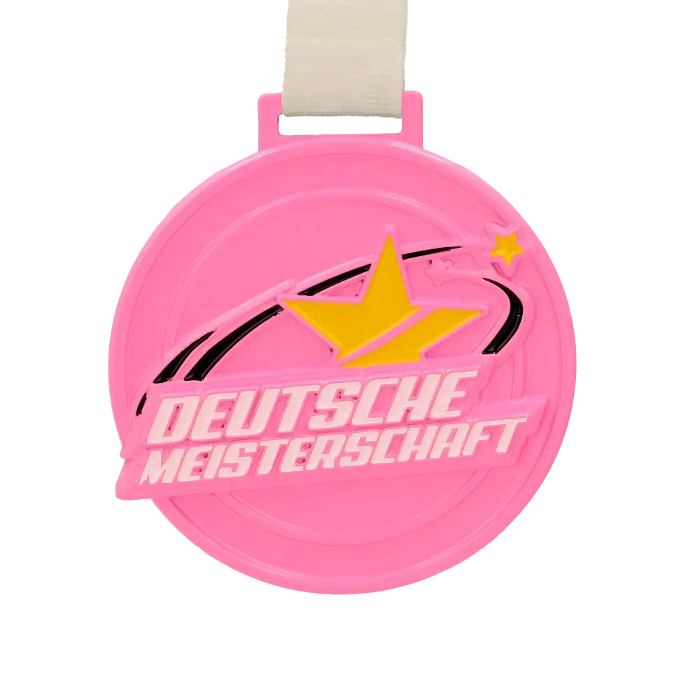 Le cheerleader che partecipano ai Deutsche Meisterschaten hanno imparato il compito di tifare per le squadre, che non è un compito facile. È per loro che abbiamo preparato originali medaglie su misura in rosa. Le medaglie hanno una forma rotonda e sulla loro superficie ci sono molte decorazioni che possono essere sentite sotto le dita. Inoltre abbiamo riempito queste decorazioni con smalto colorato che cattura l’occhio e rende la medaglia davvero bella. Il tutto brilla delicatamente alla luce grazie al quale le medaglie per cheerleading deliziano con il loro aspetto in tutte le condizioni.