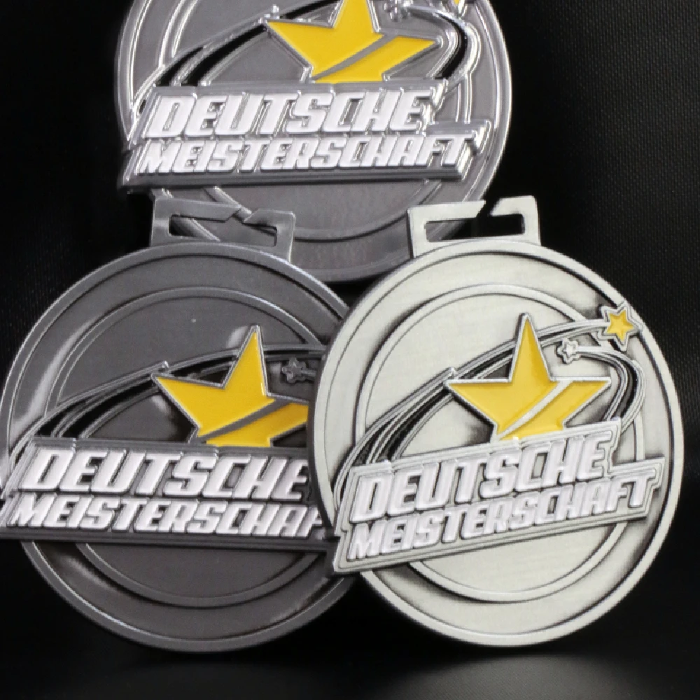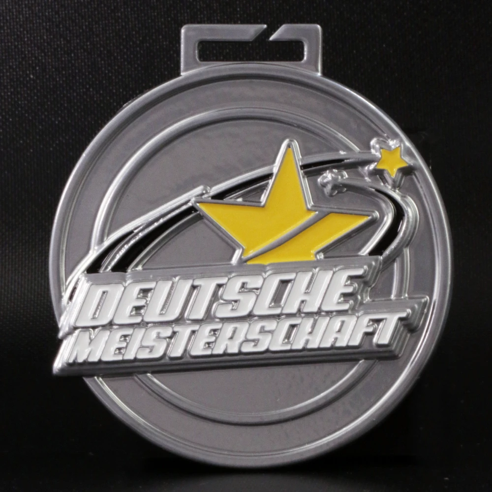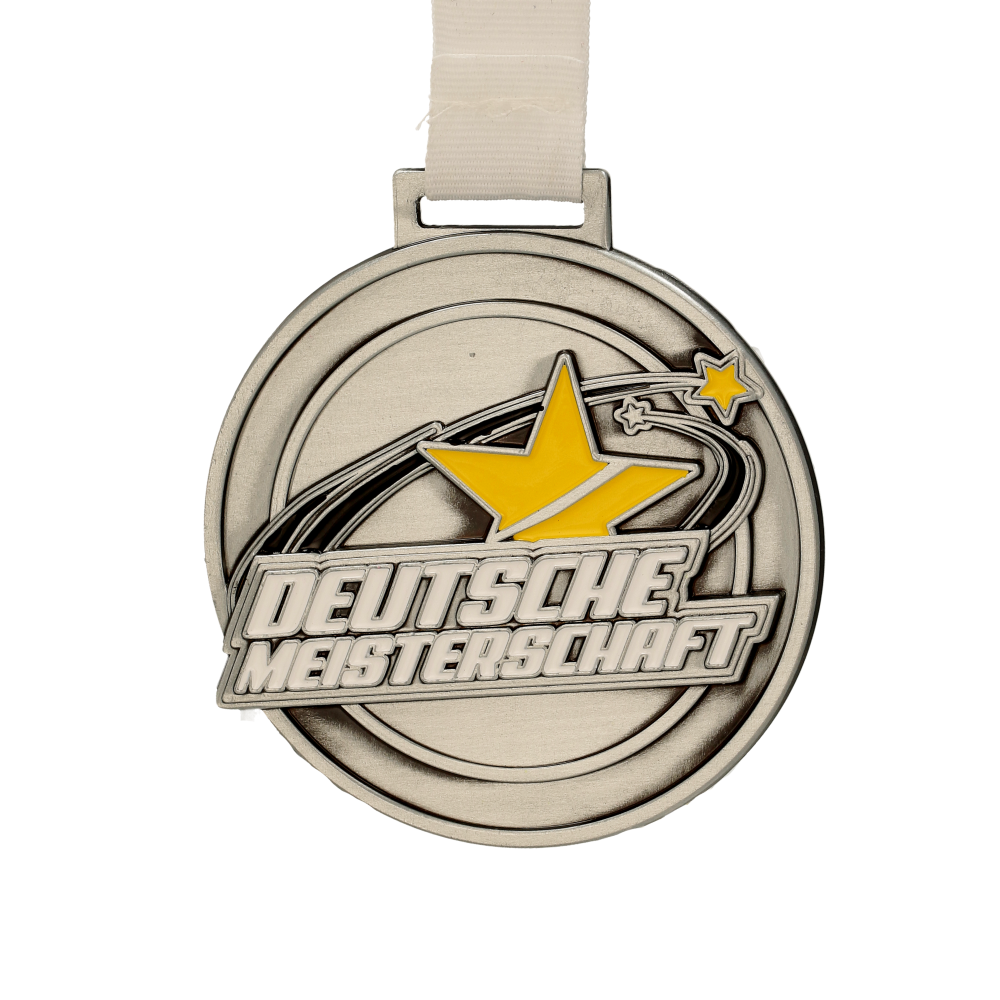 Le cheerleader che partecipano ai Deutsche Meisterschaten hanno imparato il compito di tifare per le squadre, che non è un compito facile. È per loro che abbiamo preparato originali medaglie su misura in argento. Le medaglie hanno una forma rotonda e sulla loro superficie ci sono molte decorazioni che possono essere sentite sotto le dita. Inoltre, abbiamo riempito queste decorazioni con smalto colorato che cattura l’occhio e rende la medaglia davvero bella. Il tutto brilla delicatamente alla luce grazie al quale le medaglie per cheerleading deliziano con il loro aspetto in tutte le condizioni.