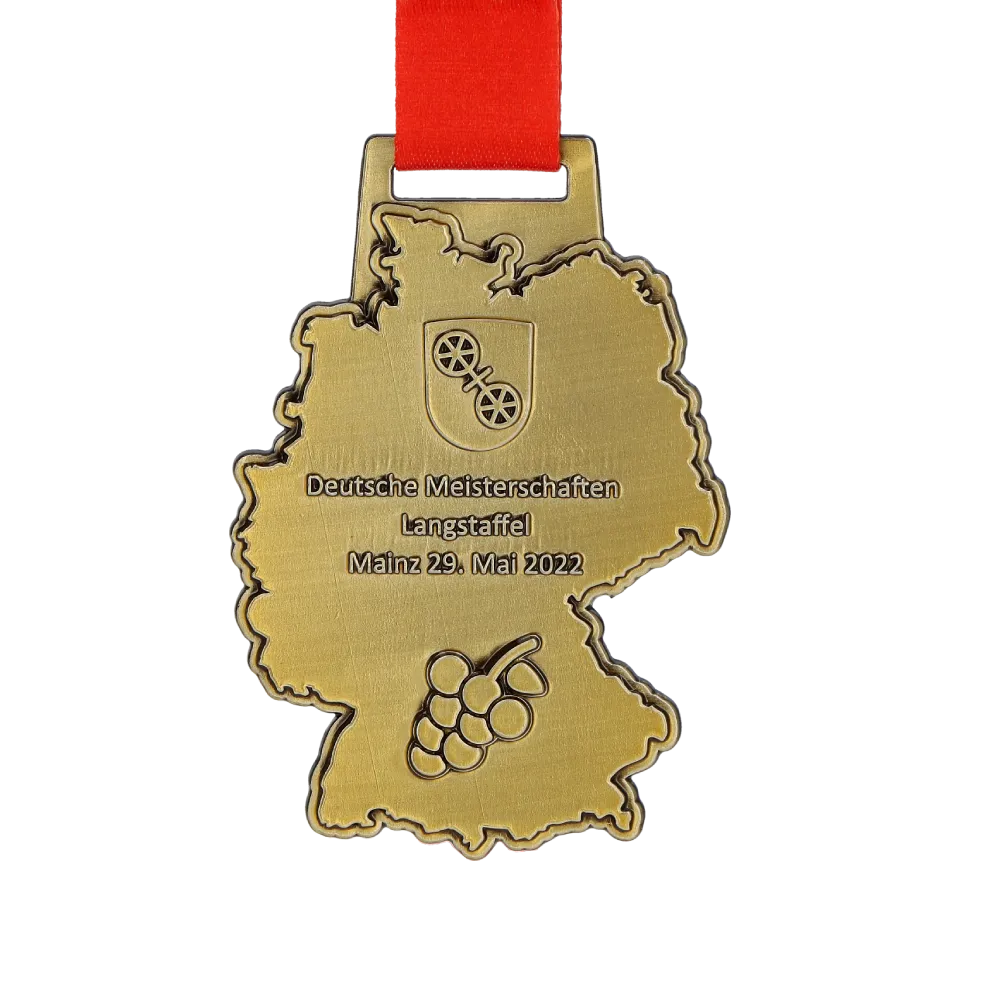 Nella nostra offerta troverai molte medaglie preparate per vari eventi sportivi. Hanno tutte una cosa in comune – sono state realizzate su ordine individuale. Una di queste ricompense sono le medaglie da corsa ai Deutsche Meisterschaften Langstaffel. Hanno una forma originale che ricorda la mappa della Germania. Inoltre sono medaglie in acciaio stampato bifacciali. Ciò significa che le decorazioni tridimensionali sono sia sul loro dritto che sul rovescio.