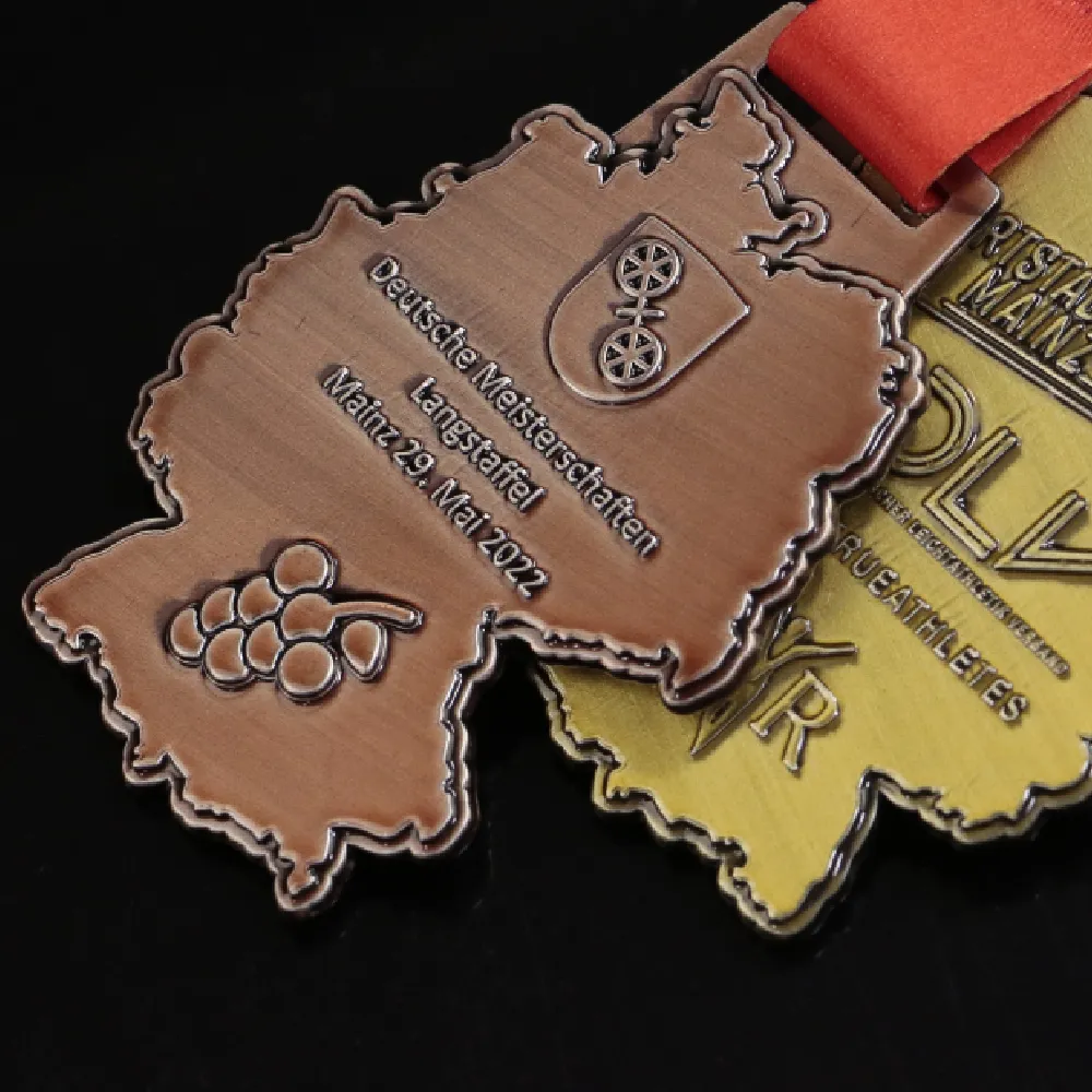 Medaglie pressofuse bifacciali a forma della mappa della Germania con decorazioni tridimensionali. Abbiamo realizzato la medaglia in tre colori classici: oro, argento e bronzo.