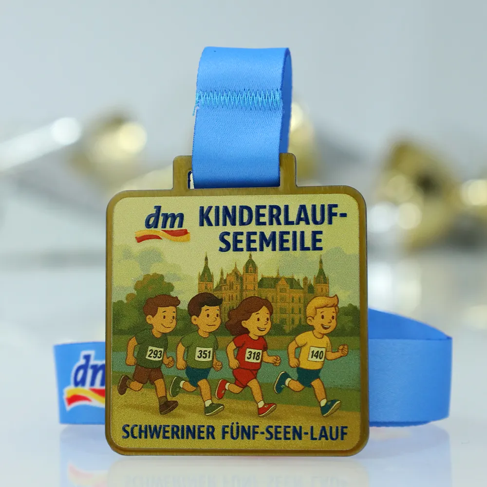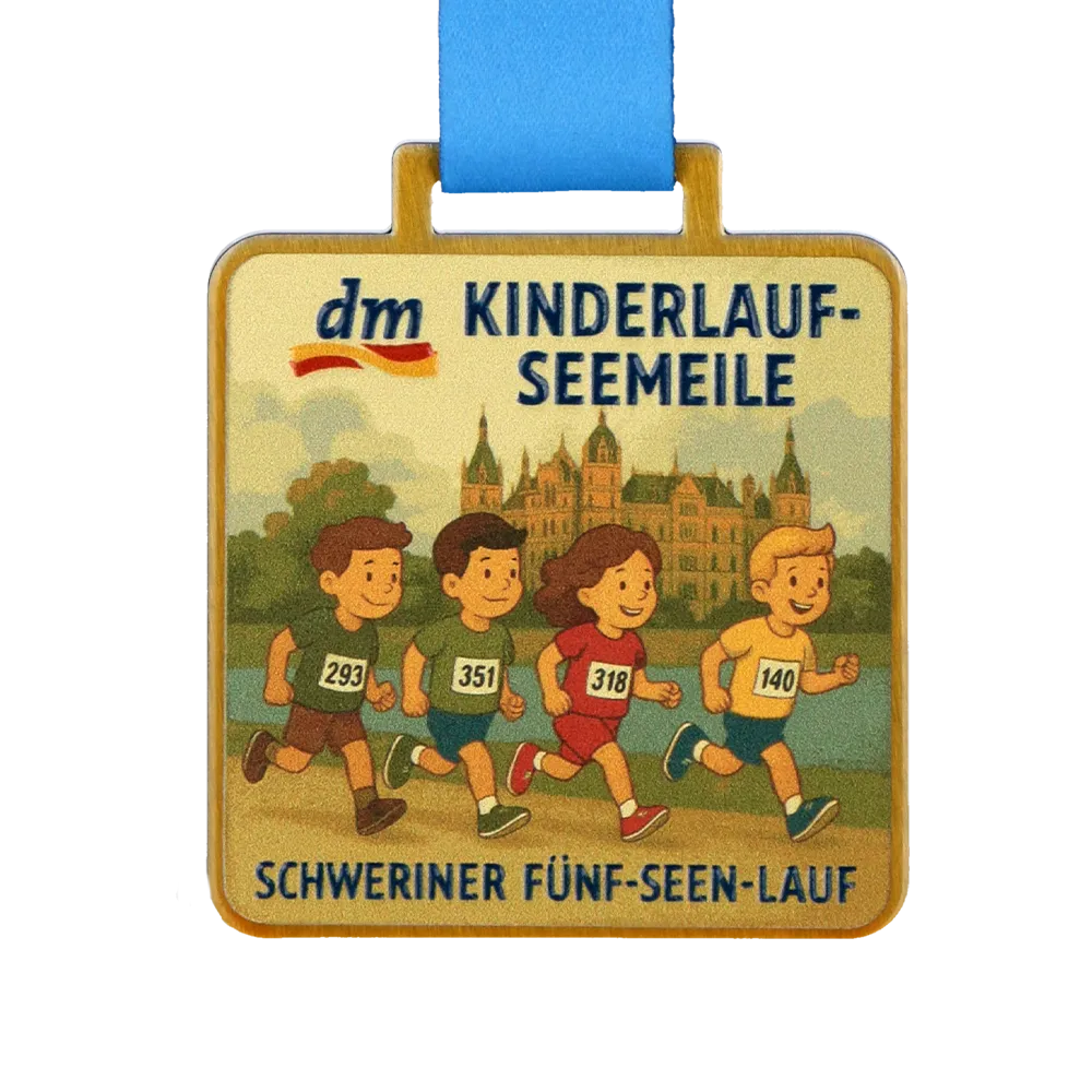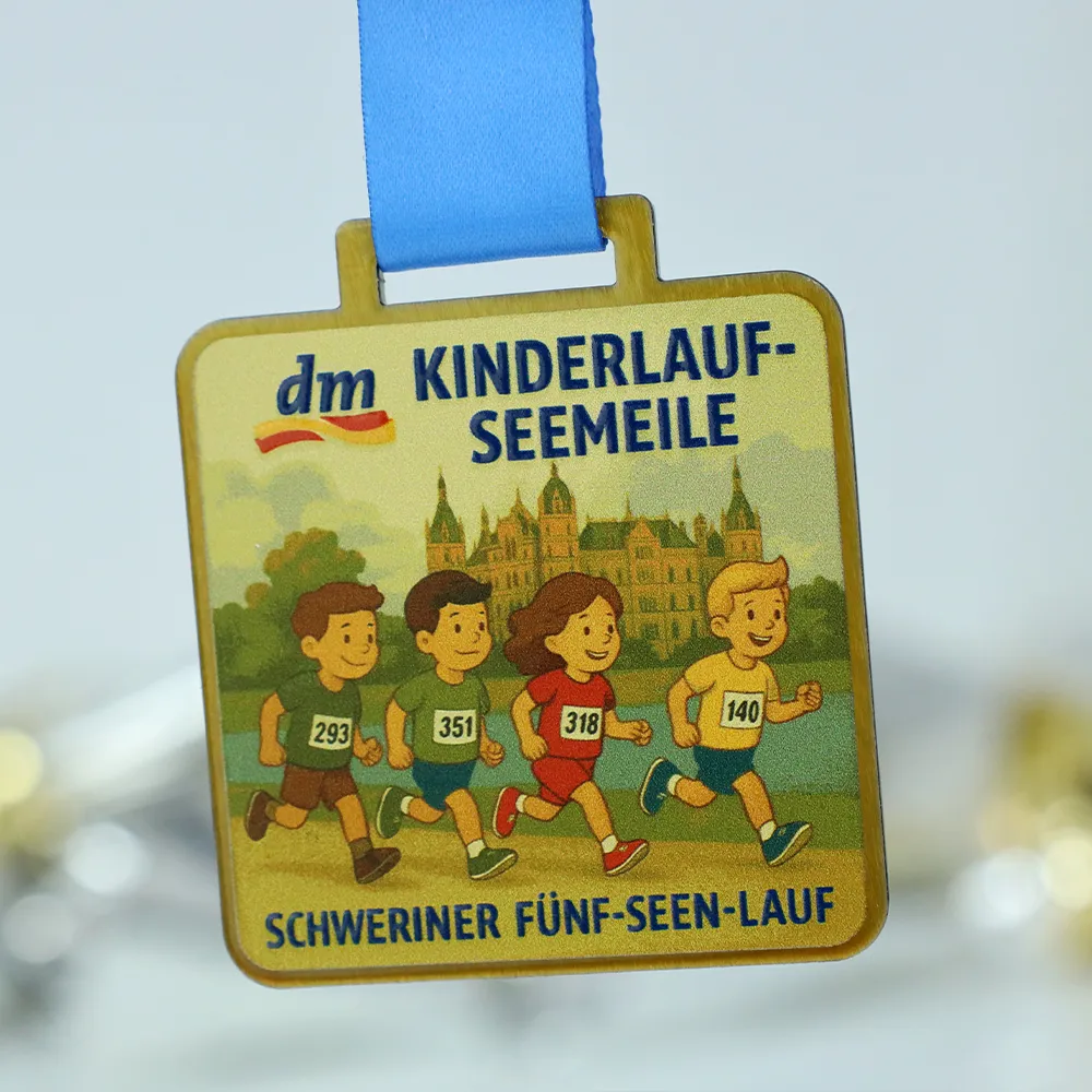 Abbiamo progettato questa colorata medaglia da corsa per bambini per celebrare la competizione DM Kinderlauf-Seemeile. Realizzata in acciaio resistente, si distingue per la sua forma quadrata sicura e la pittoresca grafica del castello e dei bambini realizzata con tecnologia di stampa UV. Il design unisce estetica e robustezza, adattandosi perfettamente al carattere dell'evento Schweriner Fünf-Seen-Lauf. È una scelta eccellente per gli organizzatori che cercano premi attraenti e durevoli per i più piccoli.