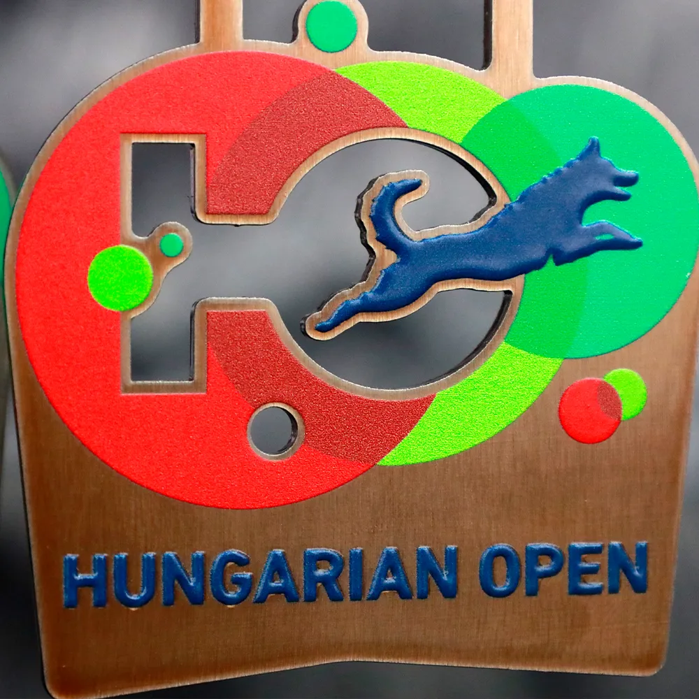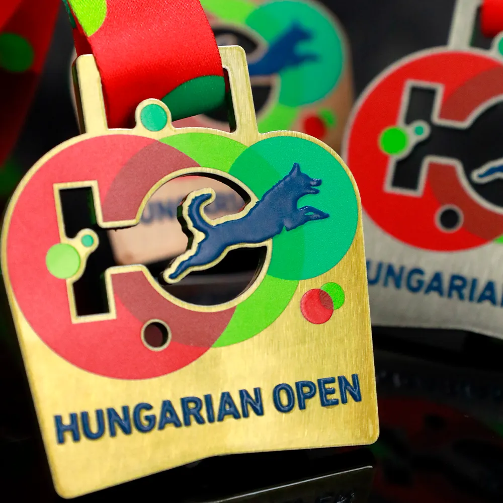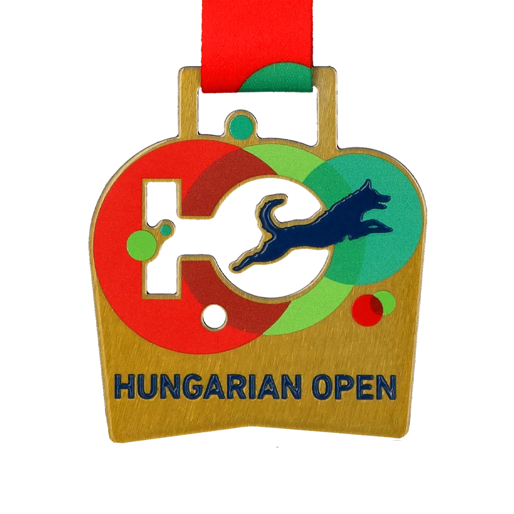 Una medaglia su misura per il DogFlow Hungarian Open. La forma e i ritagli nella medaglia sono tagliati con precisione al laser. Le decorazioni sulla medaglia sono fatte con stampa UV.