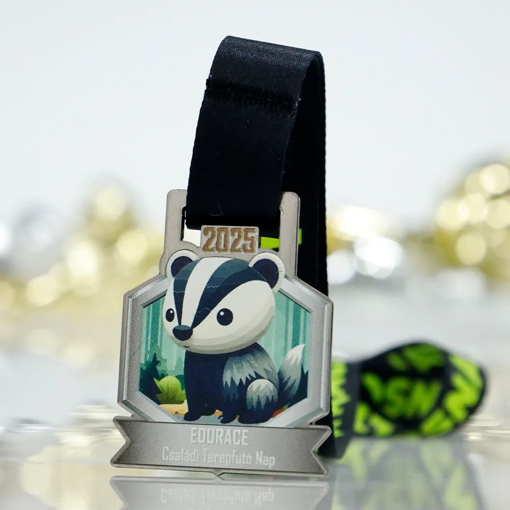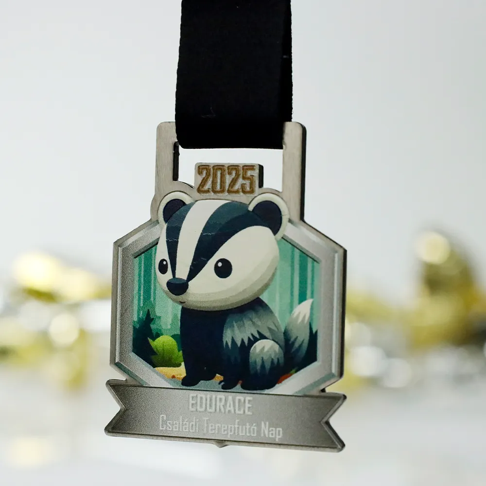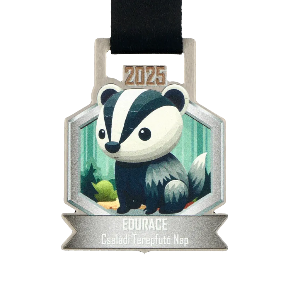 Medaglia personalizzata preparata per l'Edurace – Family Trail Running Day 2025. La forma della medaglia è stata tagliata al laser. Iscrizioni e grafiche, inclusa una figura di tasso contro uno sfondo forestale, sono state realizzate utilizzando la stampa UV. La medaglia è sospesa su un nastro nero.