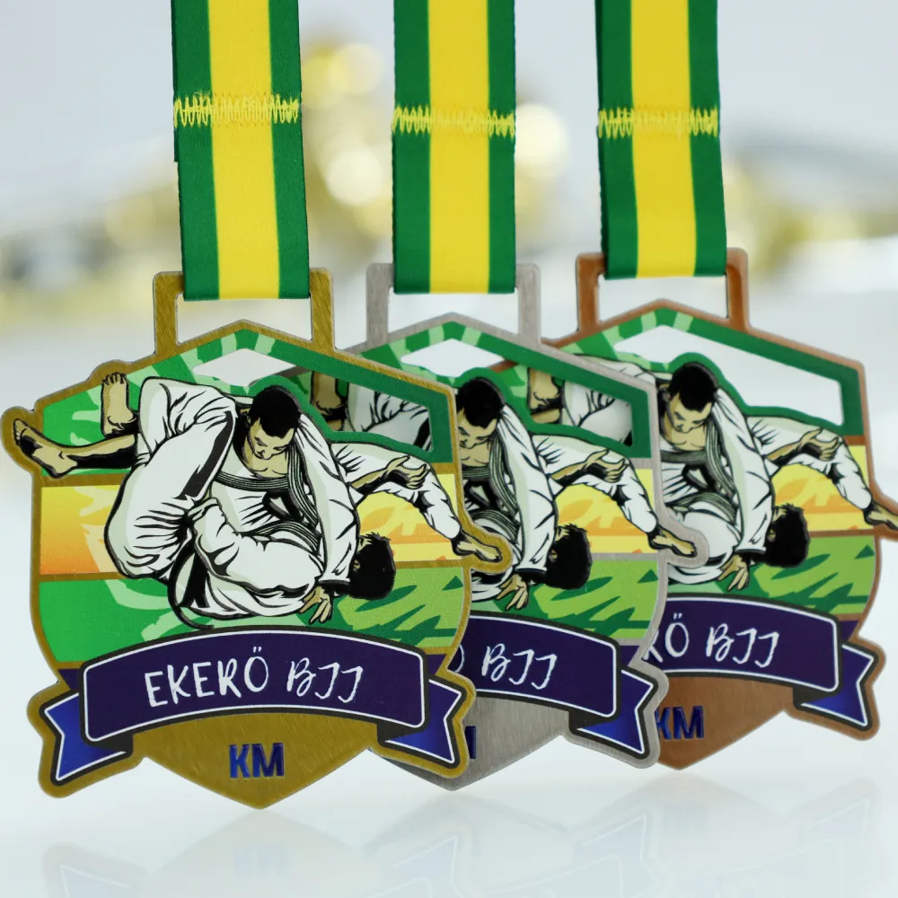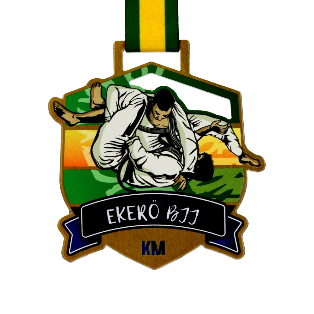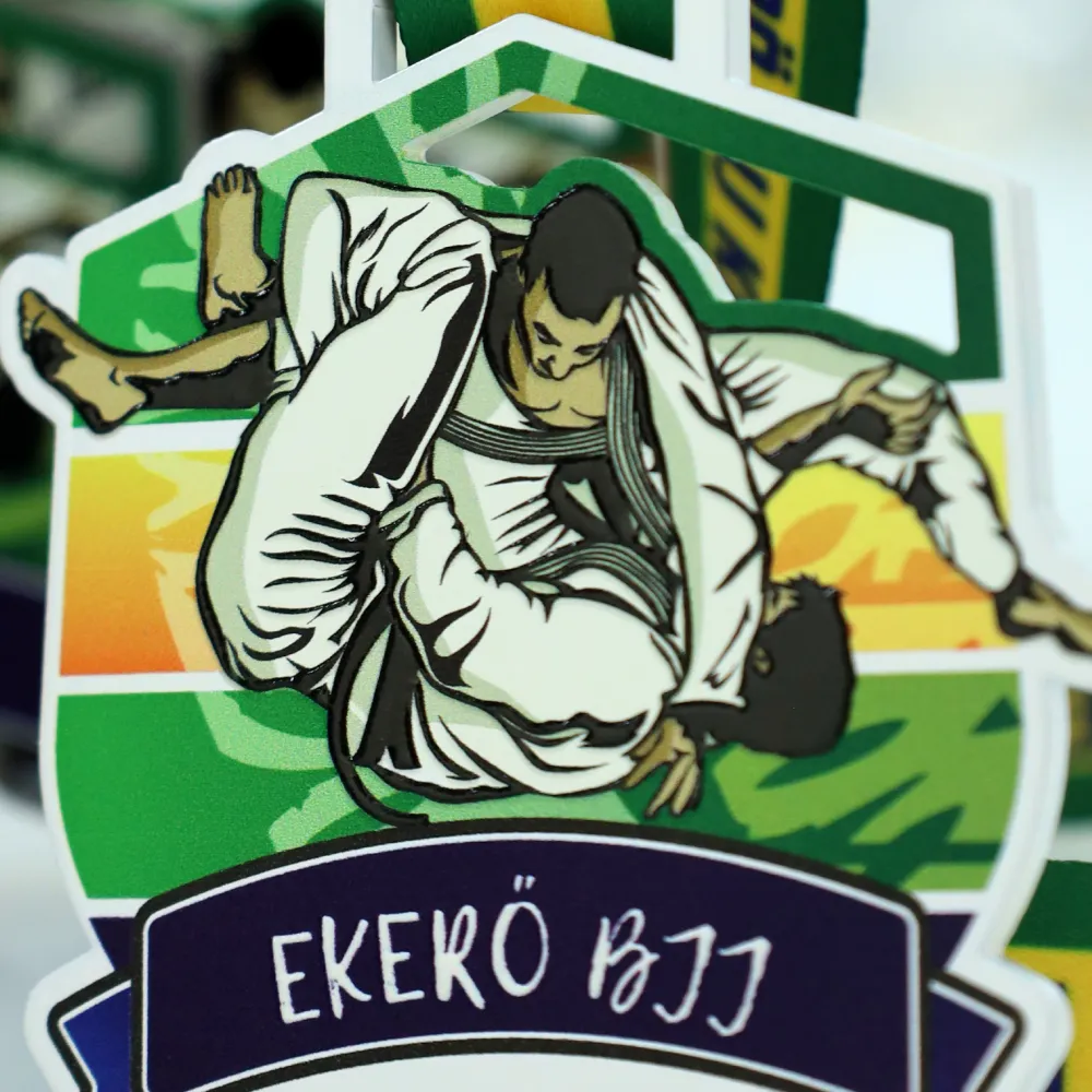Un' insolita medaglia sportiva creata per la competizione di Brazilian jiu-jitsu Ekerö BJJ. Realizzata in acciaio e ricoperta di stampa UV vivace che raffigura atleti a metà combattimento. La scena dinamica è ambientata su uno sfondo colorato vivacemente che ricorda un tramonto.