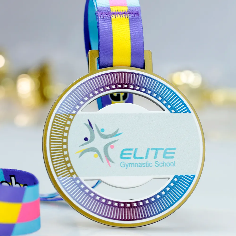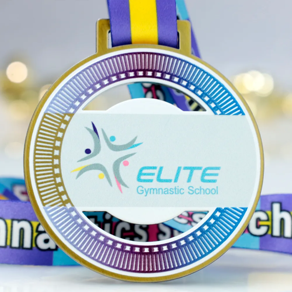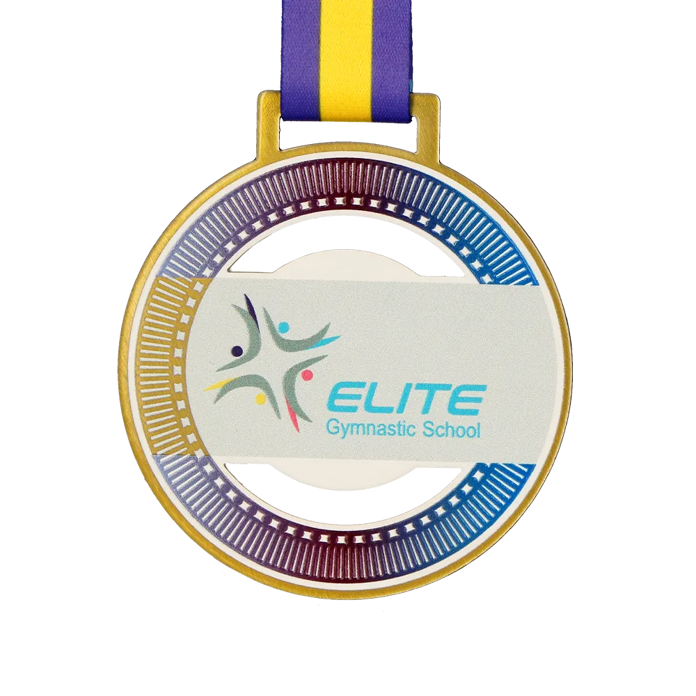 Una medaglia sportiva rotonda in metallo progettata per la Elite Gymnastic School. Il centro presenta il logo della scuola in colori pastello, circondato da un motivo dinamico nelle tonalità di blu e viola. La finitura dorata aggiunge un tocco elegante. Appesa a un nastro giallo e viola che completa perfettamente il design, questa medaglia è ideale per competizioni di ginnastica ed eventi sportivi.