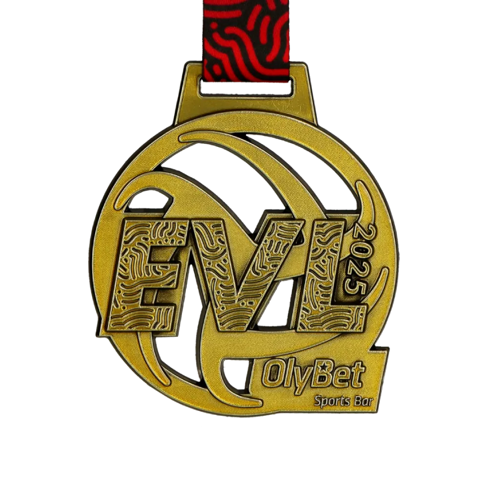 Medaglia su misura pressofusa creata appositamente per l'evento EVL 2025. Realizzata in un elegante colore oro con un evidente motivo in rilievo e un'elegante iscrizione "EVL 2025". Il logo dell'organizzatore è posizionato in basso. La medaglia su misura è completata da un nastro rosso e nero.