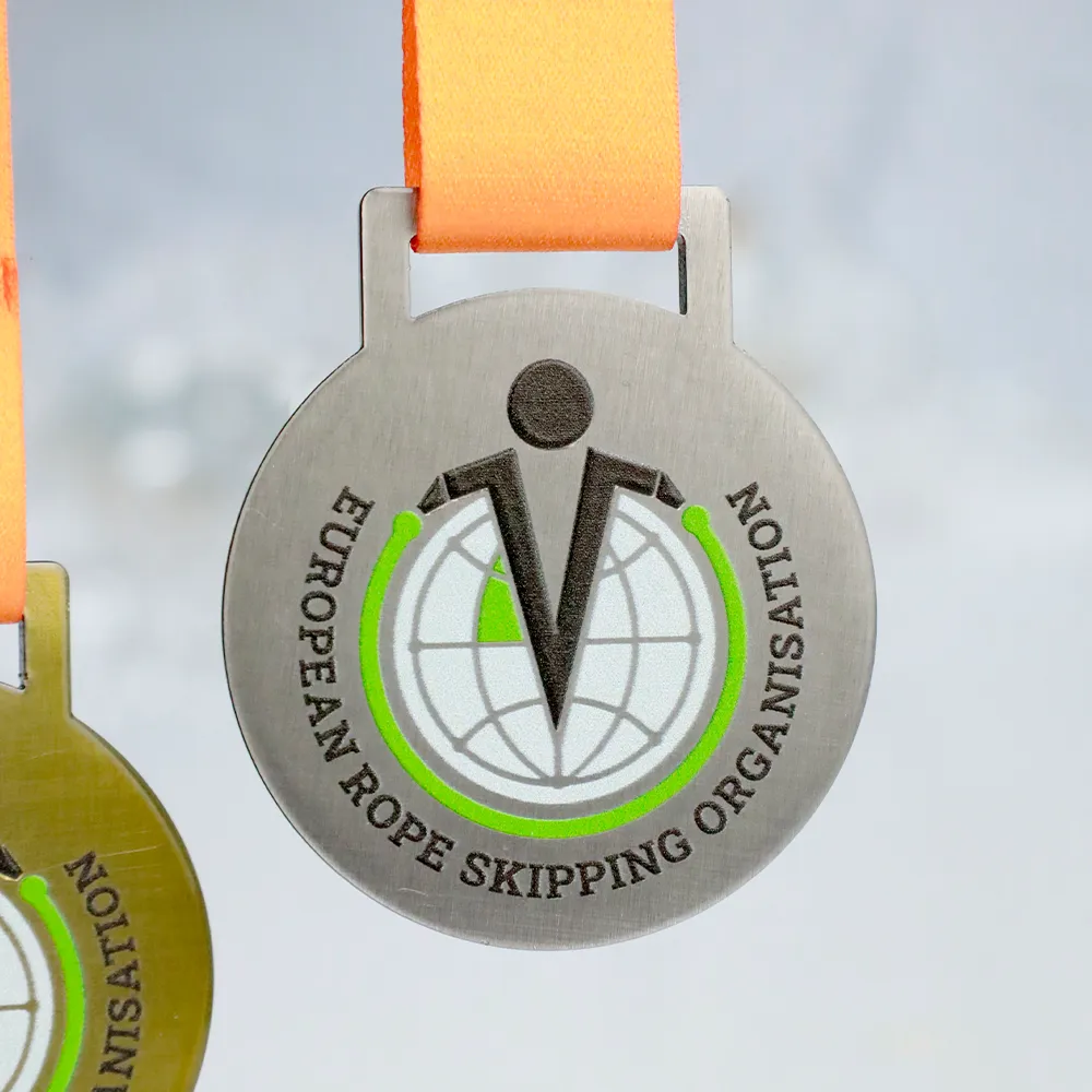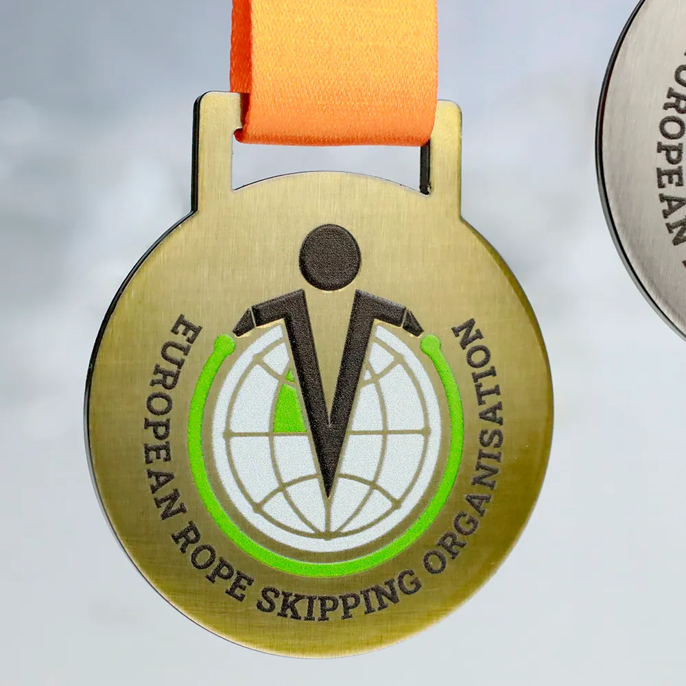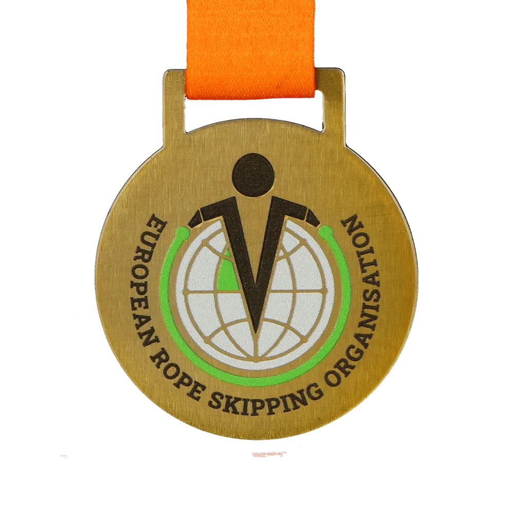 Medaglia personalizzata con il logo della European Rope Skipping Organisation impresso.