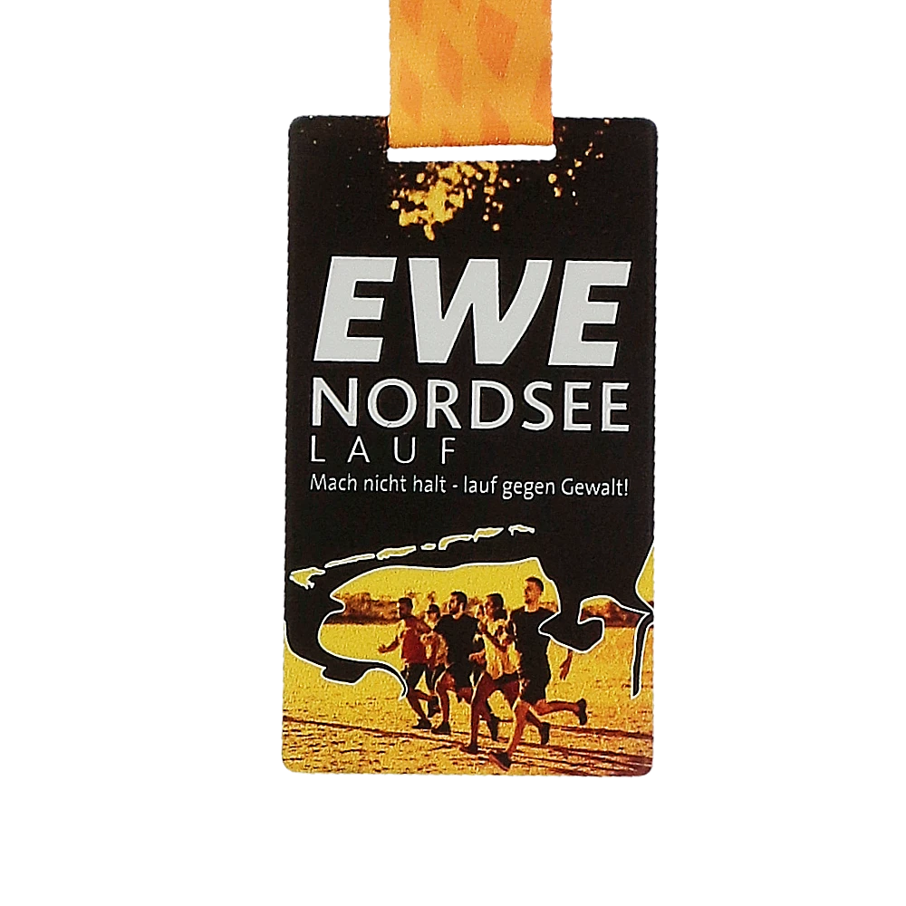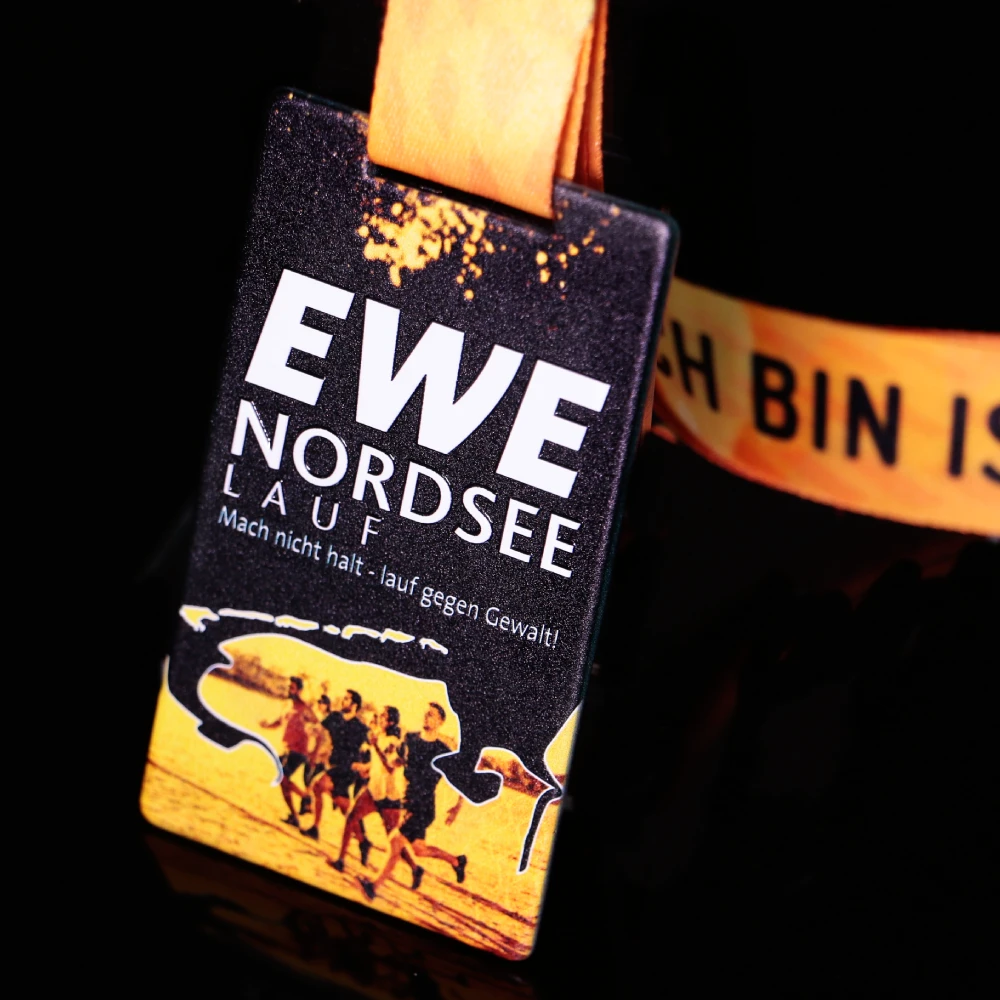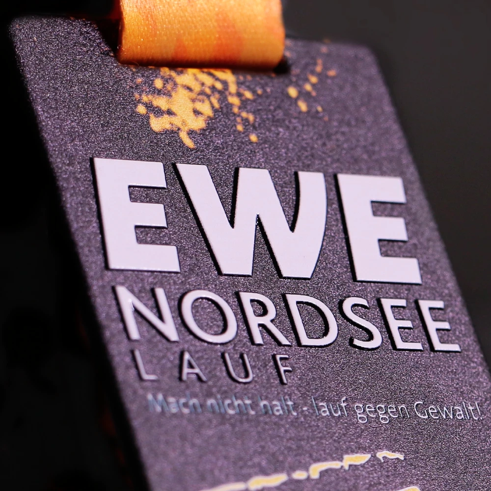 Le Medaglie da corsa non sono solo ricordi ma anche simboli dell’evento che attirano più partecipanti. Le nostre medaglie su misura per la Ewe Nordsee Run sono rettangolari e offrono ampio spazio per design dettagliati. I nostri designer hanno creato grafiche vivaci di corridori utilizzando stampe colorate aggiungendo distinzione e fascino. Nastri personalizzati con il nome dell’evento completano il look.