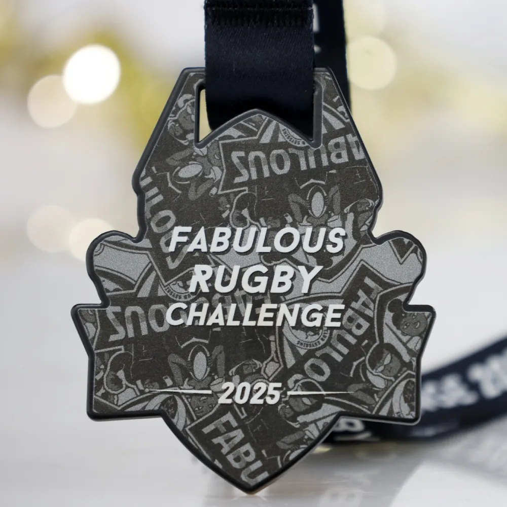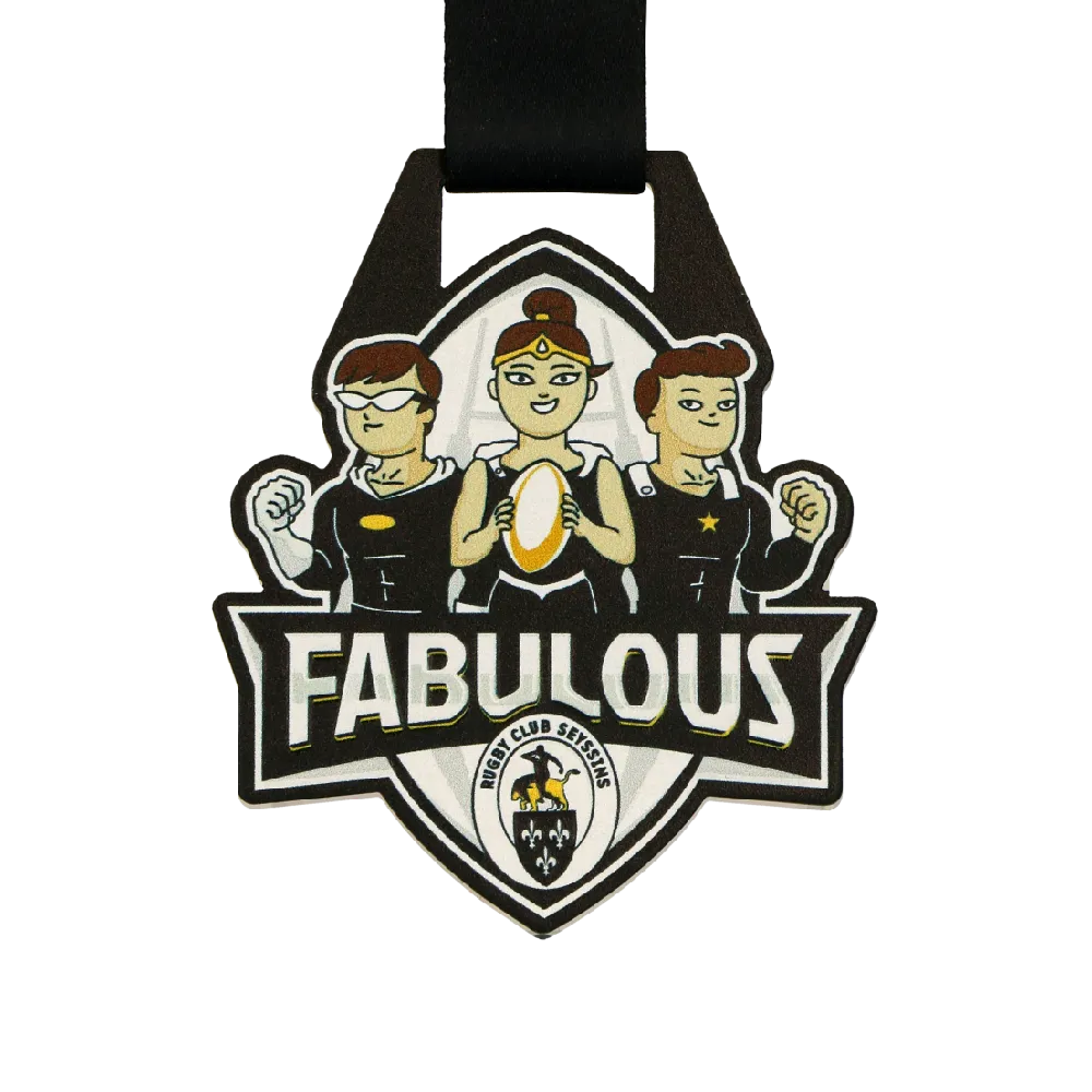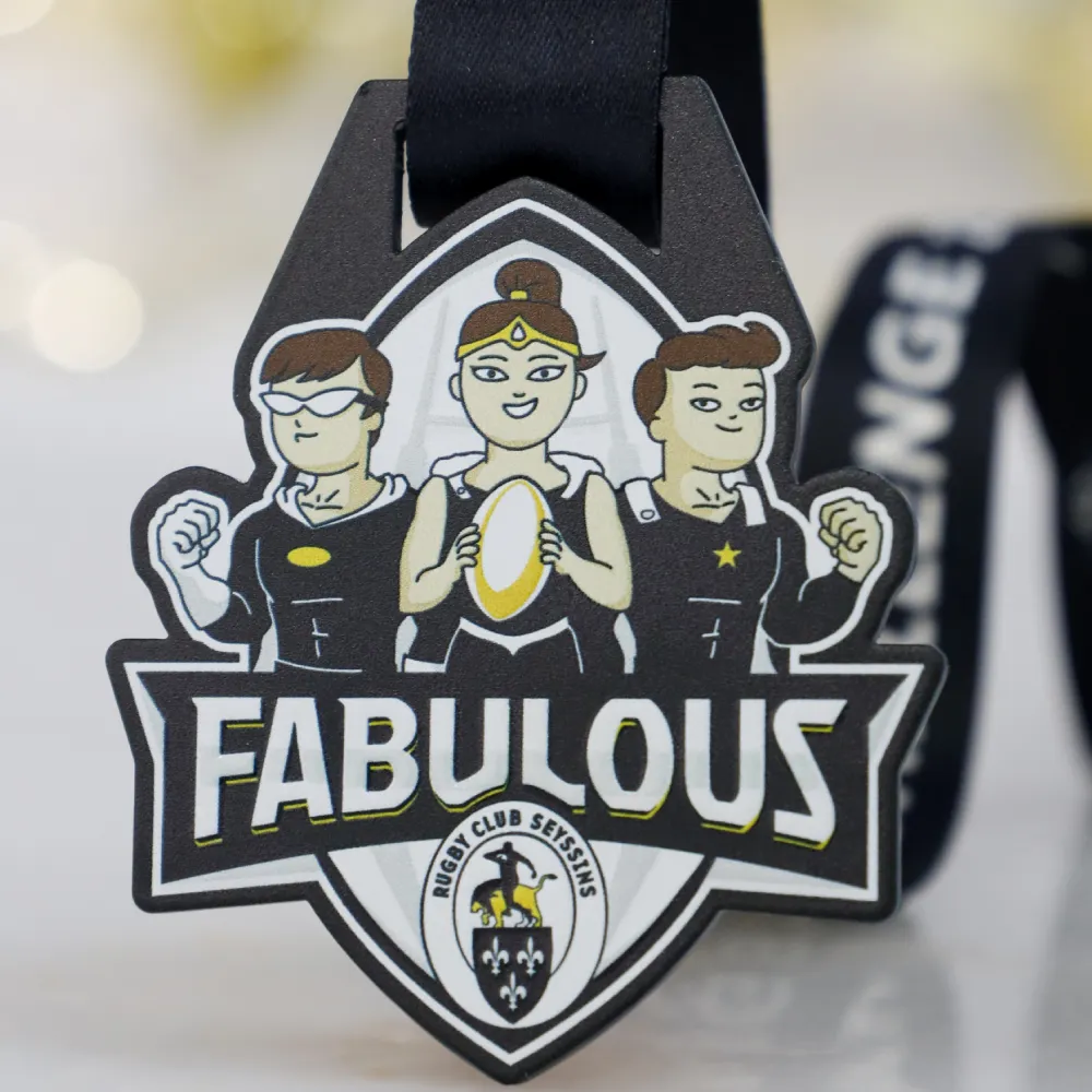 Una medaglia personalizzata – realizzata in acciaio, solida ed elegante, creata appositamente per il Rugby Club Seyssins. La medaglia si distingue per i suoi colori nero, bianco e giallo e i motivi grafici dinamici: tre figure di rugby con una palla, realizzate utilizzando la tecnologia di stampa UV durevole. La personalizzazione include un'iscrizione, un logo e un nome.