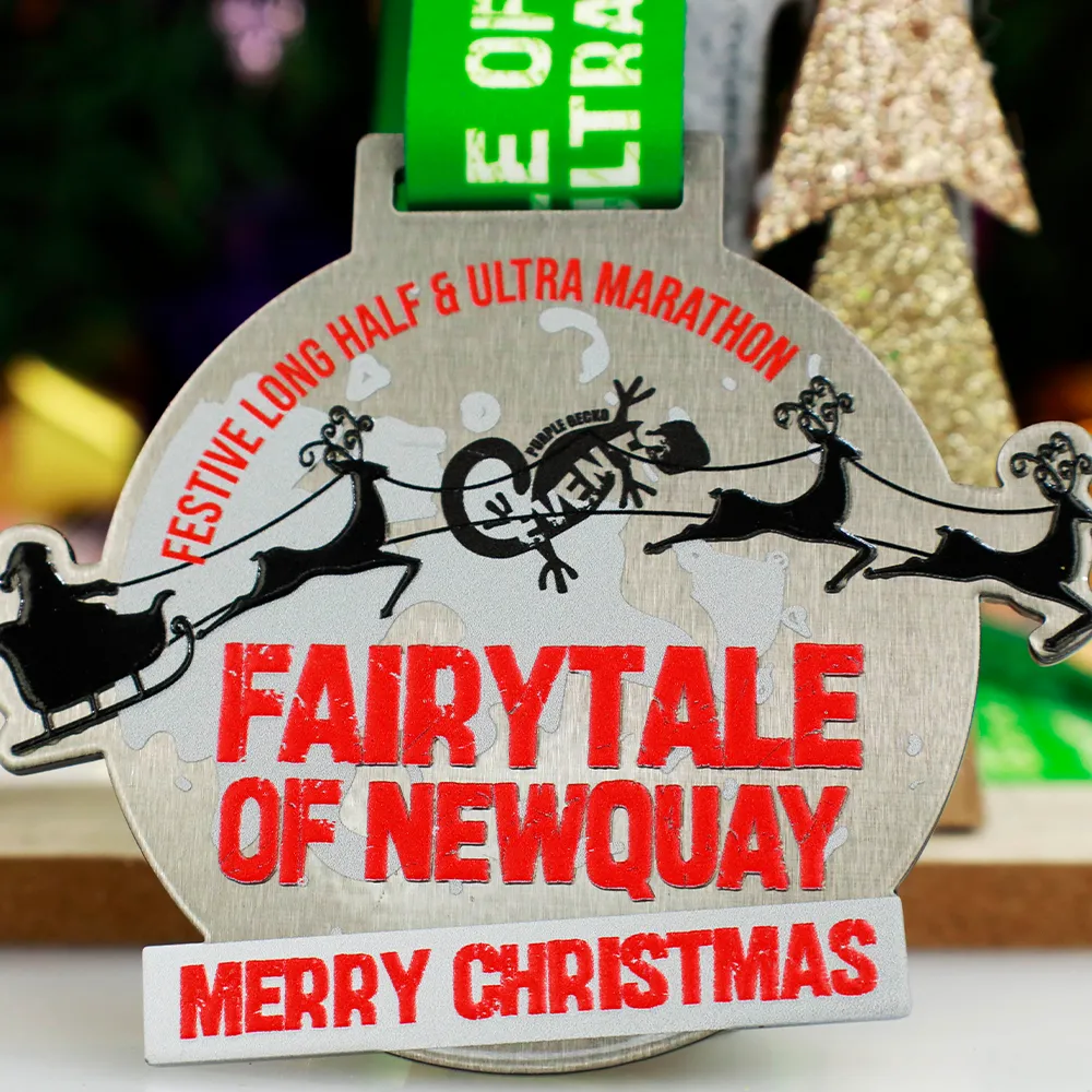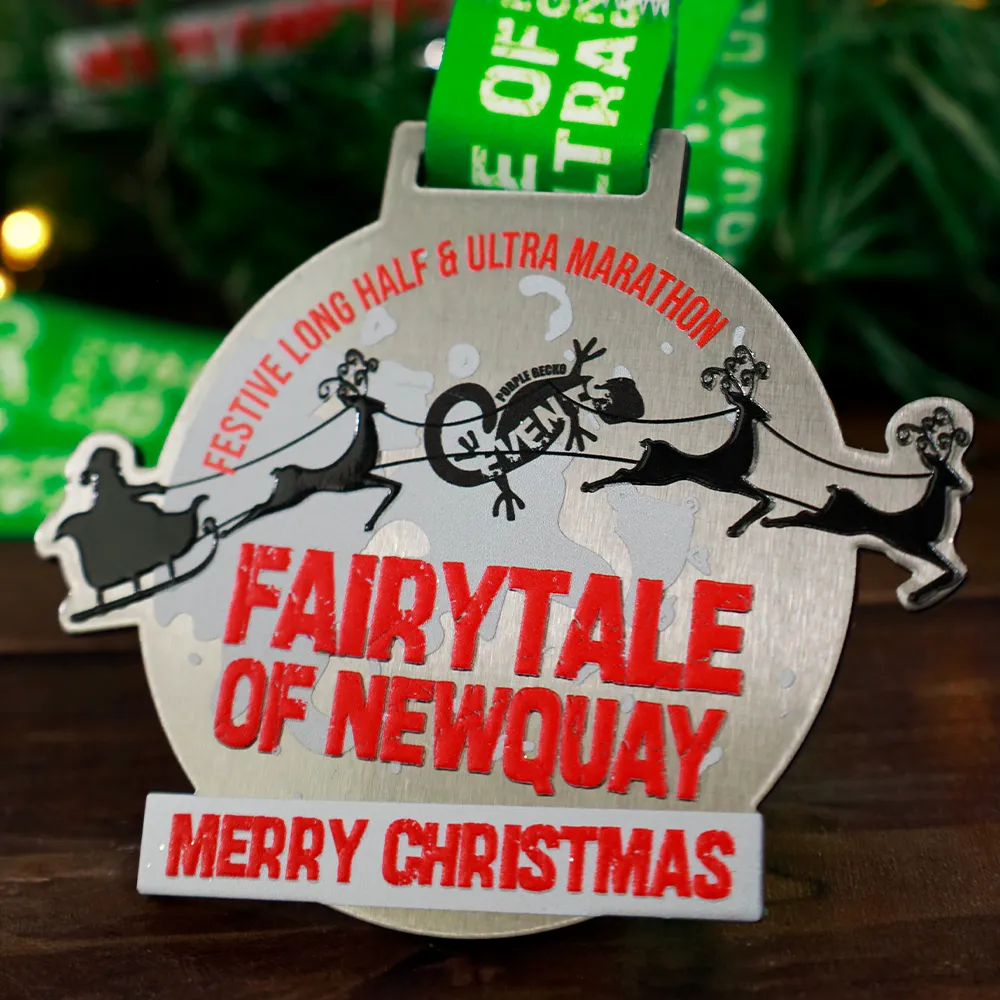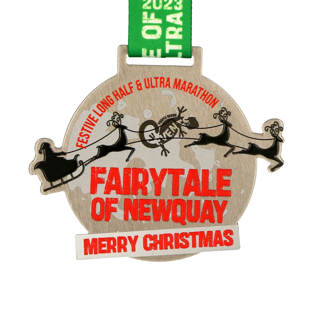 Medaglia da corsa realizzata per la corsa festiva Fairytale of Newquay. È una medaglia d'argento con decorazioni colorate a tema natalizio.