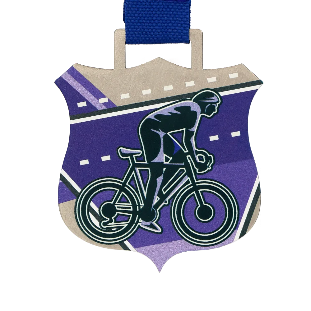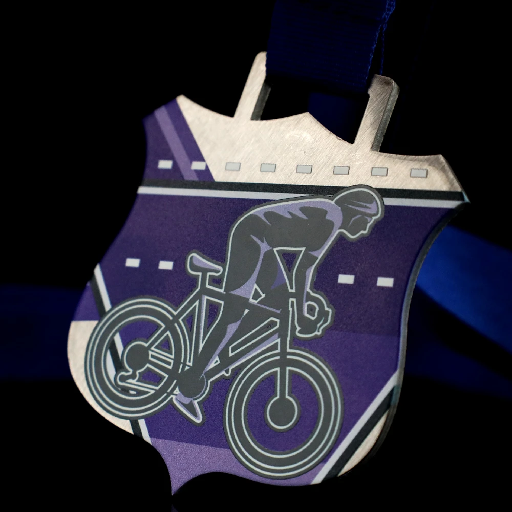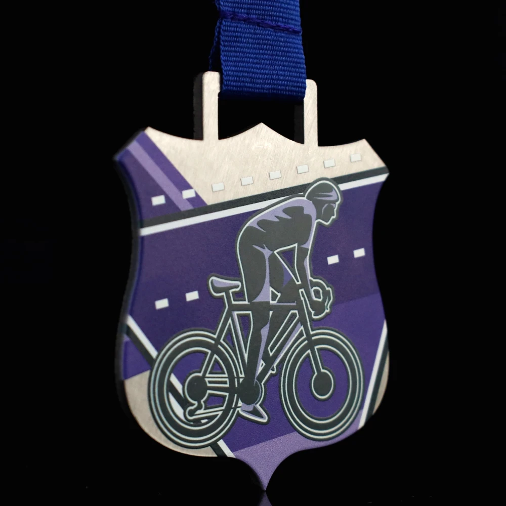 Medaglia in acciaio tagliata al laser e ricoperta con una stampa colorata con motivi ciclistici.
