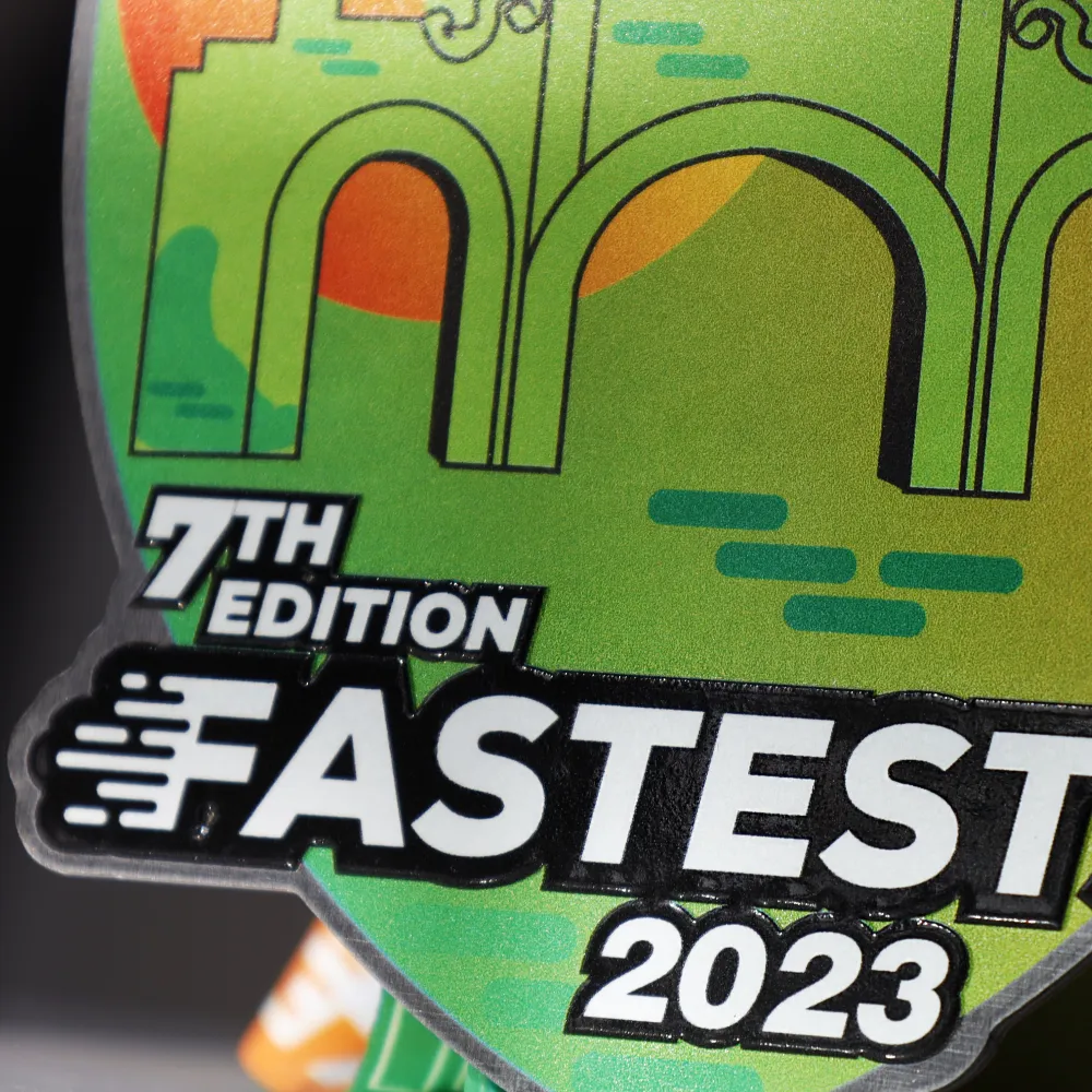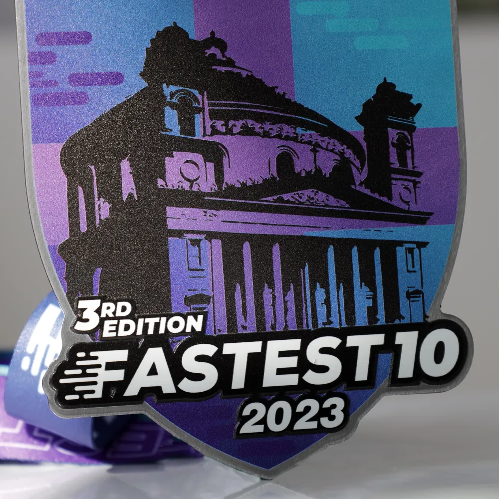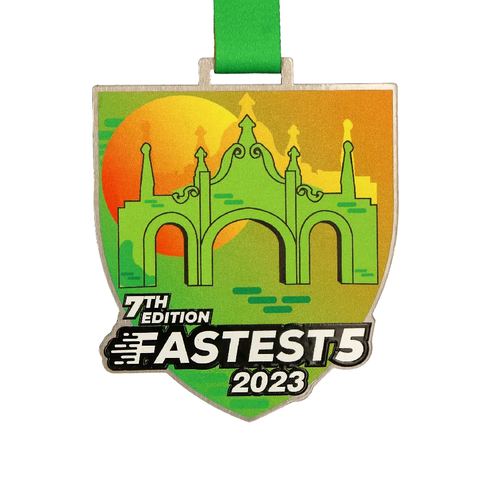 Le medaglie in acciaio stampato Fastest5 sono l’essenza dell’unicità. La loro forma triangolare arrotondata è un allontanamento innovativo dalle forme tradizionali e la stampa bicolore—in tonalità di verde-giallo per la 7ª edizione di Fastest5 e viola-blu per la 3ª edizione di Fastest10—aggiunge loro energia dinamica. Ognuna è stata accuratamente progettata con attenzione ai dettagli. La superficie della medaglia da corsa mostra il nome dell’evento e sopra di esso c’è una grafica replicata con precisione. La loro combinazione di colori completa armoniosamente i nastri allegati creando un insieme coeso ed estetico.