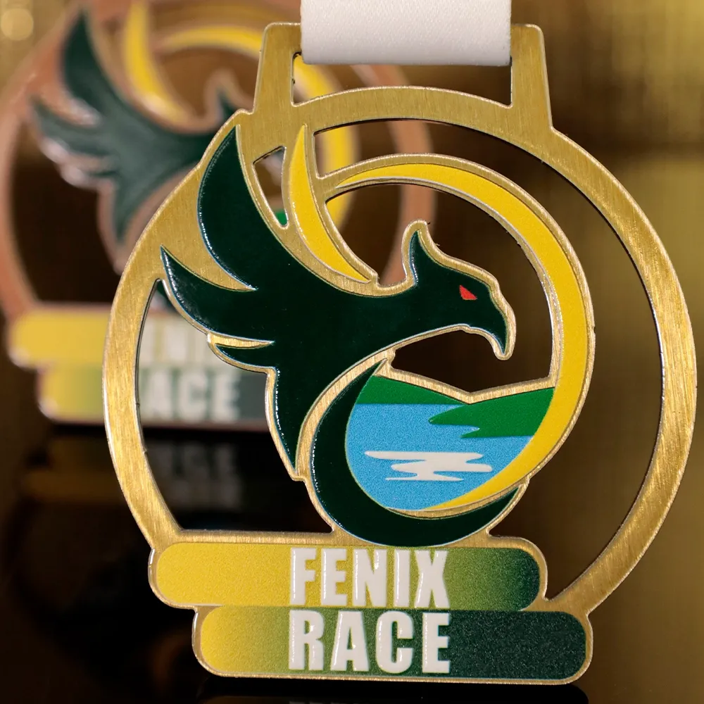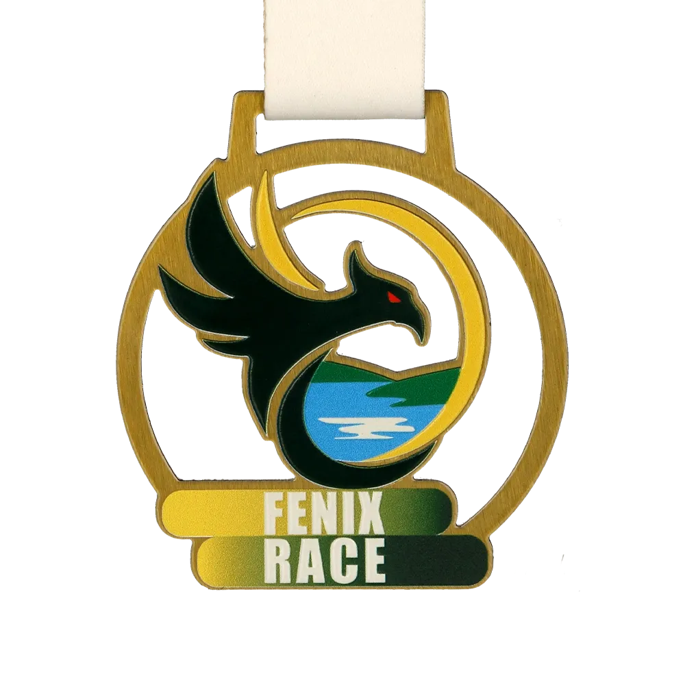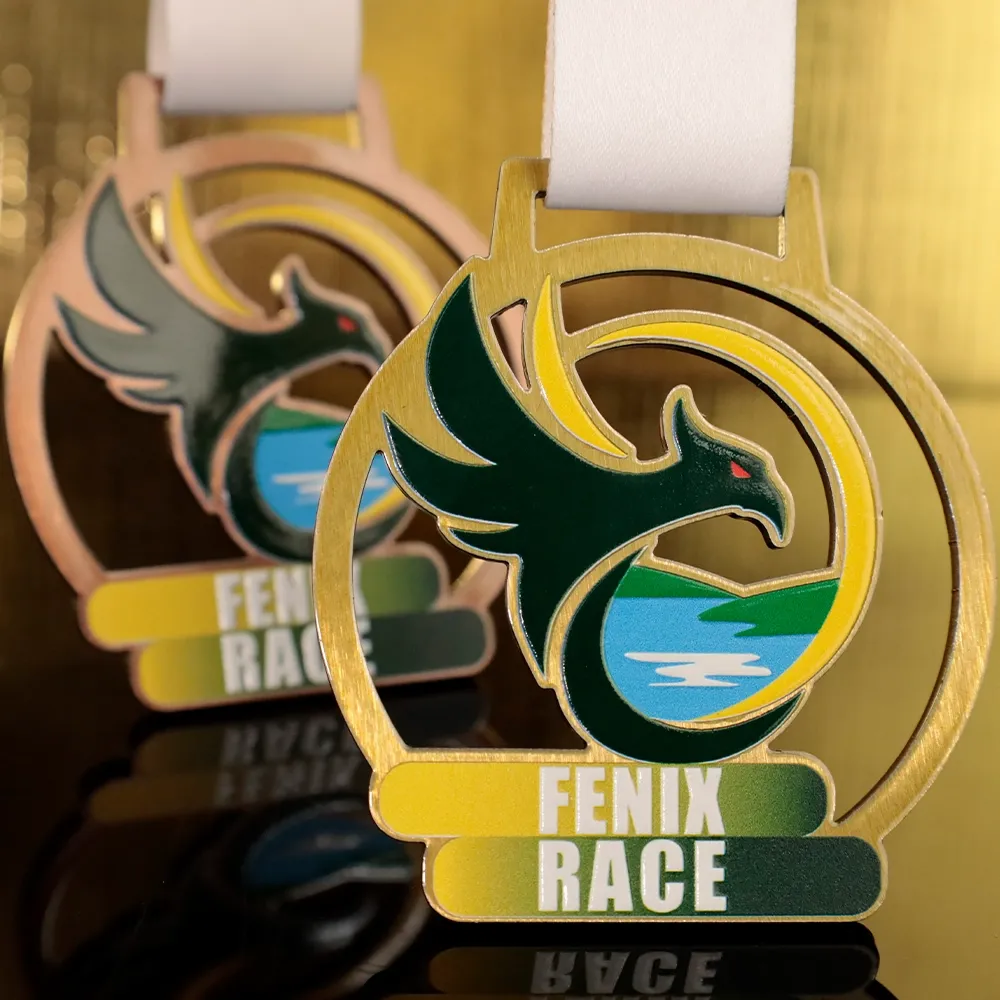 Una medaglia personalizzata creata da noi per la Fenix Race. La medaglia ha una forma moderna con elementi tagliati al laser. Abbiamo stampato una silhouette di una fenice con elementi artistici sulla medaglia.