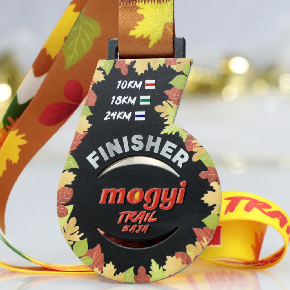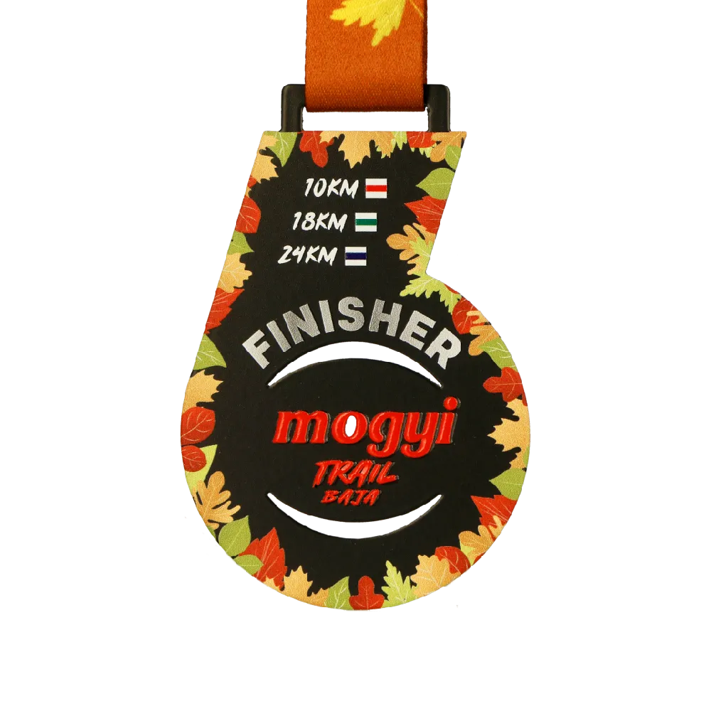 Una medaglia da corsa a forma del numero 6, progettata per l'evento Mogyi Trail Baja. Lo sfondo nero è decorato con foglie autunnali nelle tonalità di arancione, giallo e verde, riflettendo l'atmosfera stagionale. Il pezzo centrale include la parola 'Finisher' e il logo dell'evento in rosso. La medaglia elenca anche le distanze di gara: 10 km, 18 km e 24 km.