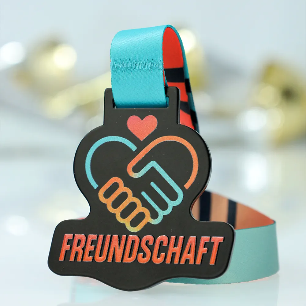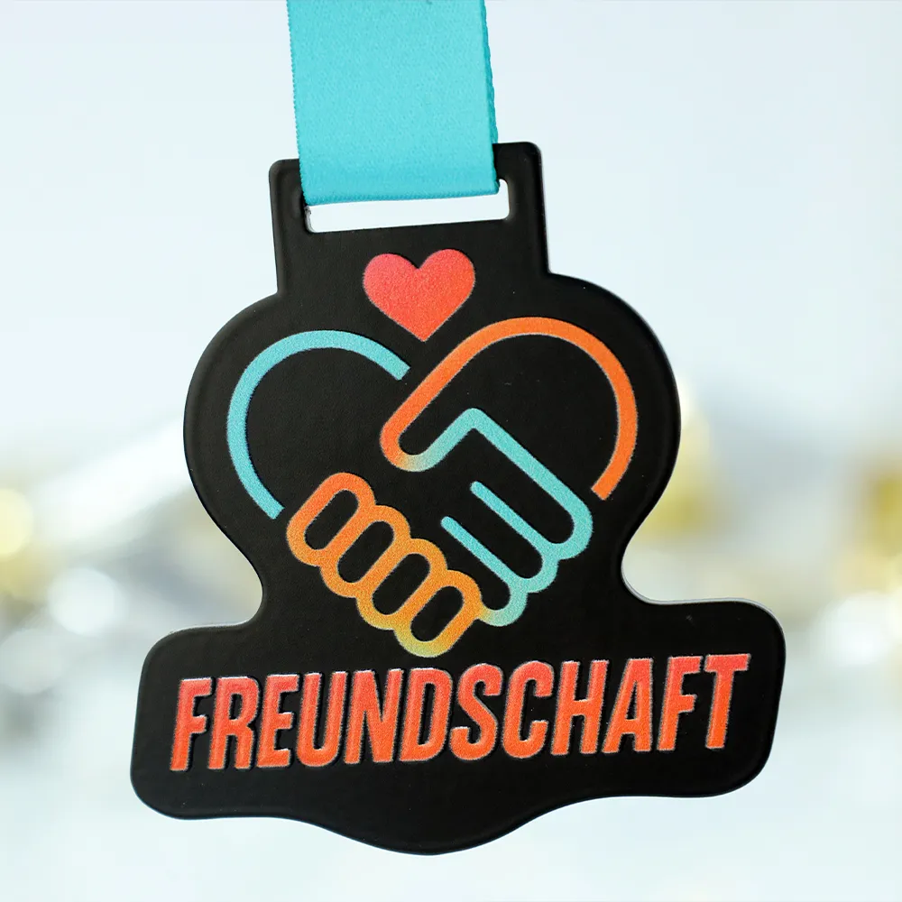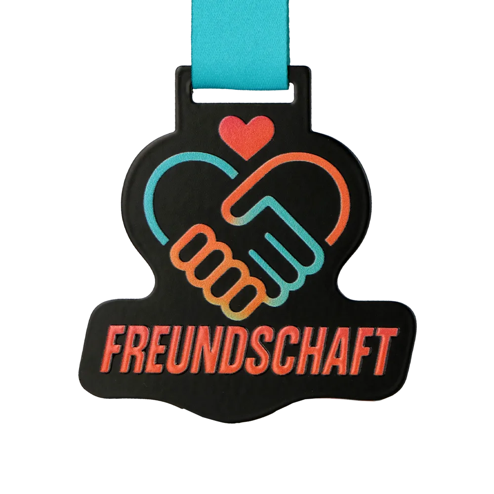 Questa impressionante medaglia su misura, realizzata per l'iniziativa Freundschaft Medaille, esemplifica un approccio moderno alla decorazione delle medaglie. La base consiste in metallo tagliato con precisione in un colore nero profondo, fornendo un eccellente contrasto per le grafiche applicate tramite stampa UV. Grazie all'uso di materiali di alta qualità, sia la forma irregolare della medaglia che le scritte distinte sono resistenti all'abrasione, mantenendo il loro aspetto nuovo di fabbrica per anni.