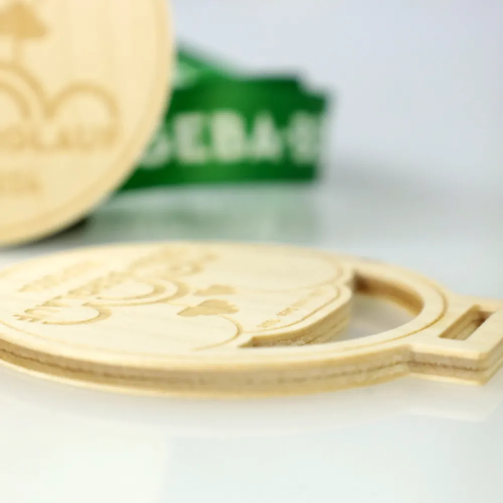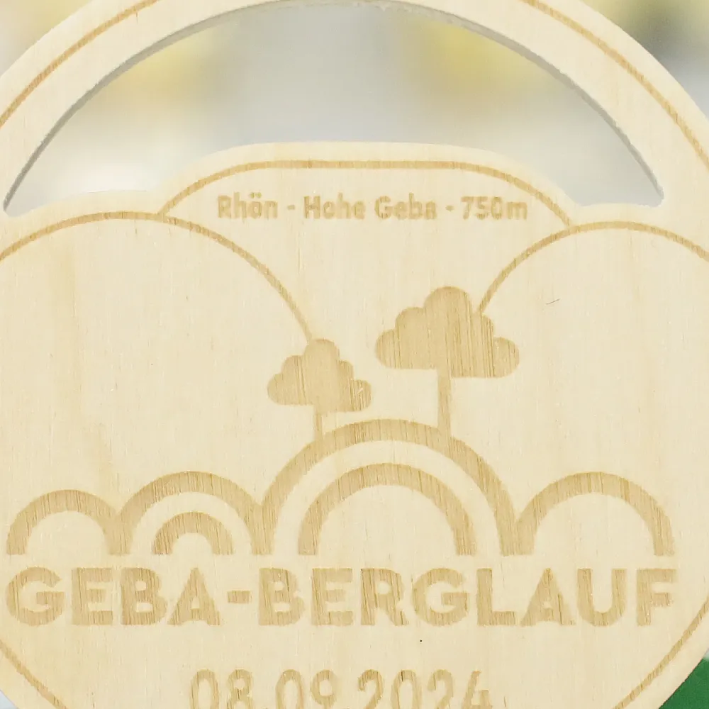 Medaglia in legno tagliata al laser, progettata per la gara di montagna GEBA-BERGLAUF. Realizzata in compensato, caratterizzata da un'incisione precisa raffigurante un paesaggio montano e il nome dell'evento. Il colore naturale del legno esalta il carattere ecologico della medaglia. Sospesa su un nastro verde, in armonia con il tema ispirato alla natura.