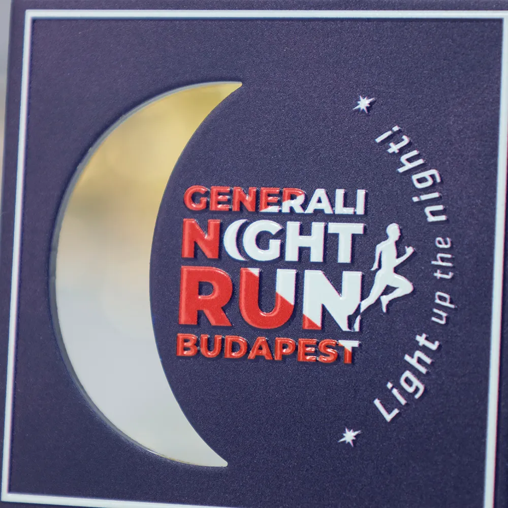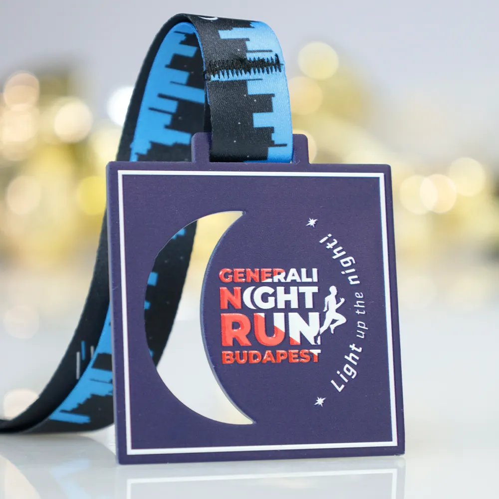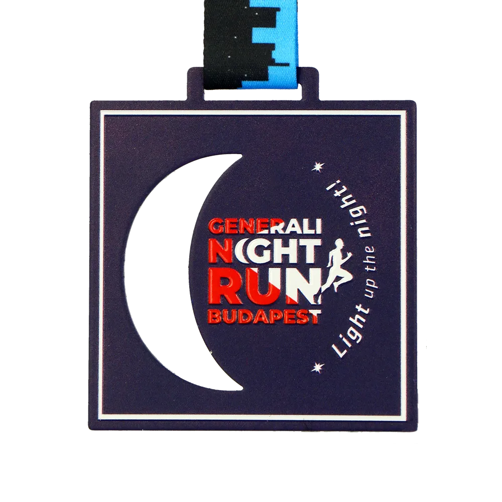 Una medaglia personalizzata progettata per la Generali Night Run a Budapest. La forma quadrata e lo sfondo blu profondo riflettono il tema notturno dell'evento. Il pezzo centrale presenta il logo della gara in rosso e bianco, accompagnato dal testo 'Light up the night!'. La medaglia è appesa a un nastro scuro con un motivo di paesaggio urbano, creando un design coeso.