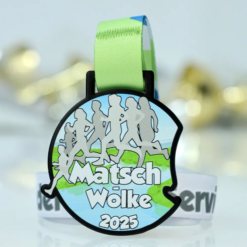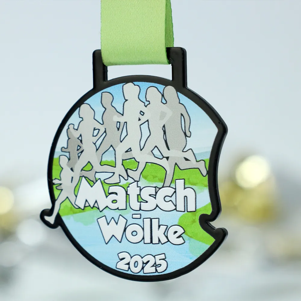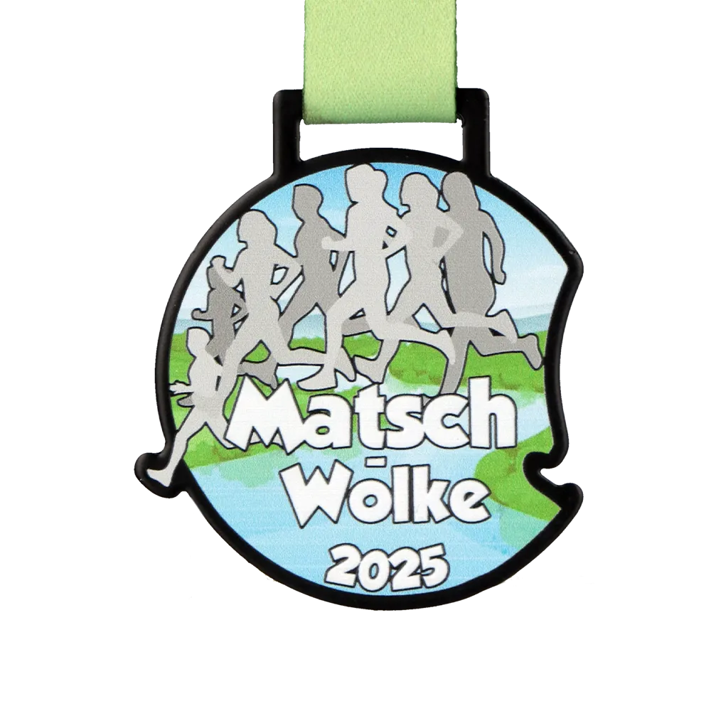 Questa robusta medaglia in acciaio stampato è un esempio di artigianato moderno, perfettamente adattato al carattere dell'evento Genthiner Matsch-Wolke. Il metallo resistente è stato tagliato con precisione in una forma irregolare e asimmetrica, e alla sua superficie è stato dato un rivestimento nero che incornicia elegantemente le grafiche. Grazie alla tecnologia di stampa UV, le sagome grigie dei corridori e lo sfondo verde-blu impressionano con la loro nitidezza, saturazione del colore e resistenza ai fattori esterni.