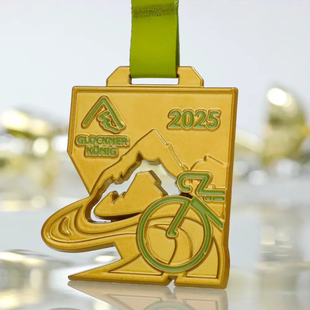Questa medaglia pressofusa è stata realizzata per la gara ciclistica Glocknerkönig 2025. Ha una forma geometrica personalizzata ed è fusa, poi verniciata a polvere in oro opaco. Il dritto evidenzia l'iconografia della gara di montagna: una silhouette di montagna, un fiume che scorre e un contorno di bicicletta in smalto verde. Destinata a un evento ciclistico, puoi vederne di più nelle nostre medaglie da ciclismo.