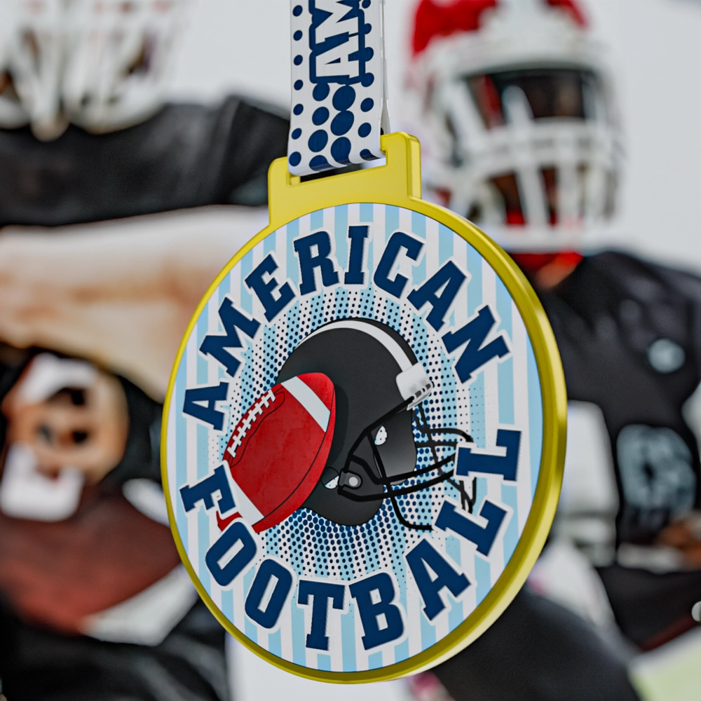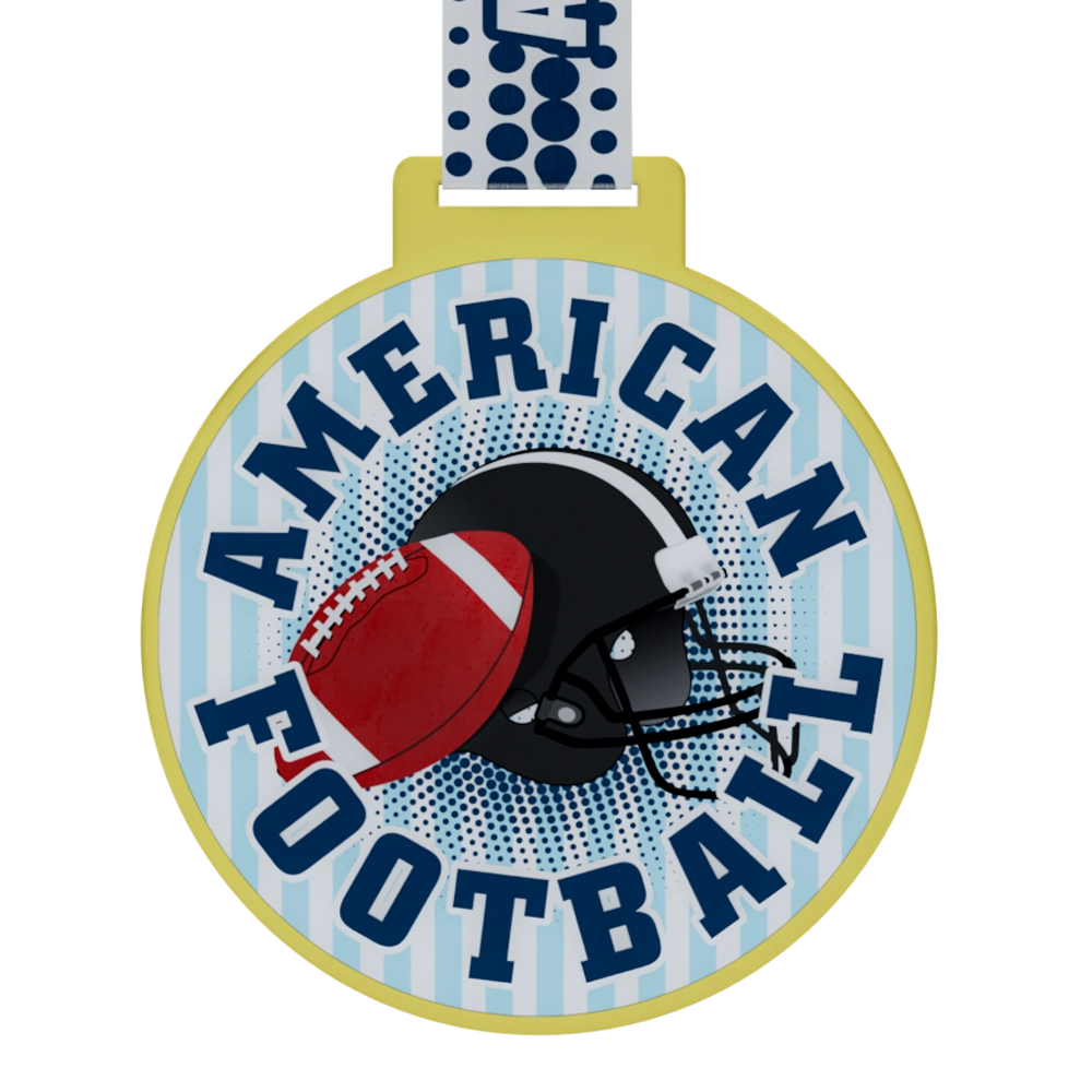 Il football americano è uno sport pieno di passione determinazione e rivalità. Ogni partita e incontro è una testimonianza di duro lavoro sforzo e spirito di squadra. Secondo la nostra azienda i premi dati ai giocatori dovrebbero riflettere questa passione e determinazione. Ecco perché Winmed ha creato uniche medaglie per il football americano. Sono in acciaio rotonde e ricoperte da stampe colorate con un motivo sportivo. Inoltre al centro di ogni medaglia c’è un pallone e un casco – simboli iconici di questo sport. L’iscrizione perfettamente replicata con il nome dello sport aggiunge unicità e prestigio alle nostre medaglie in acciaio stampato.