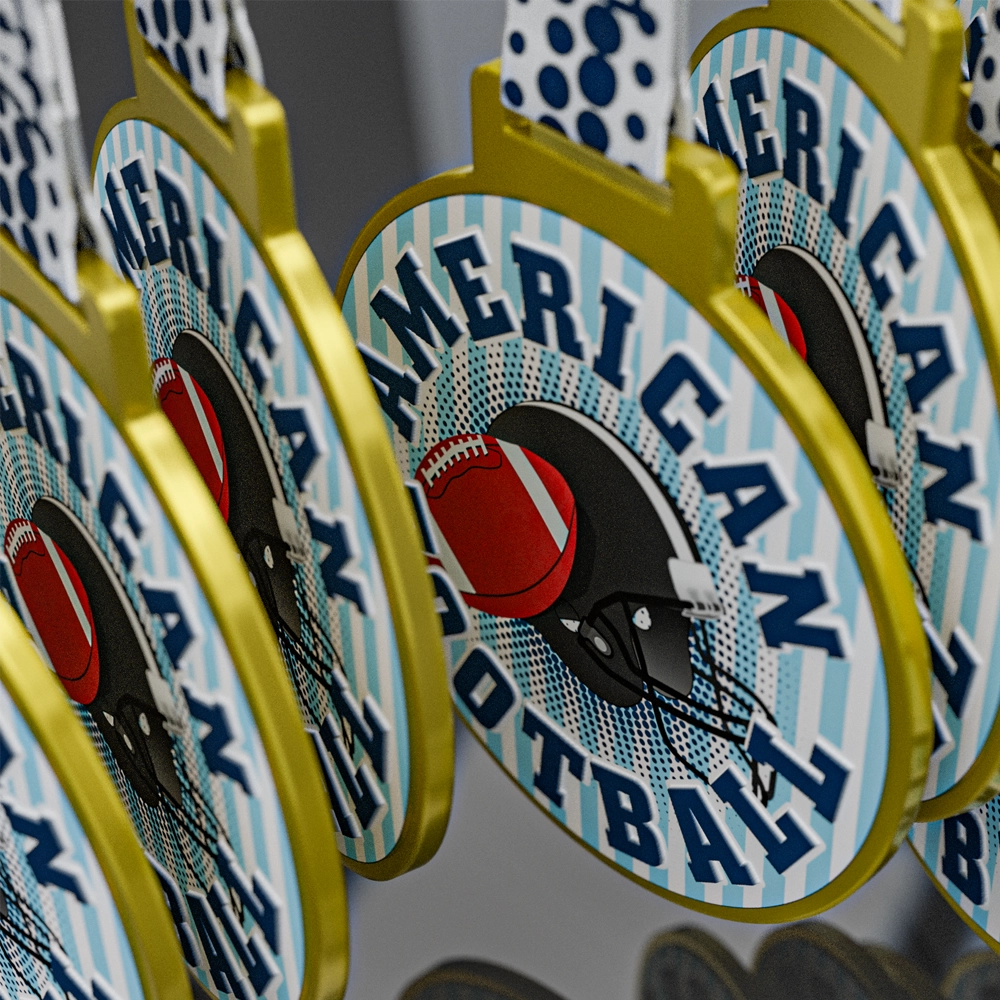 Medaglie rotonde in acciaio piene di decorazioni realizzate utilizzando la stampa colorata con un motivo di football americano.