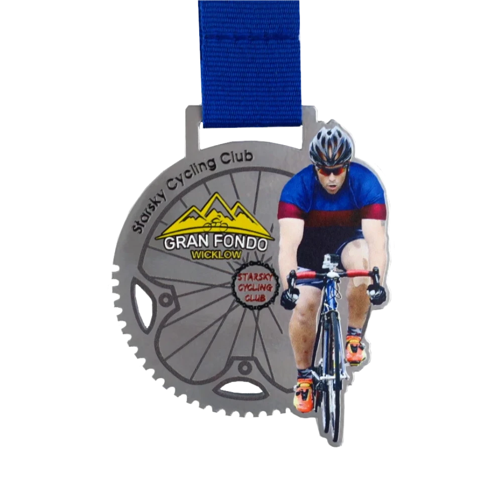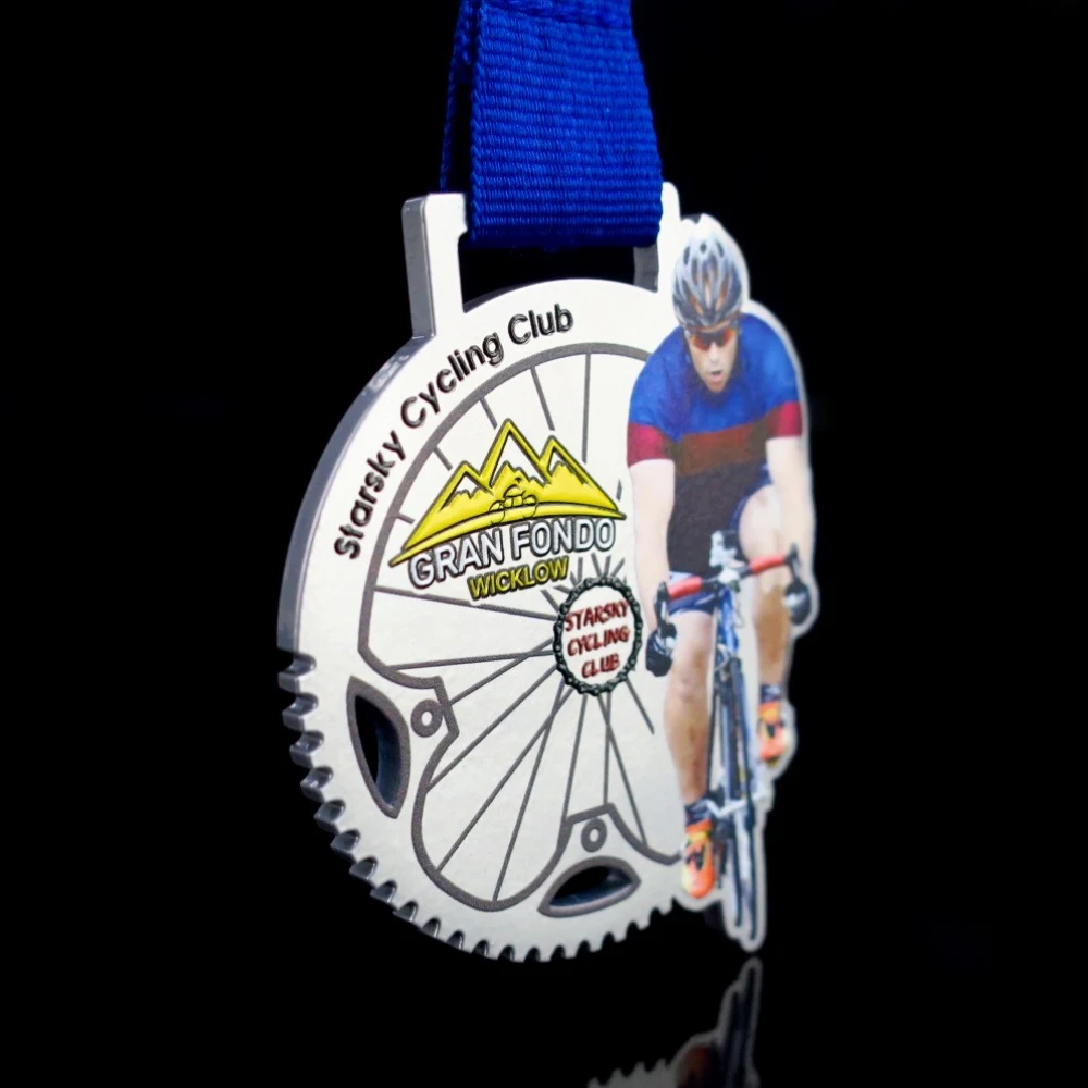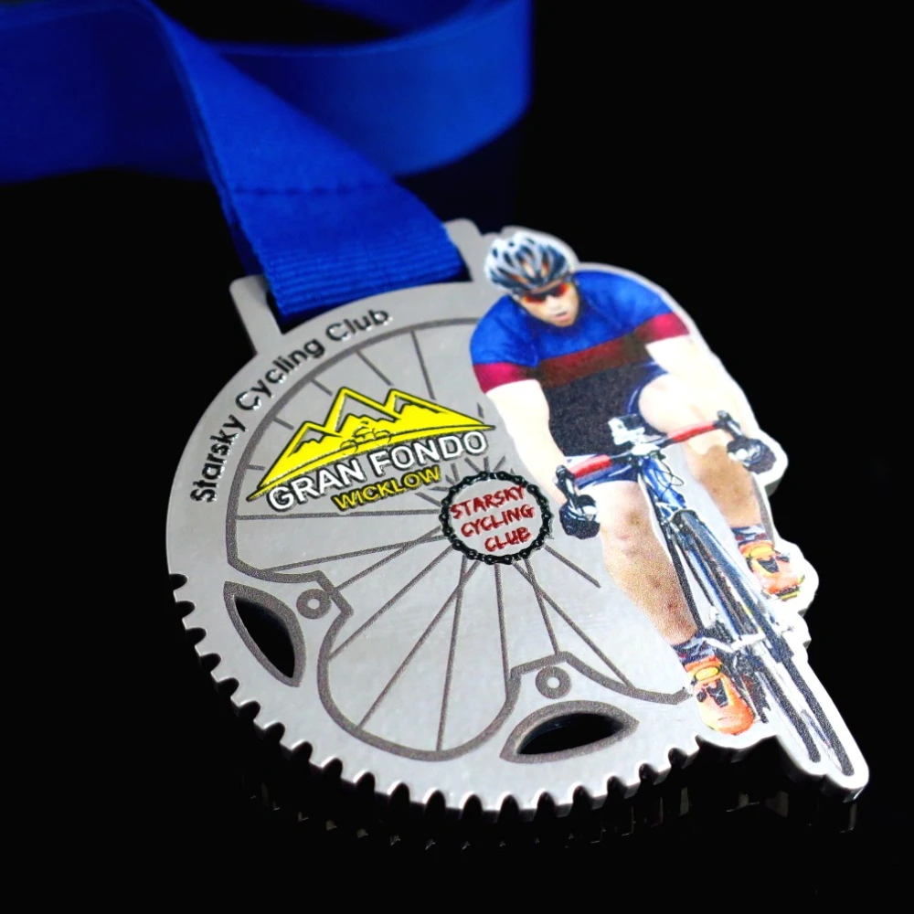 Per soddisfare le tendenze in continua evoluzione e le crescenti aspettative dei clienti, realizziamo medaglie utilizzando la tecnologia di taglio laser. La medaglia in acciaio progettata per l’evento Gran Fondo Wicklow è un esempio perfetto dell’uso di questa tecnologia. Questa medaglia si presenta in una forma accattivante con una varietà di componenti aggiuntivi come piccoli elementi traforati e un motivo a pignone nella parte inferiore. Inoltre, la figura del ciclista stampata a colori la rende perfettamente adatta all’atmosfera della gara ciclistica. Inoltre le nostre medaglie personalizzate catturano l’occhio grazie a uno speciale strato di vernice trasparente che aggiunge un tocco di eleganza.