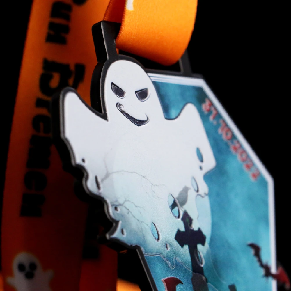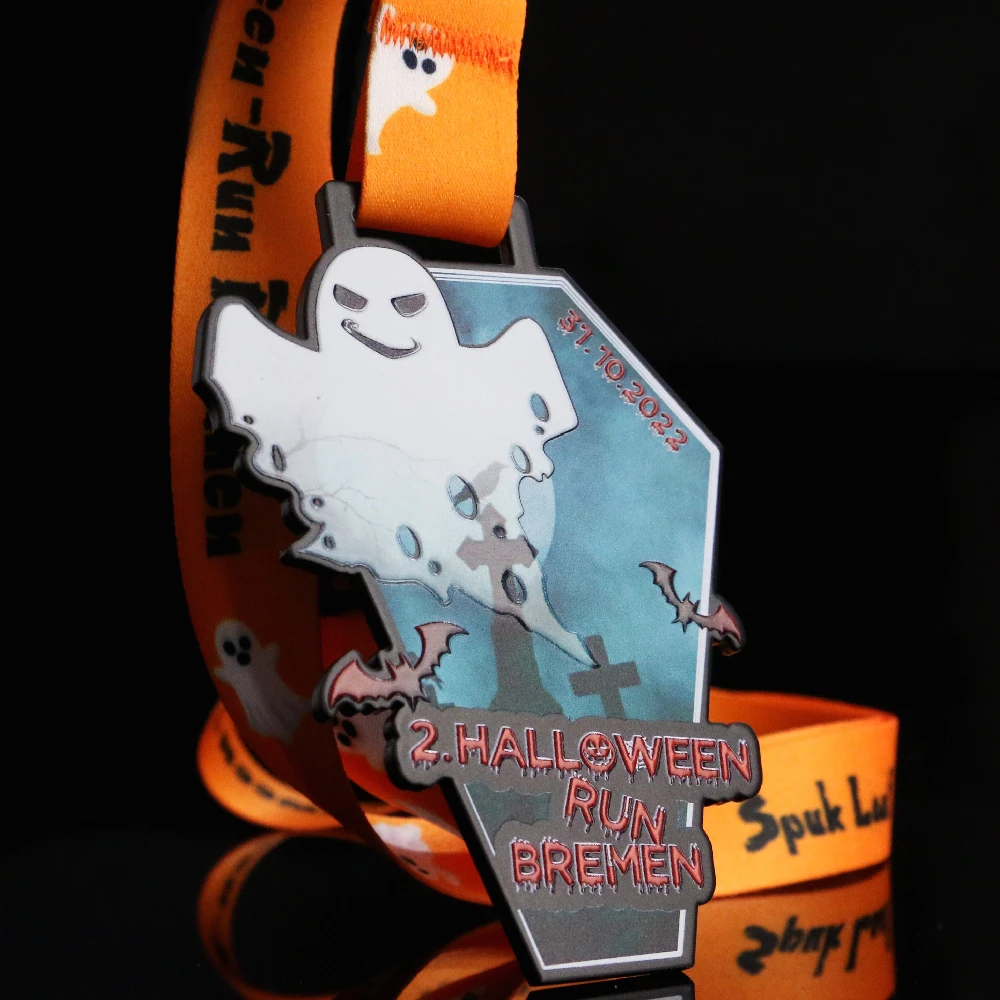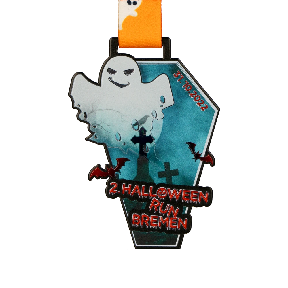 Sebbene la fine di ottobre non sia necessariamente favorevole alla corsa, folle di atleti hanno preso parte alla Halloween Run Bremen. La ragione di ciò è stata sia l’atmosfera insolita che le originali medaglie da corsa preparate dalla nostra azienda. Le medaglie in acciaio stampato realizzate da noi hanno un’originale forma a bara che si adatta perfettamente all’atmosfera di Halloween. Inoltre il loro colore base nero è un ottimo sfondo per una stampa colorata. I suoi colori e il design sono accattivanti. Le decorazioni più importanti sulla medaglia sono state sollevate ottenendo un effetto 3D. Il tutto è rivestito con una vernice incolore e coronato da un nastro personalizzato abbinato.